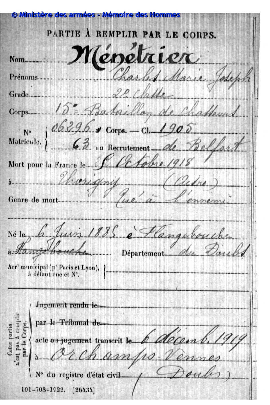 2ème classe MENETRIER Charles Marie Joseph 06.06.1885 - 05.10.1918 15ème Bataillon de chasseurs Gefallen in Hanmeau de Thorigny (F) |