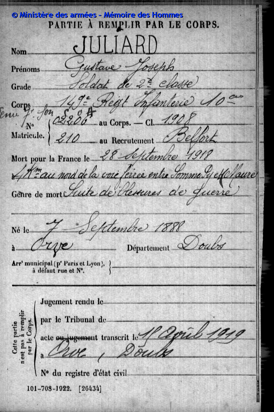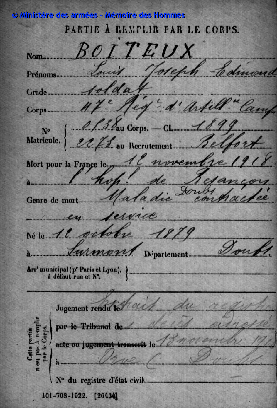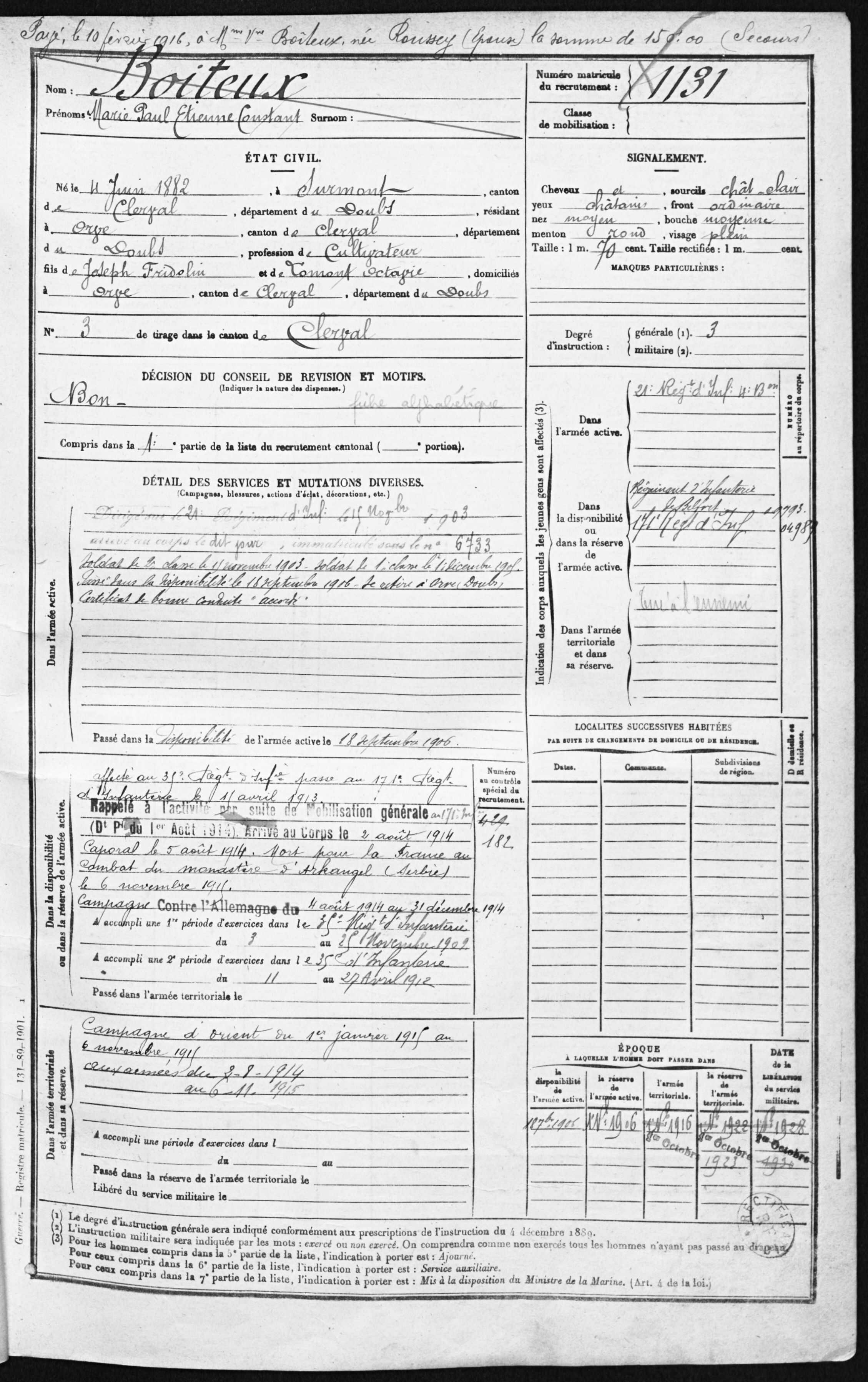 | Caporal BOITEUX Marie Paul Etienne Constant 04.06.1882 - 07.11.1915 371ème Régiment d'Infanterie Gefallen in Monastir (Serbien) |