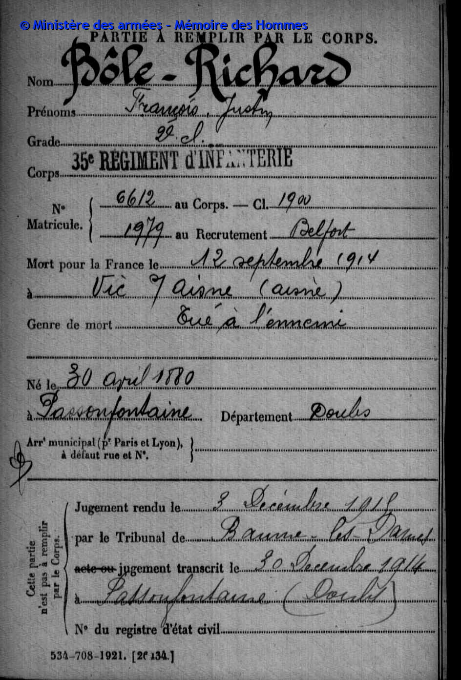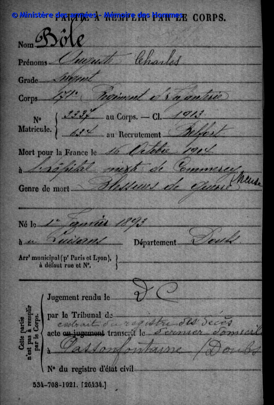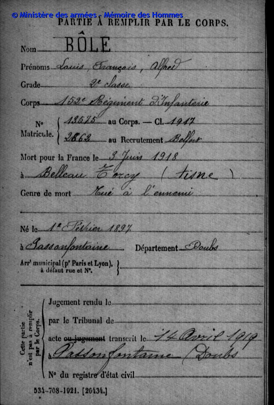 2ème classe BOLE Louis François Alfred 01.02.1897 - 03.06.1918 152ème Régiment d'Infanterie Gefallen in Belleau - Aisne (F) |