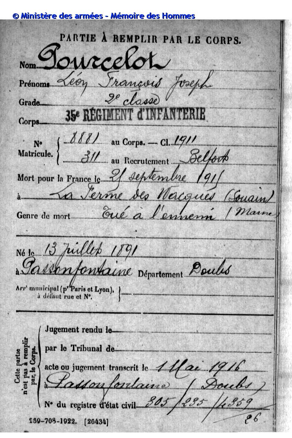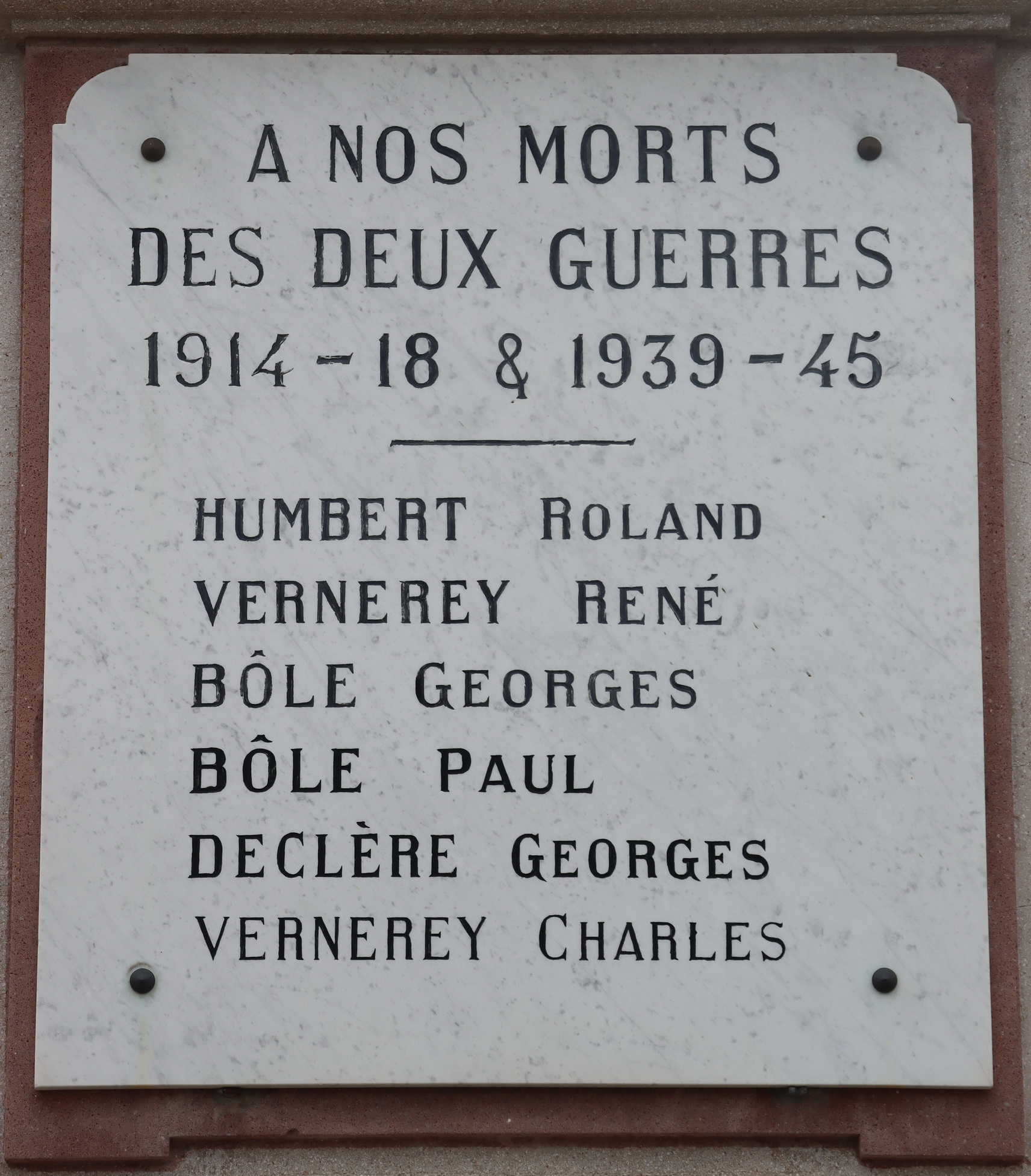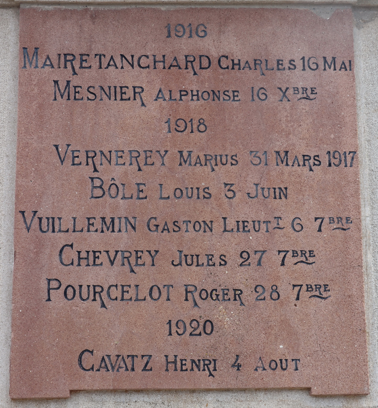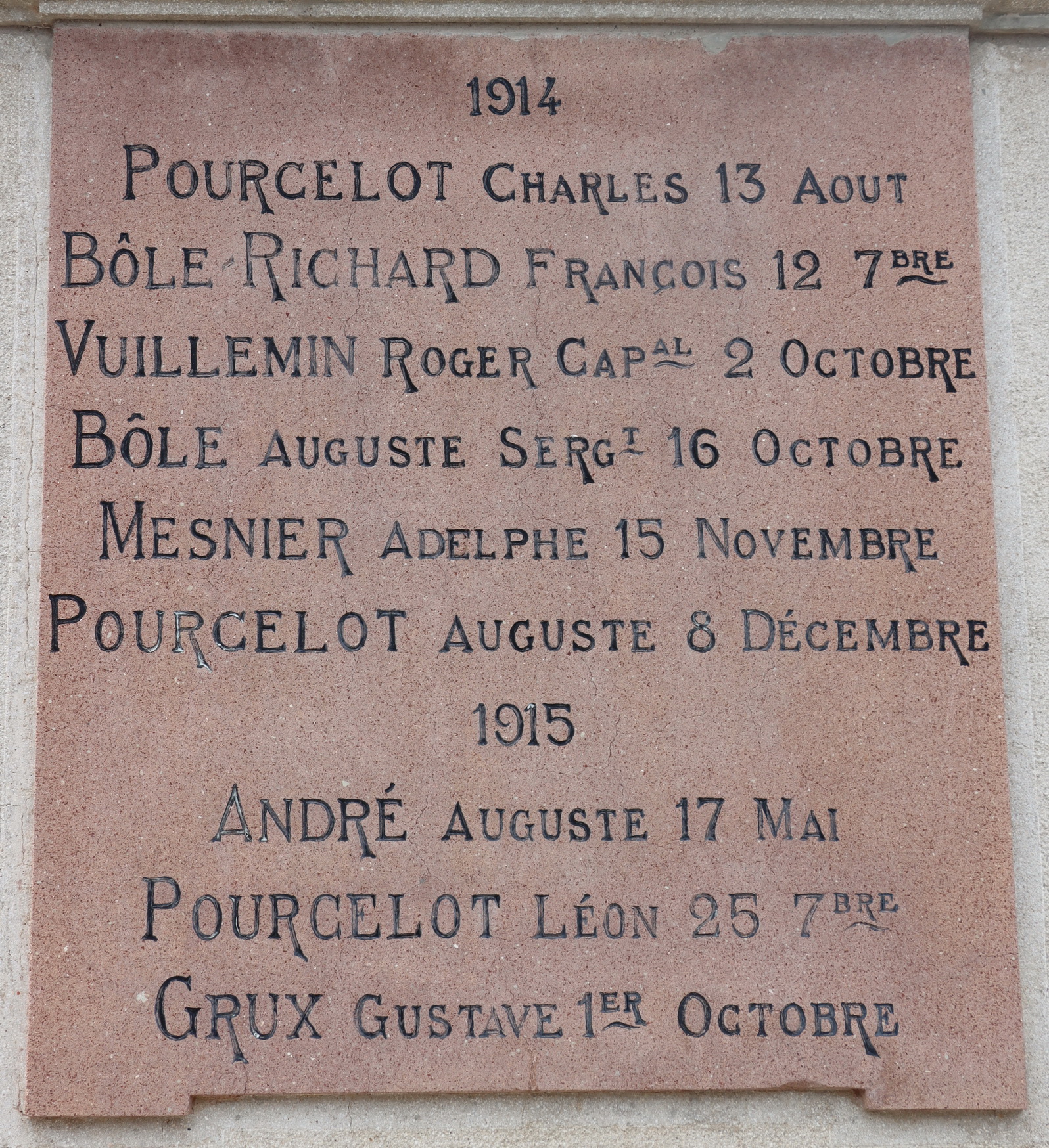 Die mit nur 328 Einwohner kleine Gemeinde im Departement Doubs (F) auf einer Fläche von 19,49 Km2 weist ein Kriegerdenkmal mit 23 Namen von gefallen Soldaten auf, 14 davon sind mit Fabian Coulot verwandt