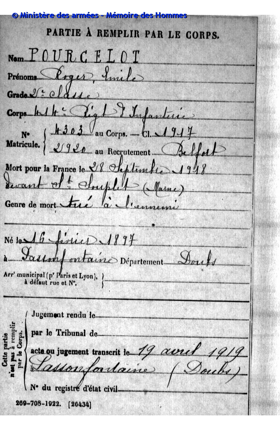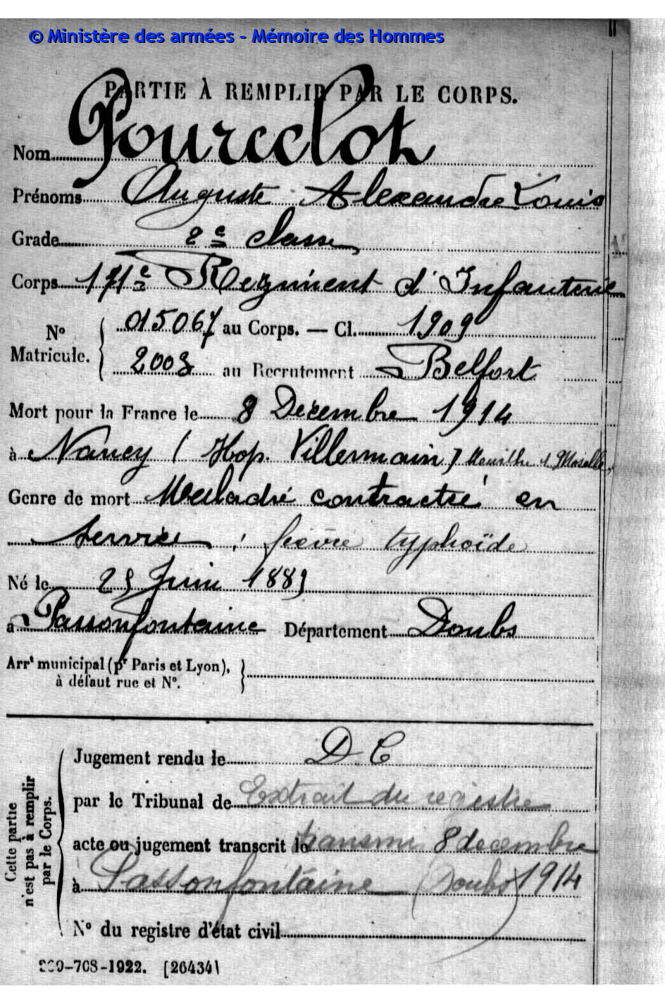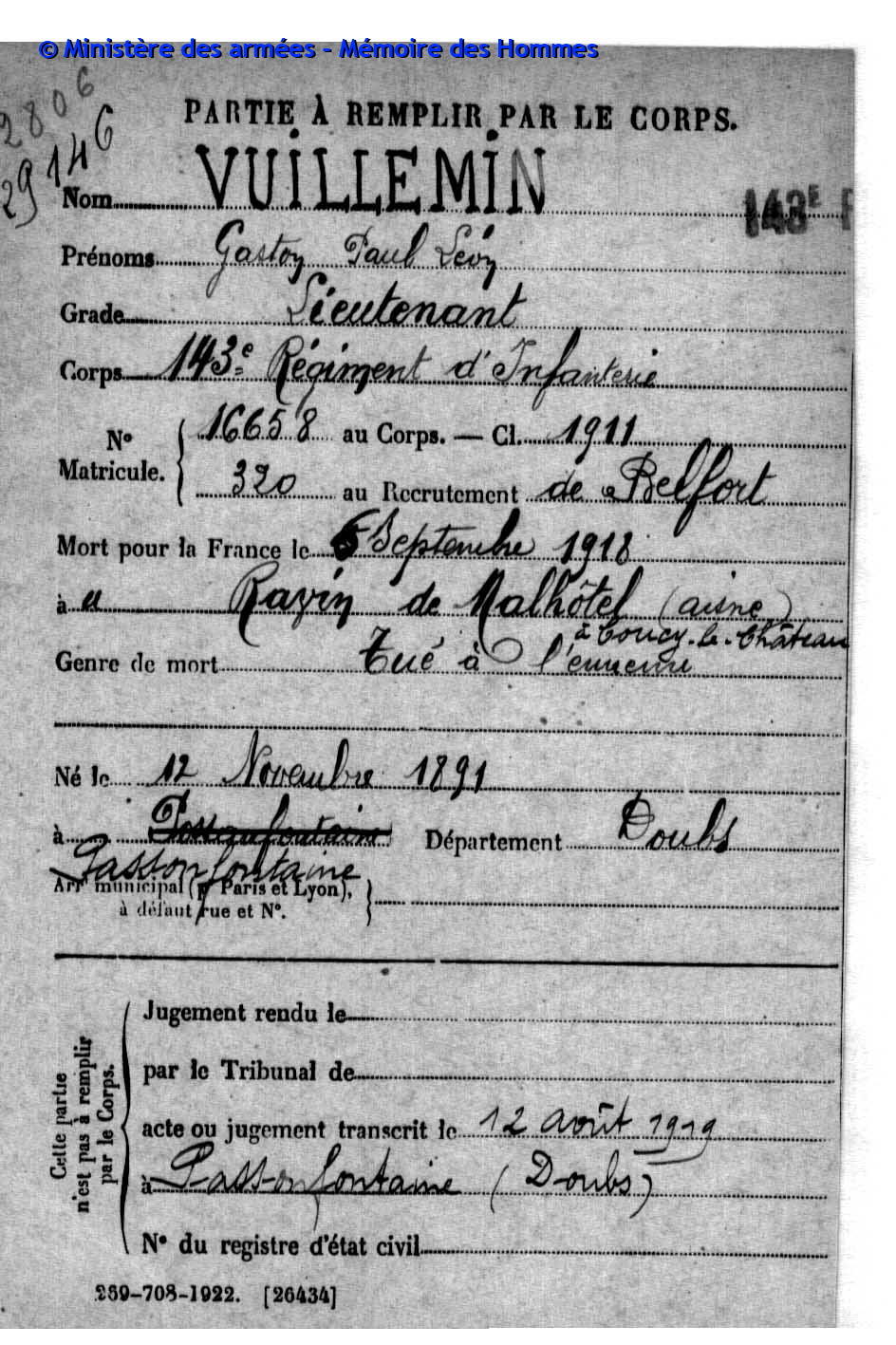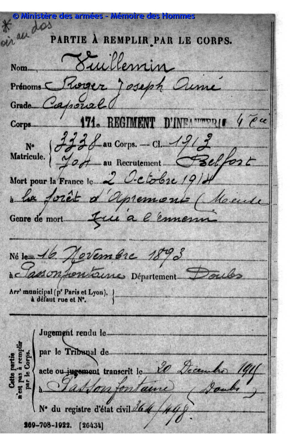 | Caporal VUILLEMIN Roger Joseph Aimé 16.11.1893 - 02.10.1914 171ème Régiment d'Infanterie 4ème Compagnie Gefallen im Wald von Apremont -Meuse (F) |
