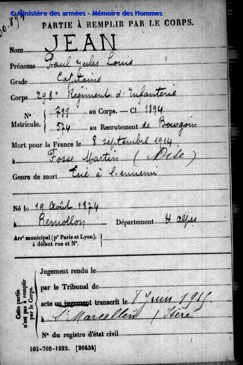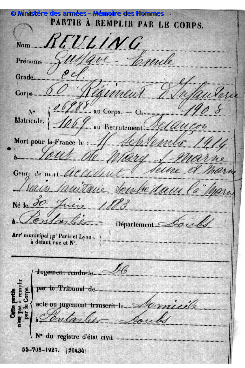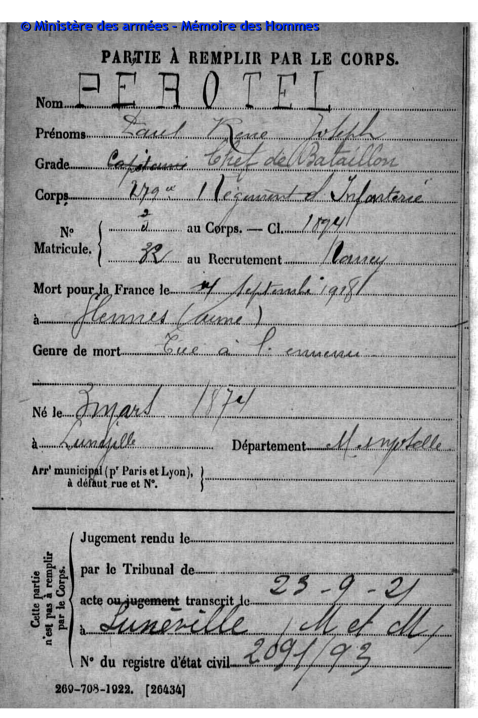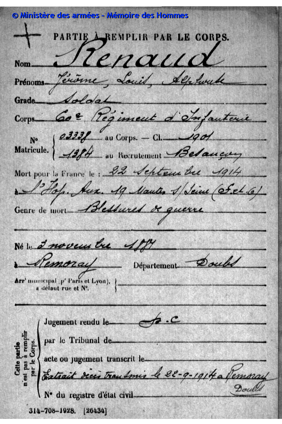 | Soldat RENAUD Jérôme Louis Alphonse 03.11.1881 - 22.09.1914 60ème Régiment d'Infanterie Verstarb an seinen Wunden im Hôpital auxillaire No.19 in Mantes-la-Jolie (F) |