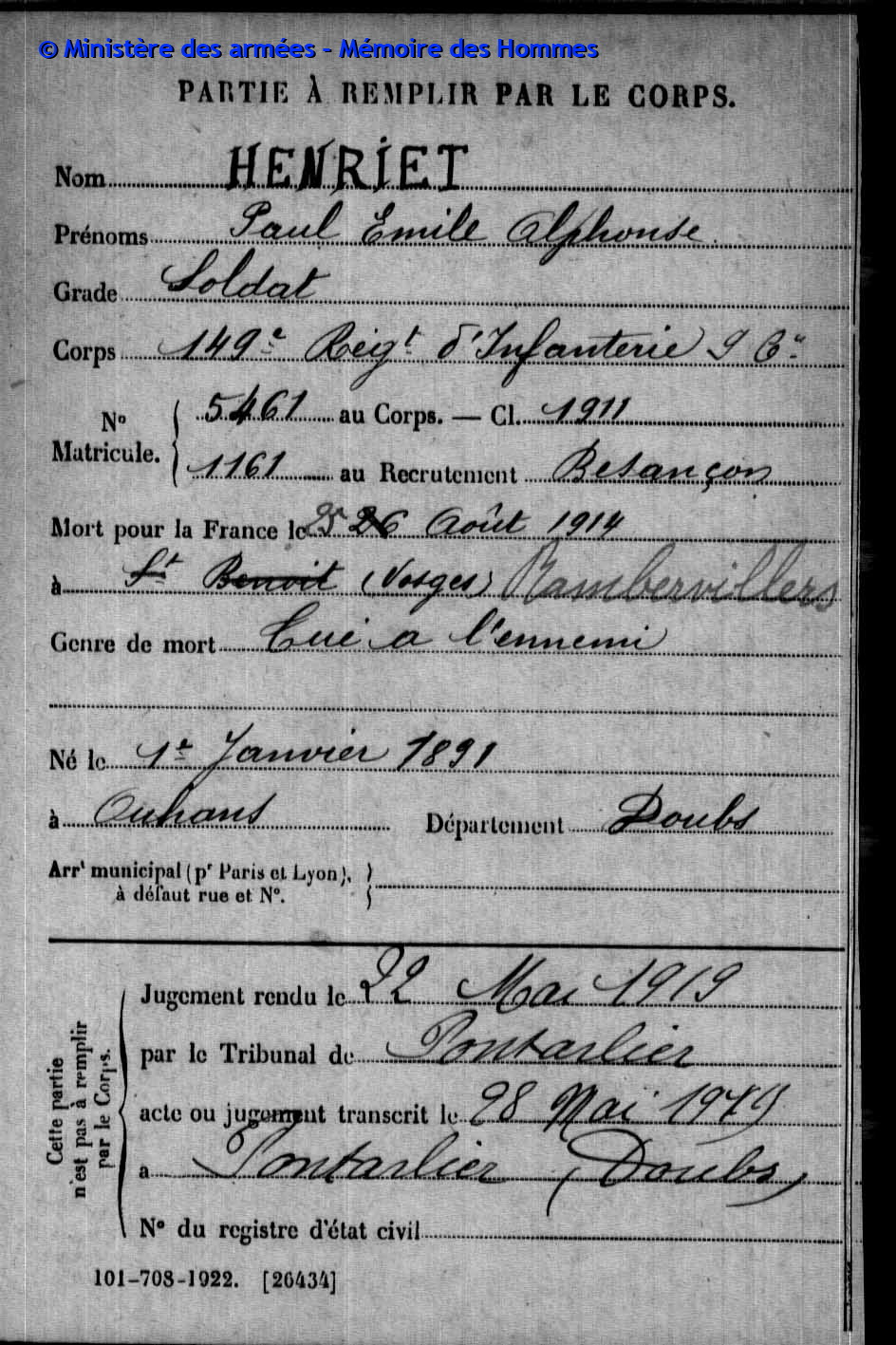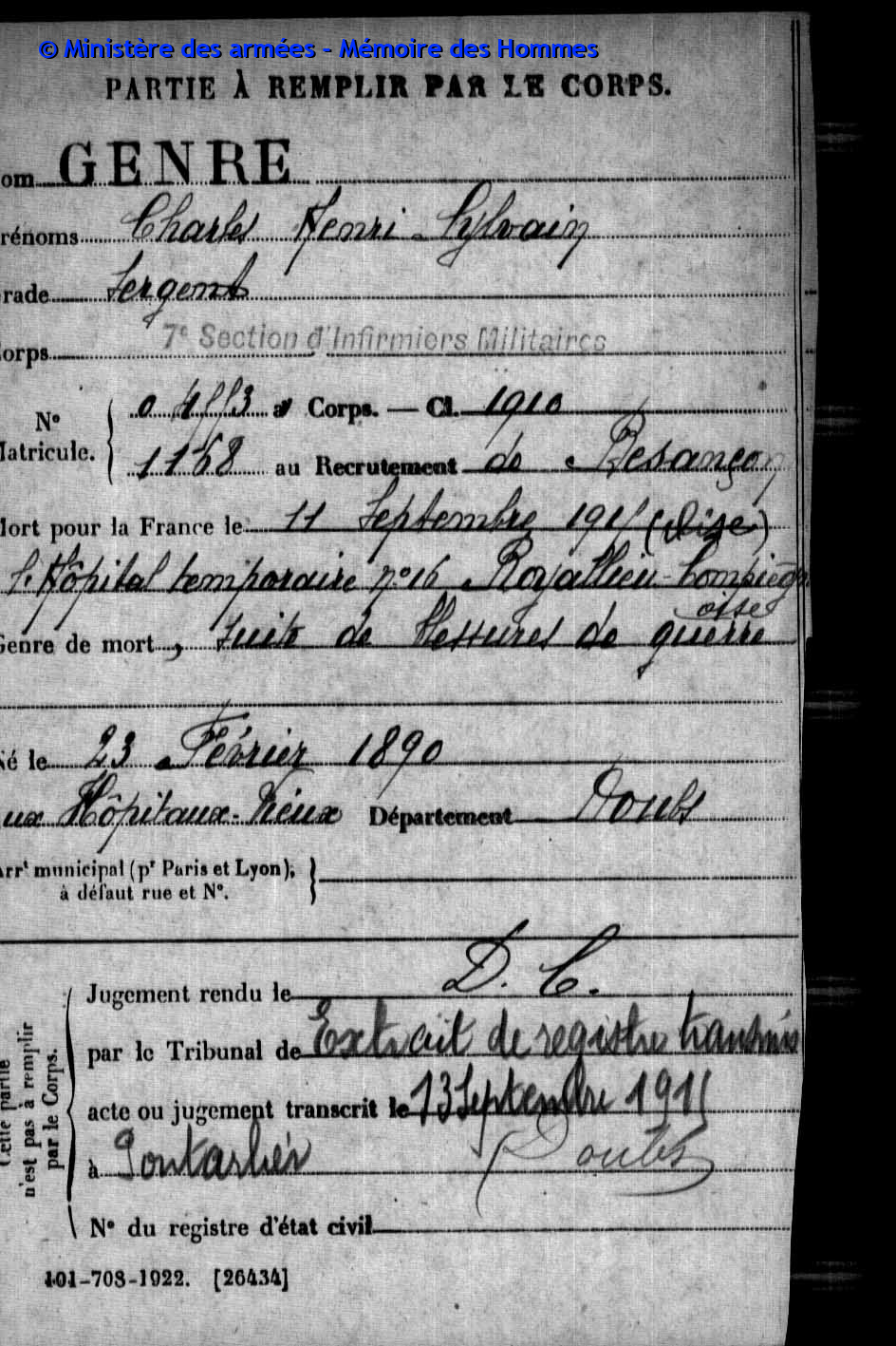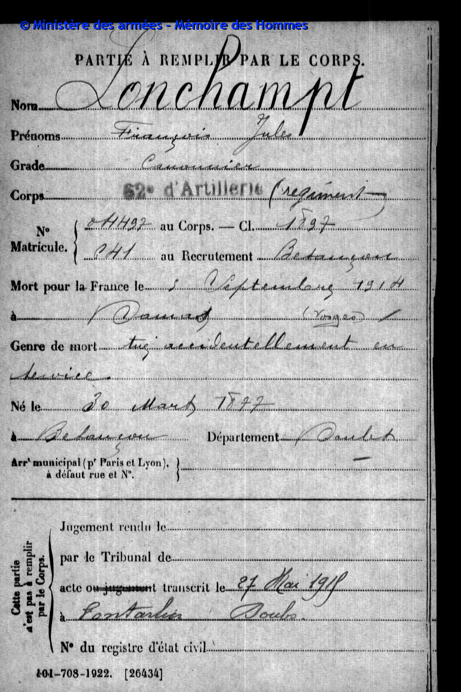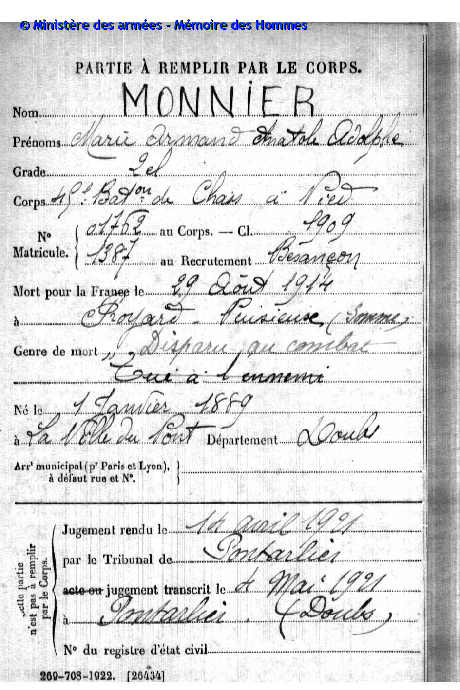| Soldat RENAUD Jérôme Louis Alphonse 03.11.1881 - 22.09.1914 60ème Régiment d'Infanterie Verstarb an seinen Wunden im Hôpital auxillaire No.19 in Mantes-la-Jolie (F) |