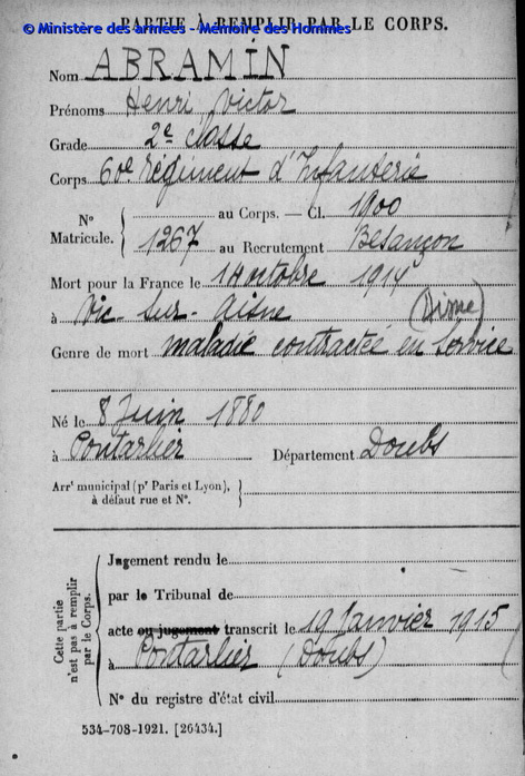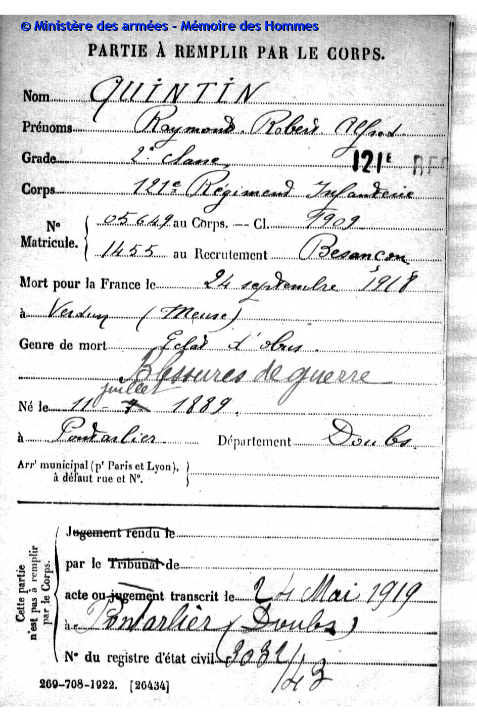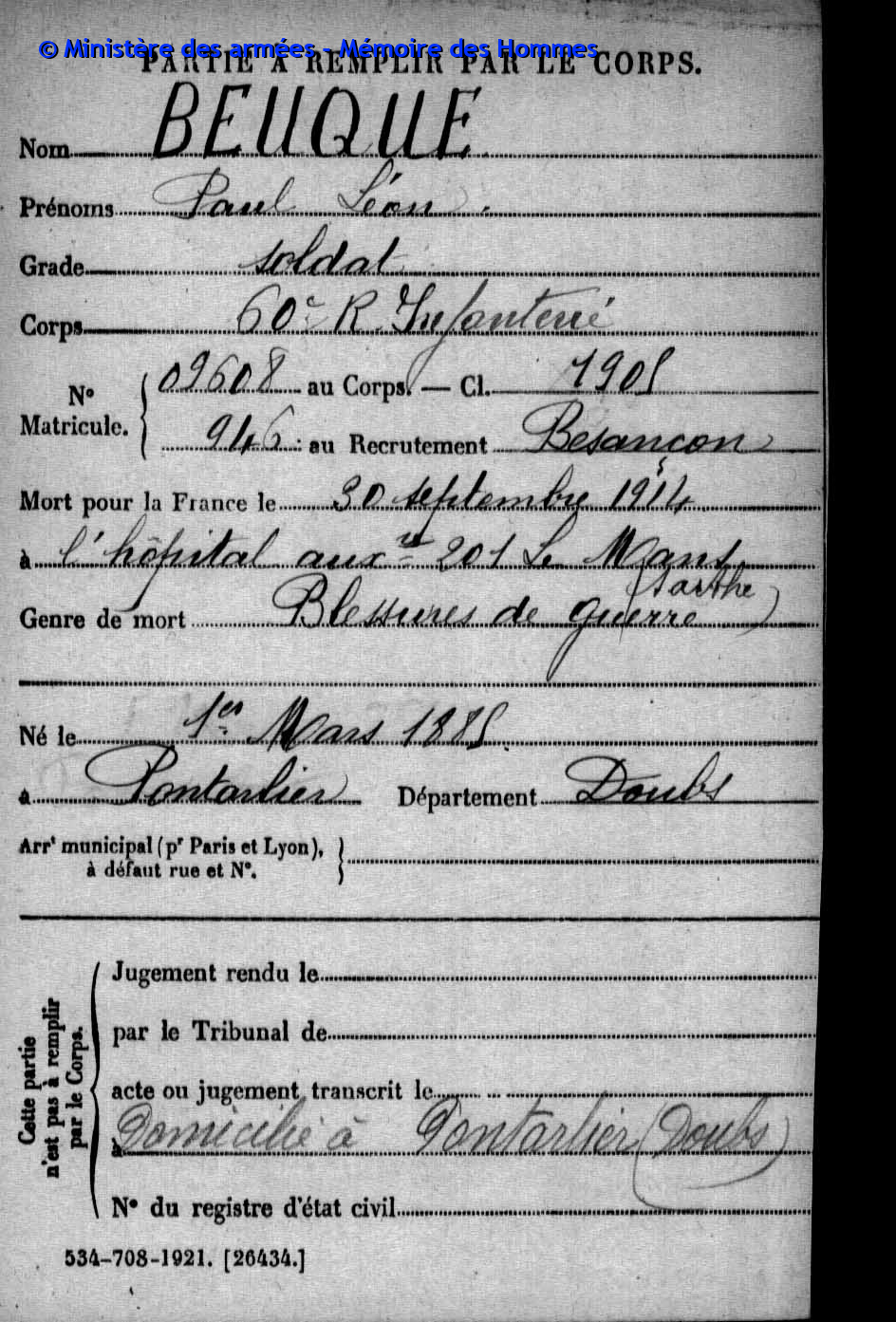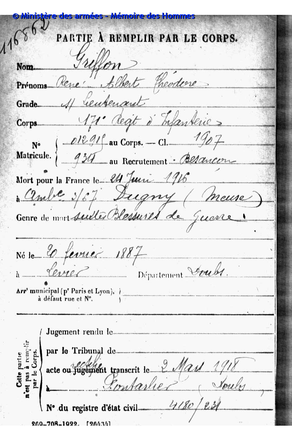 | Soldat RENAUD Jérôme Louis Alphonse 03.11.1881 - 22.09.1914 60ème Régiment d'Infanterie Verstarb an seinen Wunden im Hôpital auxillaire No.19 in Mantes-la-Jolie (F) |