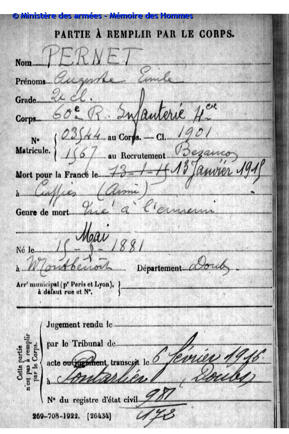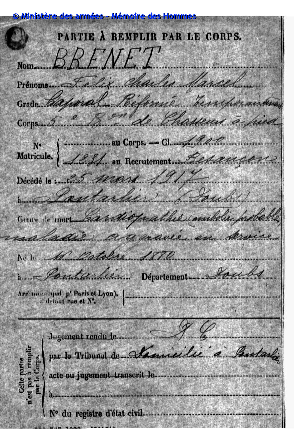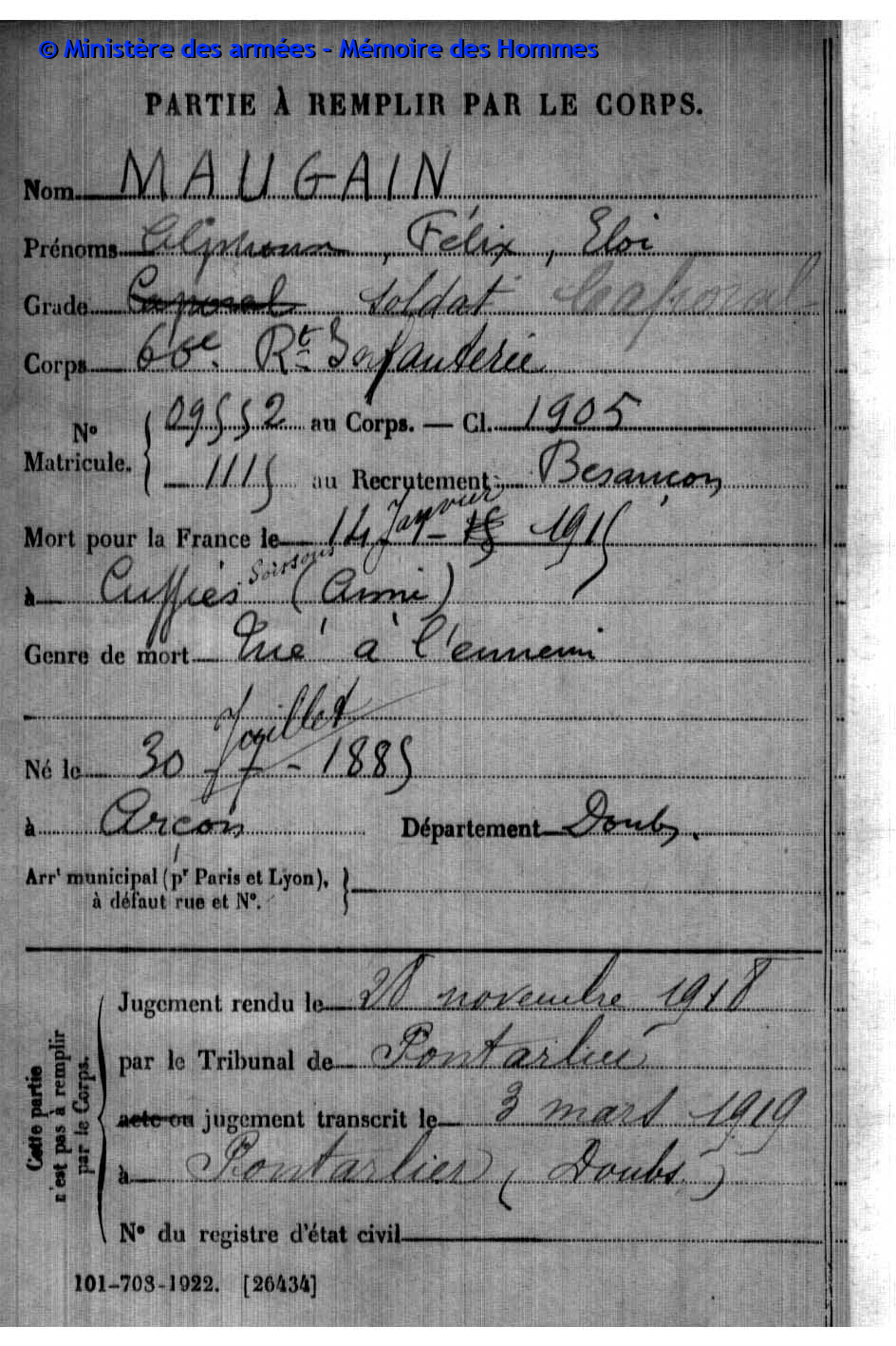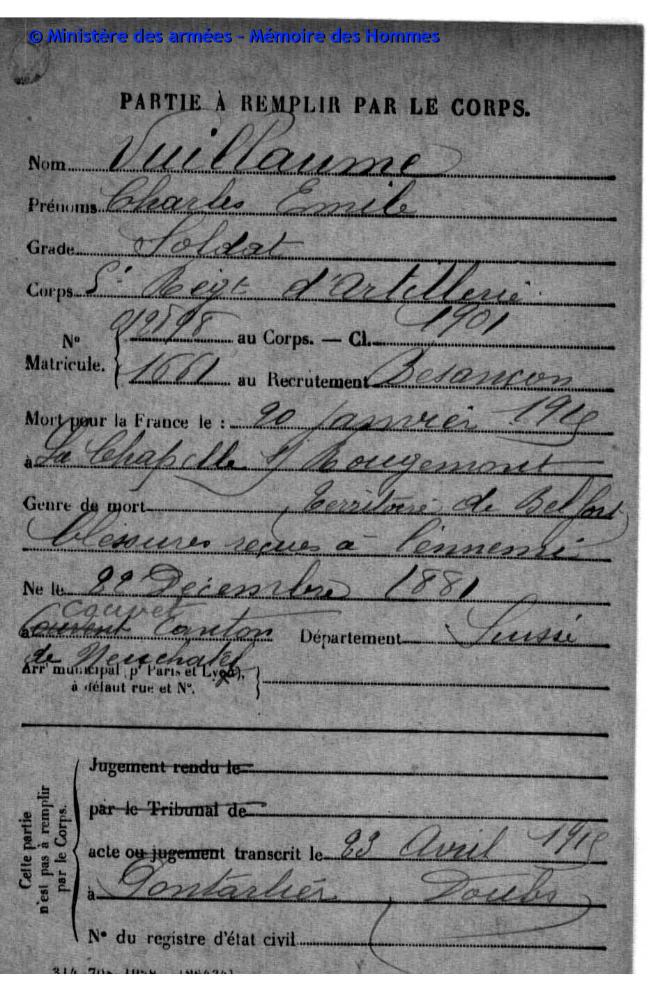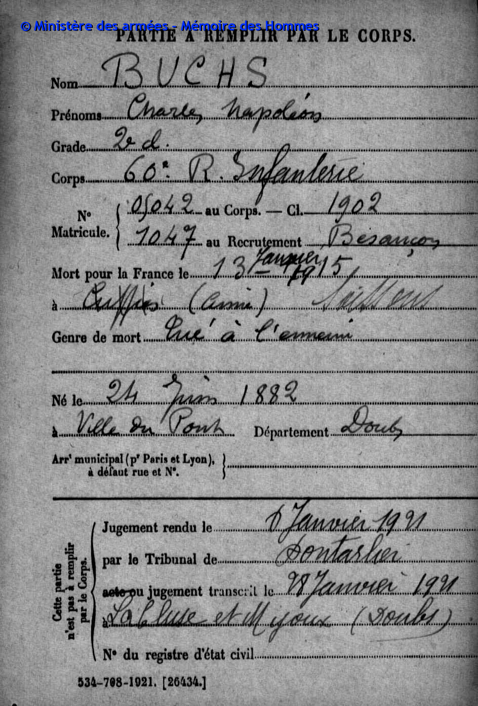 | Chasseur MICHAUD Charles Félicien Fernand 17.05.1877 - 19.08.1916 15ème Bataillon de Chasseurs à Pied Verstarb durch Krankheit ans Kriegsfolgen zu Hause in Pontarlier (F) |