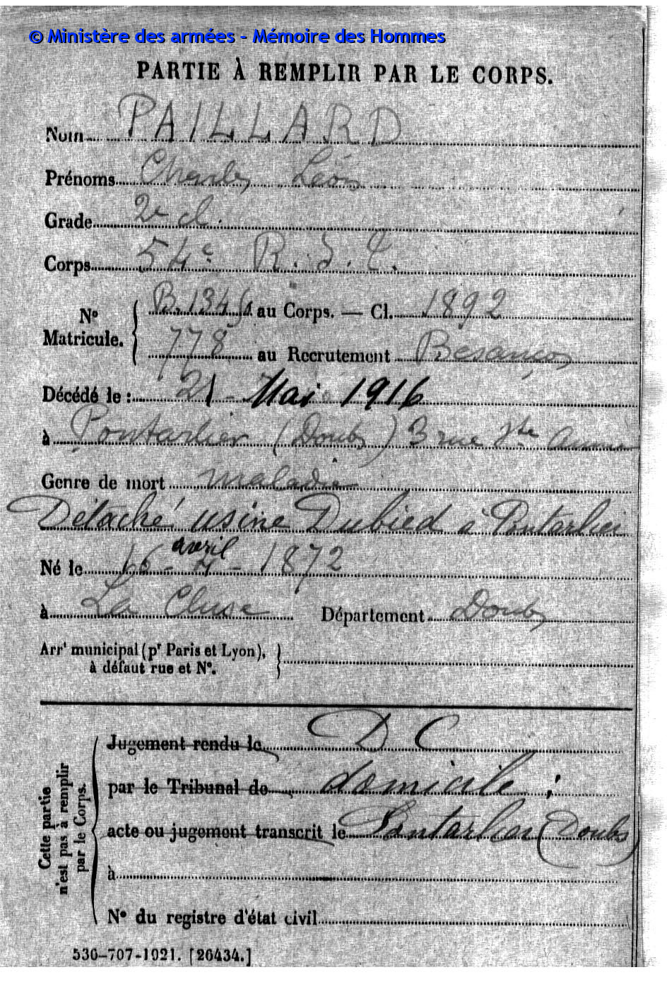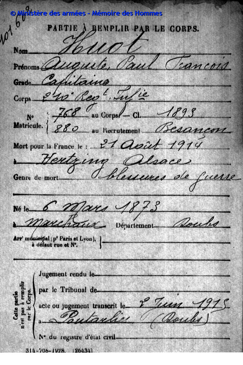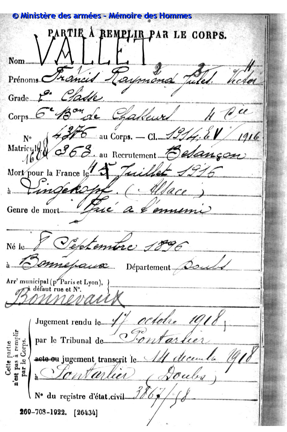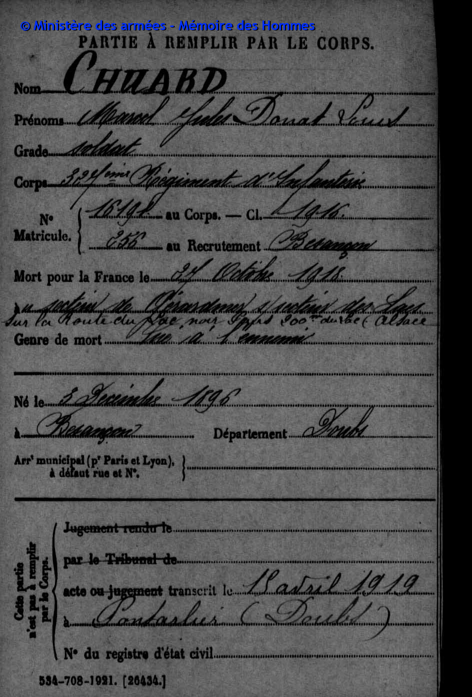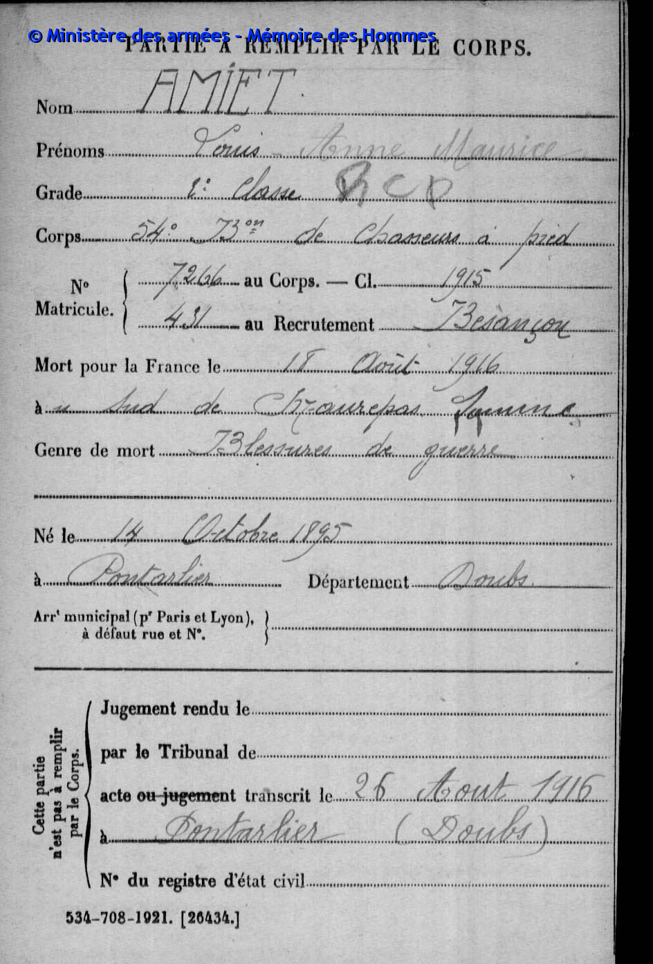 | Chasseur MICHAUD Charles Félicien Fernand 17.05.1877 - 19.08.1916 15ème Bataillon de Chasseurs à Pied Verstarb durch Krankheit ans Kriegsfolgen zu Hause in Pontarlier (F) |