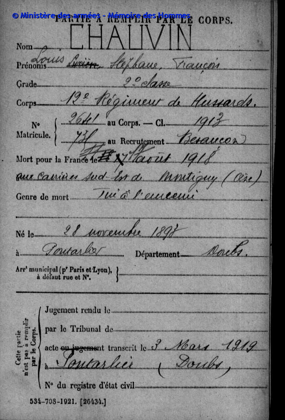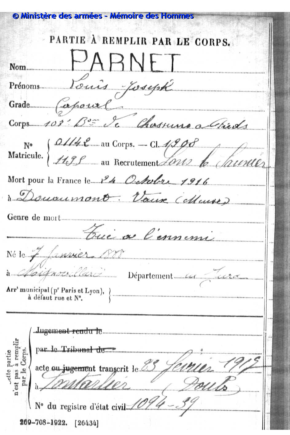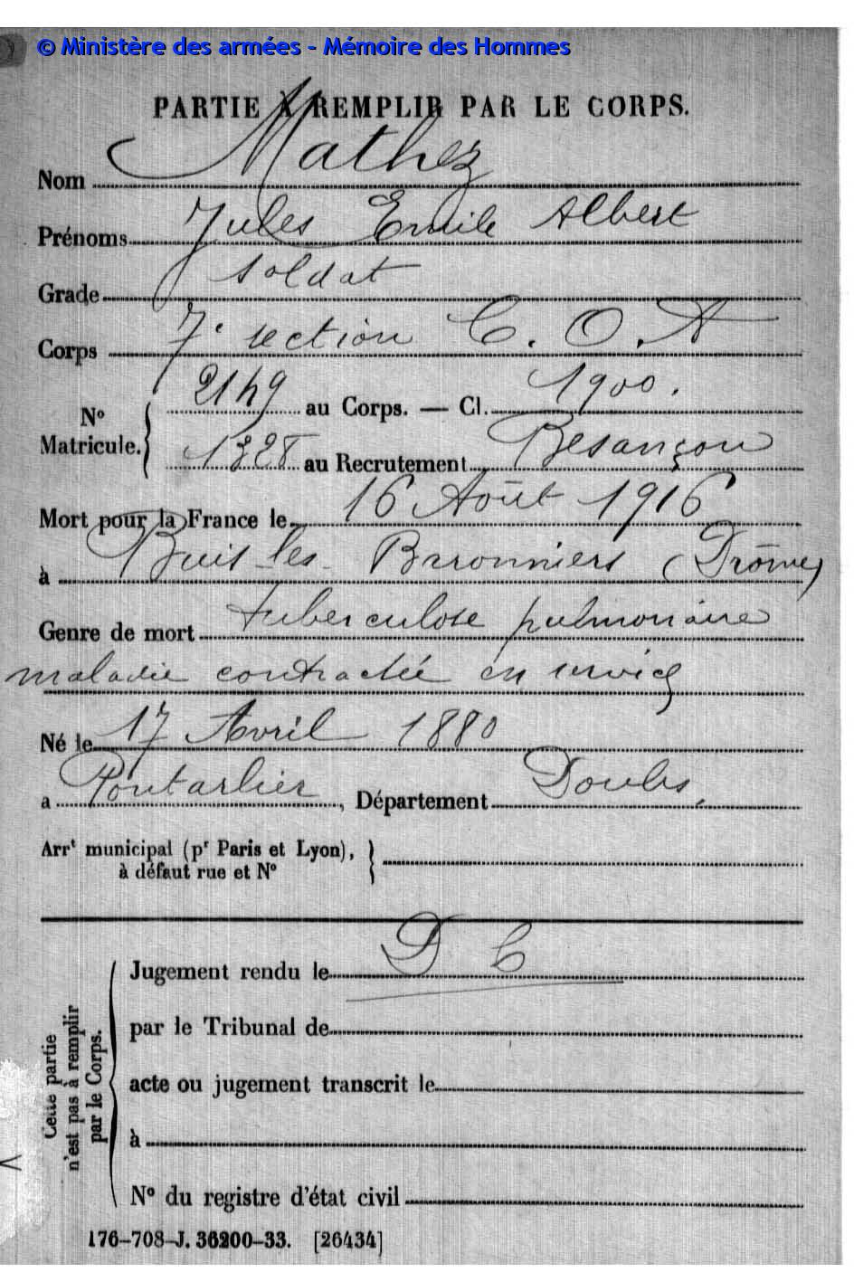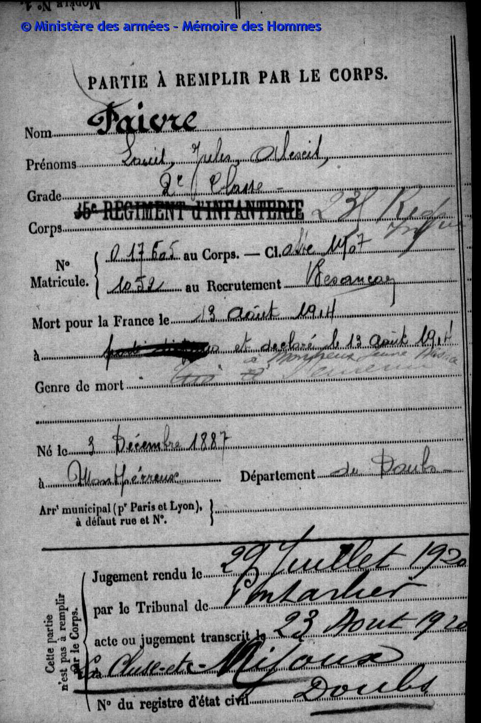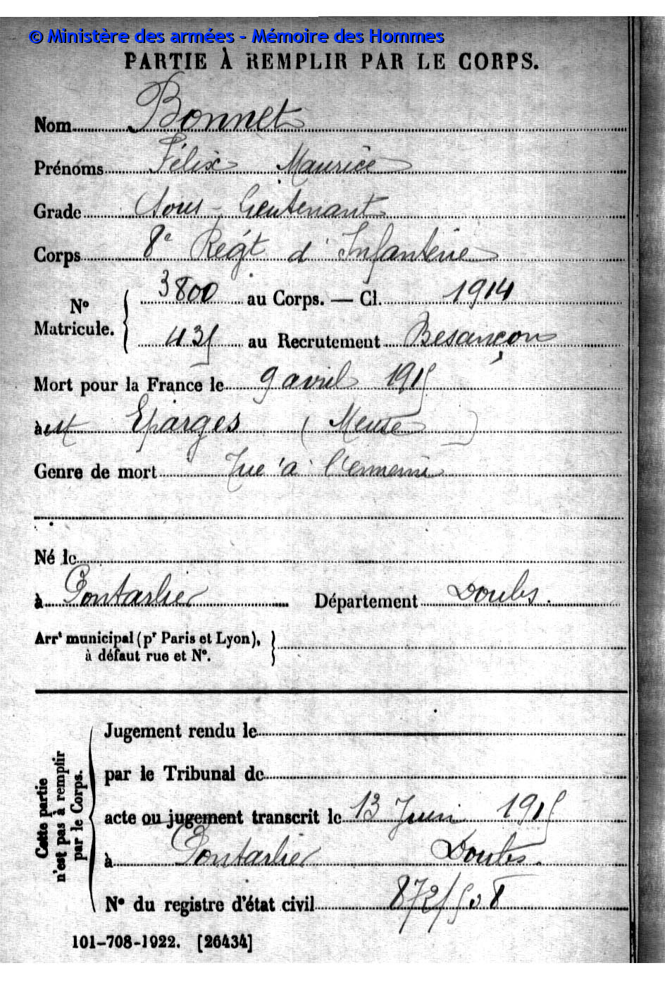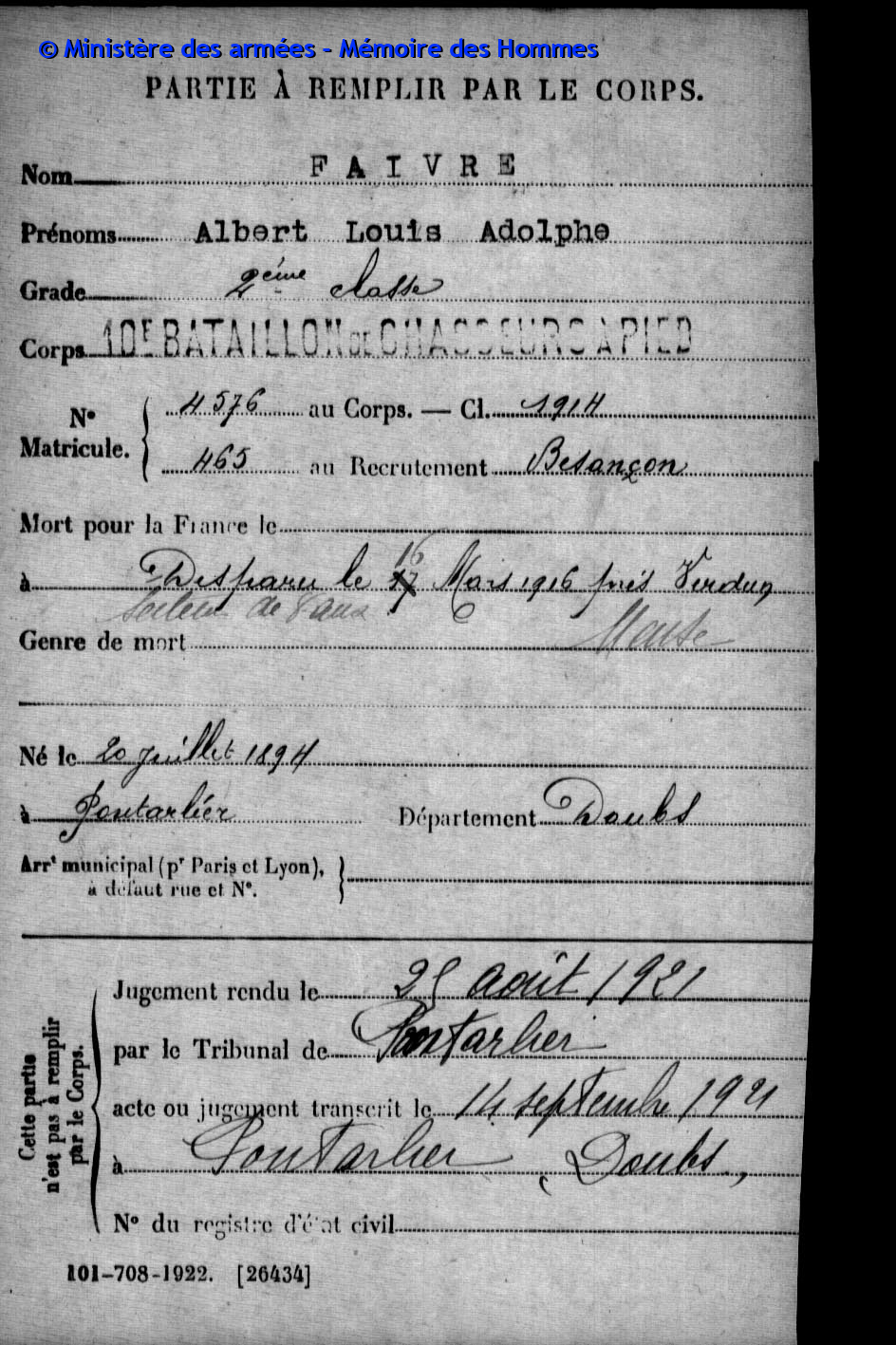 | Chasseur MICHAUD Charles Félicien Fernand 17.05.1877 - 19.08.1916 15ème Bataillon de Chasseurs à Pied Verstarb durch Krankheit ans Kriegsfolgen zu Hause in Pontarlier (F) |