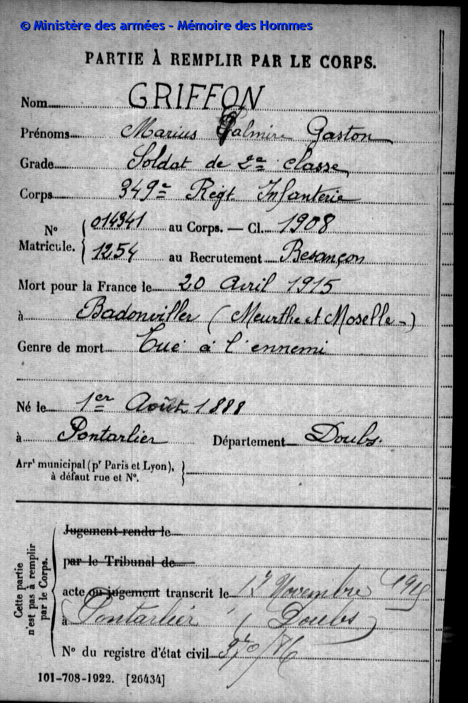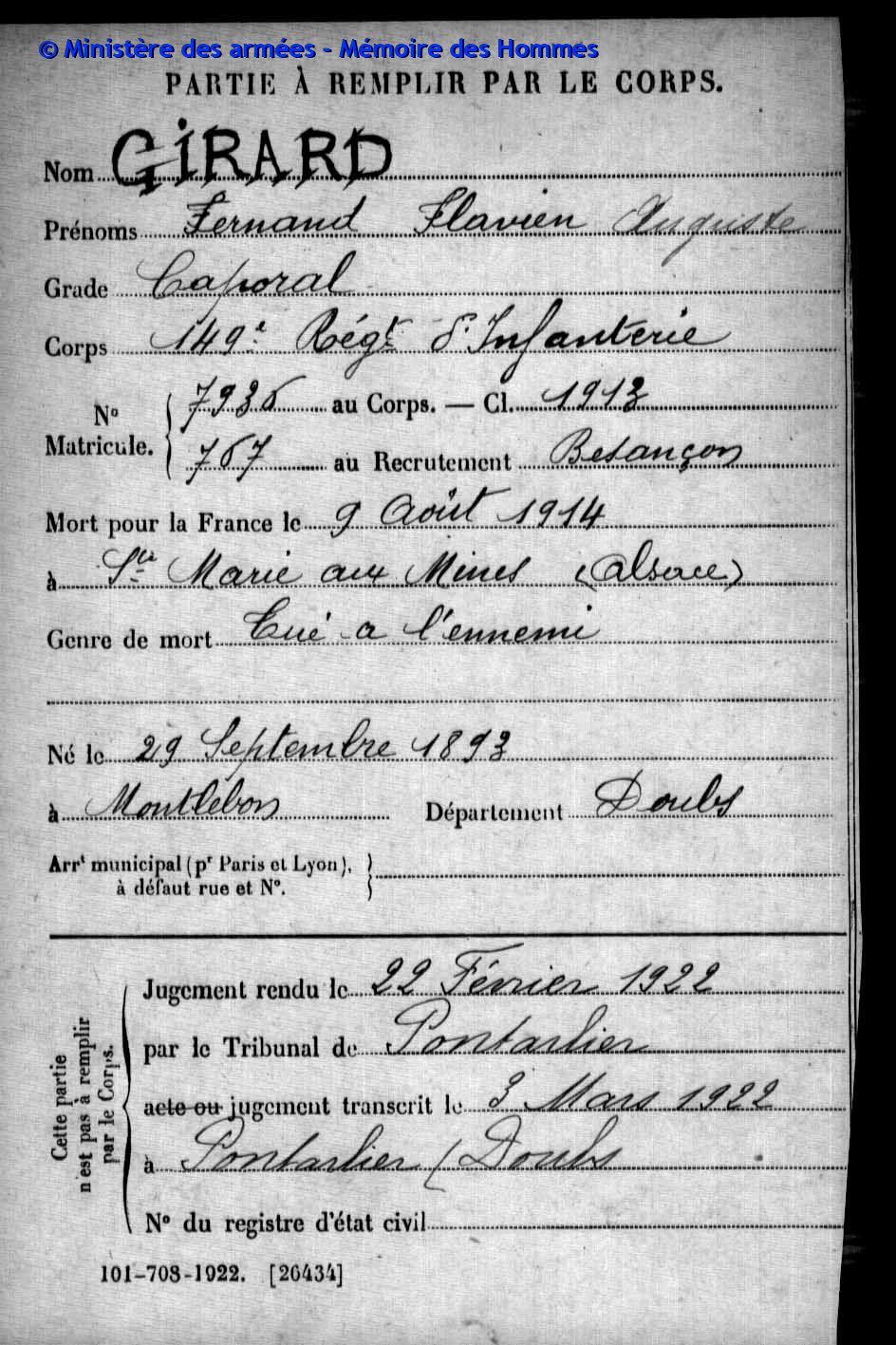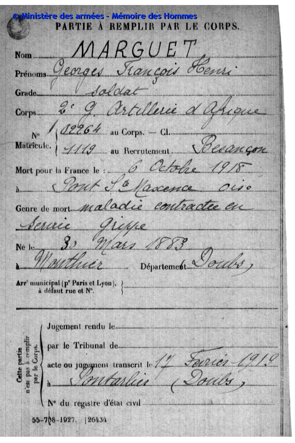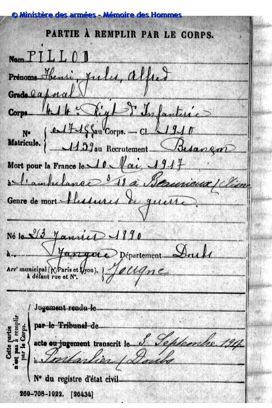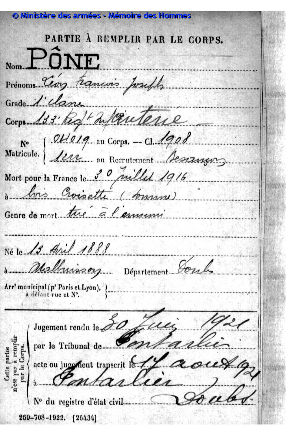 | Chasseur MICHAUD Charles Félicien Fernand 17.05.1877 - 19.08.1916 15ème Bataillon de Chasseurs à Pied Verstarb durch Krankheit ans Kriegsfolgen zu Hause in Pontarlier (F) |