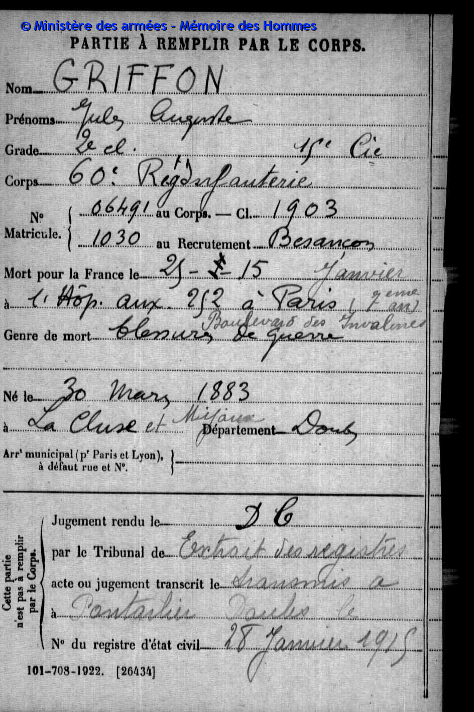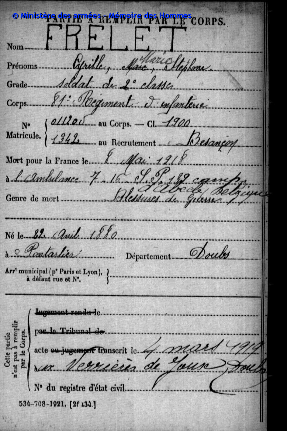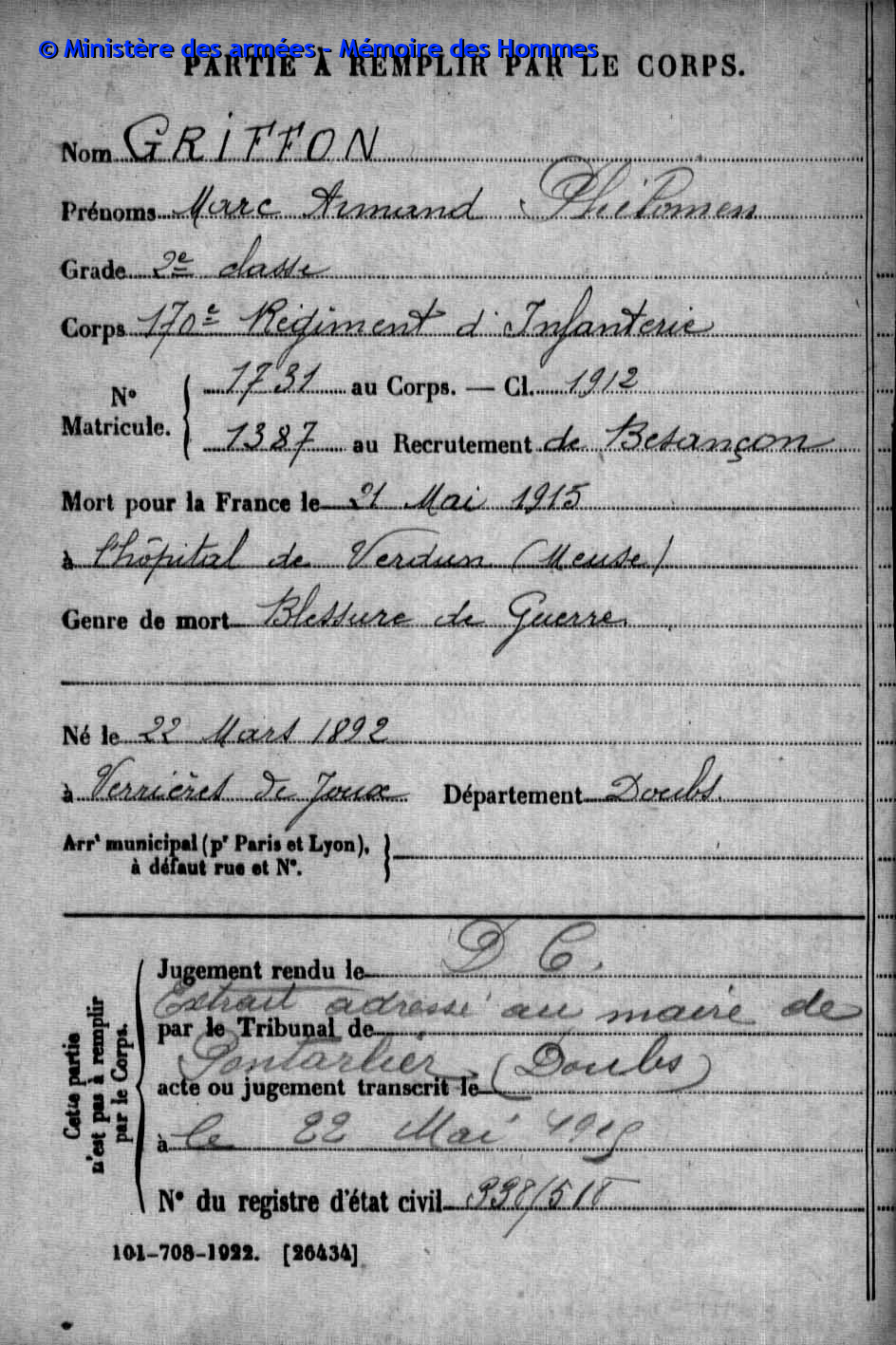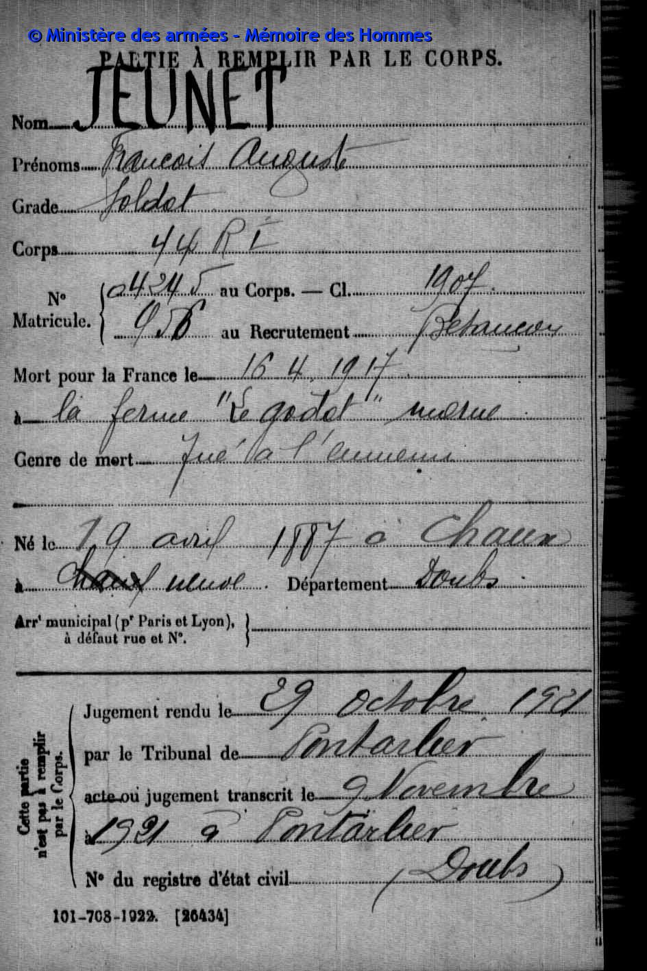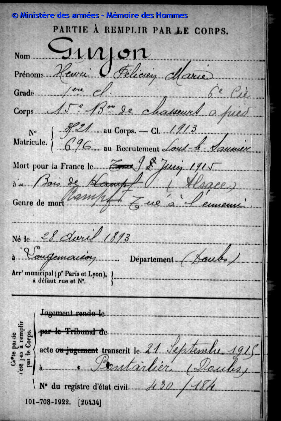 | Chasseur MICHAUD Charles Félicien Fernand 17.05.1877 - 19.08.1916 15ème Bataillon de Chasseurs à Pied Verstarb durch Krankheit ans Kriegsfolgen zu Hause in Pontarlier (F) |