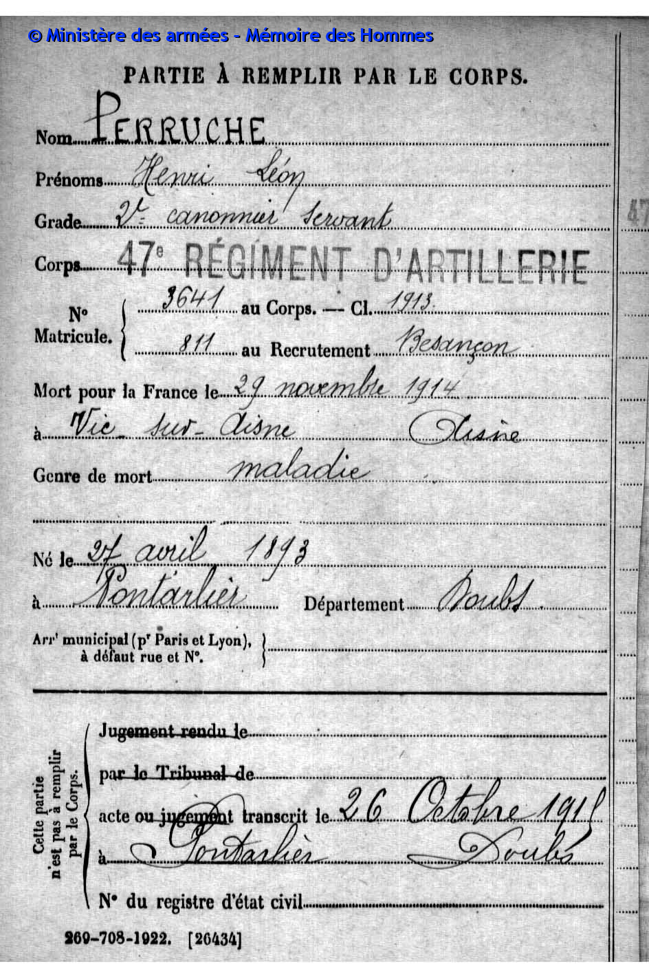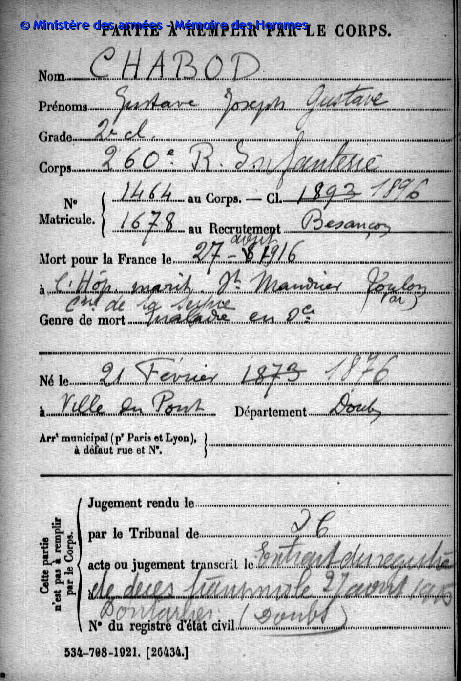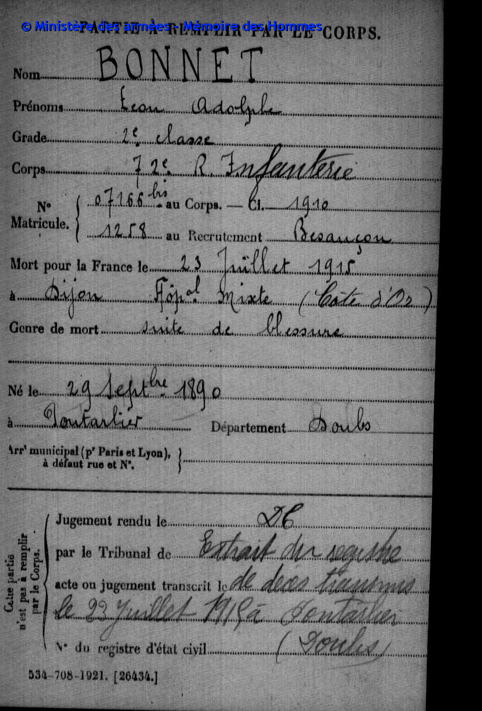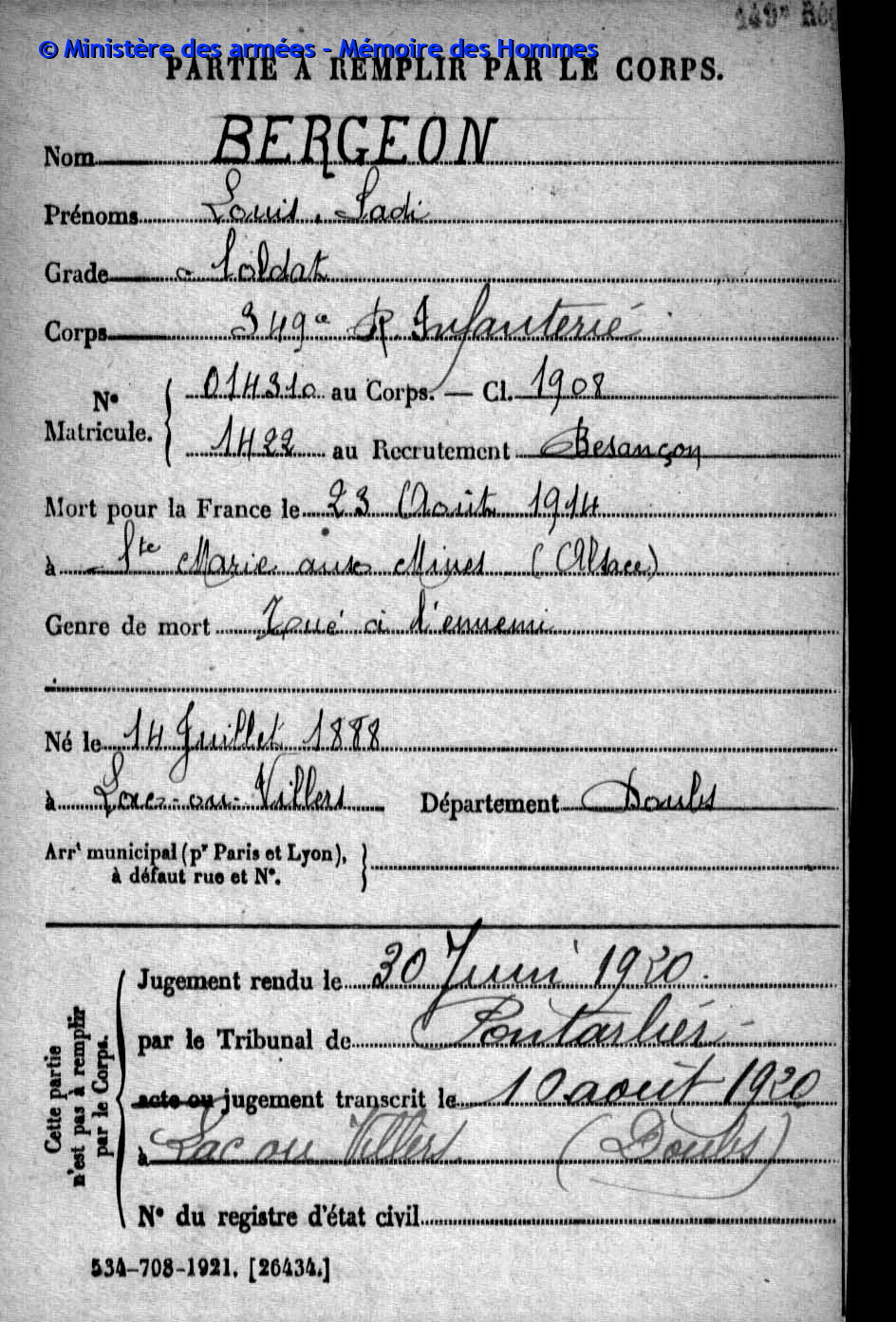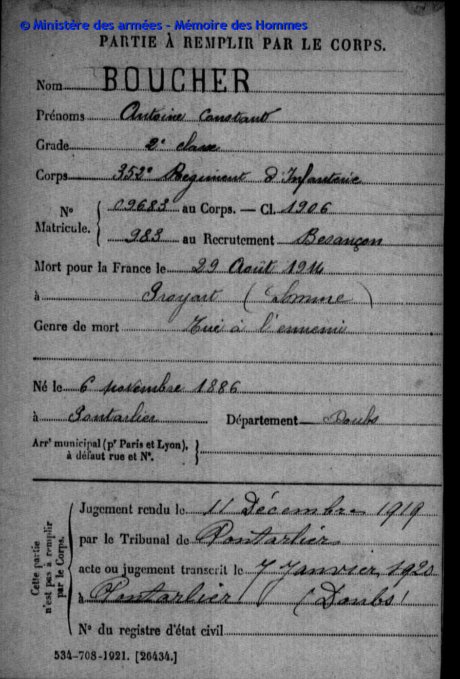 | Chasseur MICHAUD Charles Félicien Fernand 17.05.1877 - 19.08.1916 15ème Bataillon de Chasseurs à Pied Verstarb durch Krankheit ans Kriegsfolgen zu Hause in Pontarlier (F) |