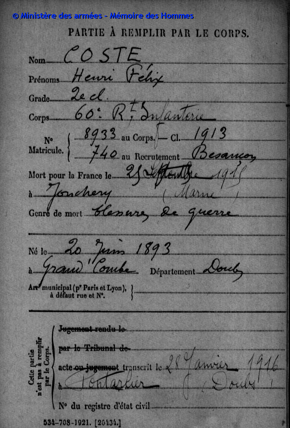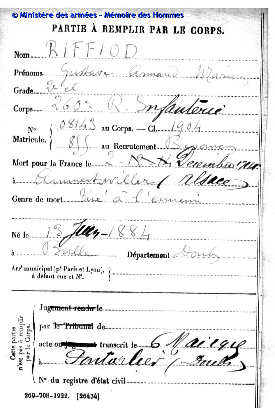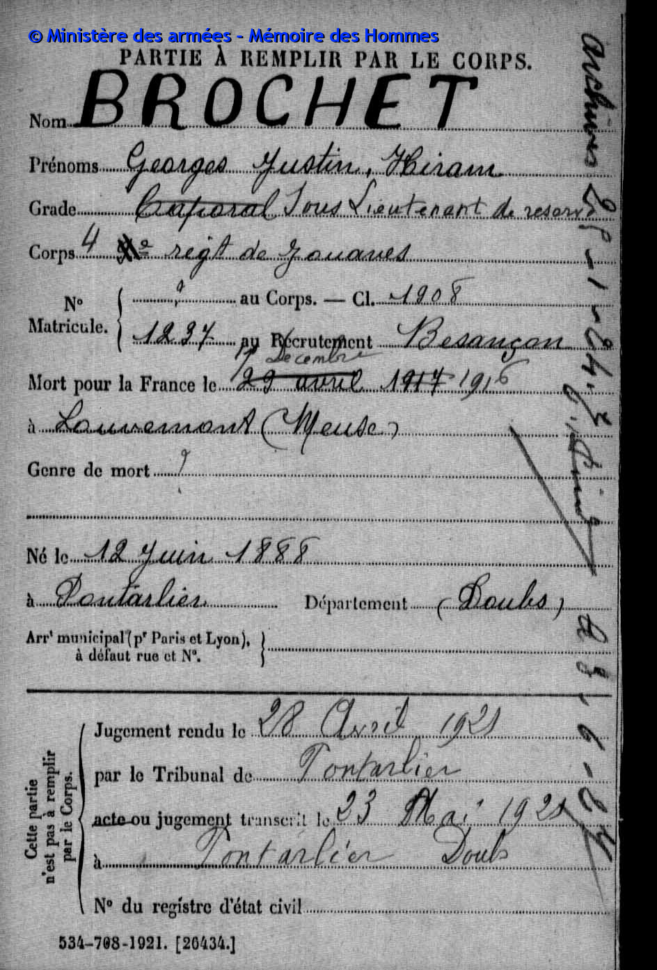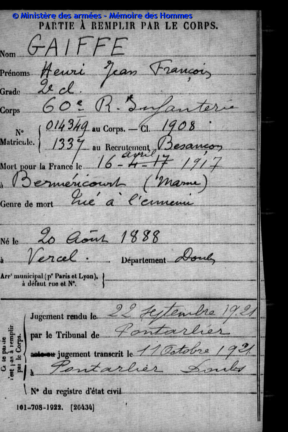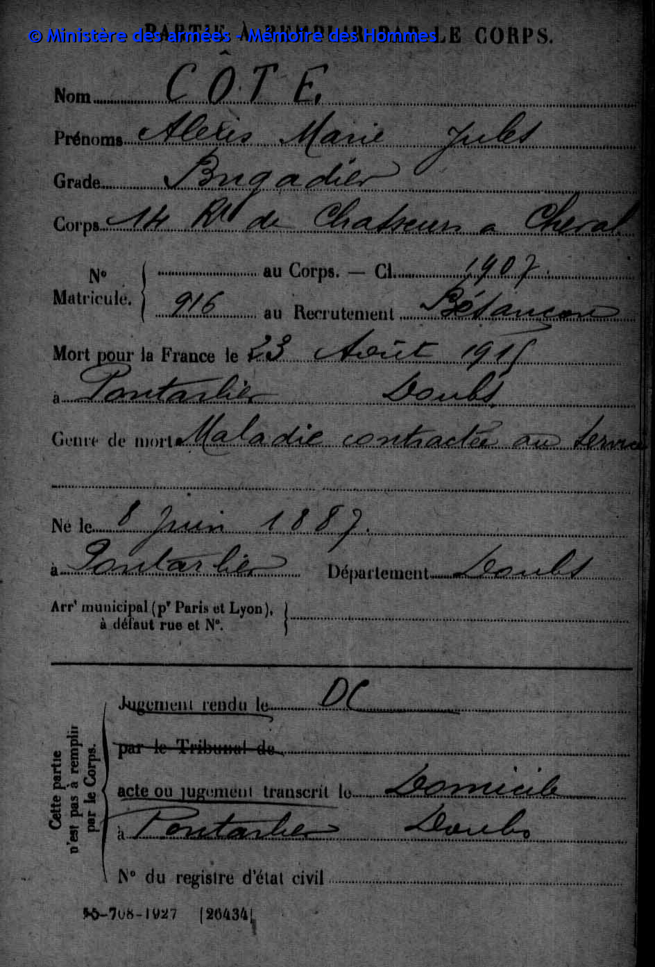| Chasseur MICHAUD Charles Félicien Fernand 17.05.1877 - 19.08.1916 15ème Bataillon de Chasseurs à Pied Verstarb durch Krankheit ans Kriegsfolgen zu Hause in Pontarlier (F) |
