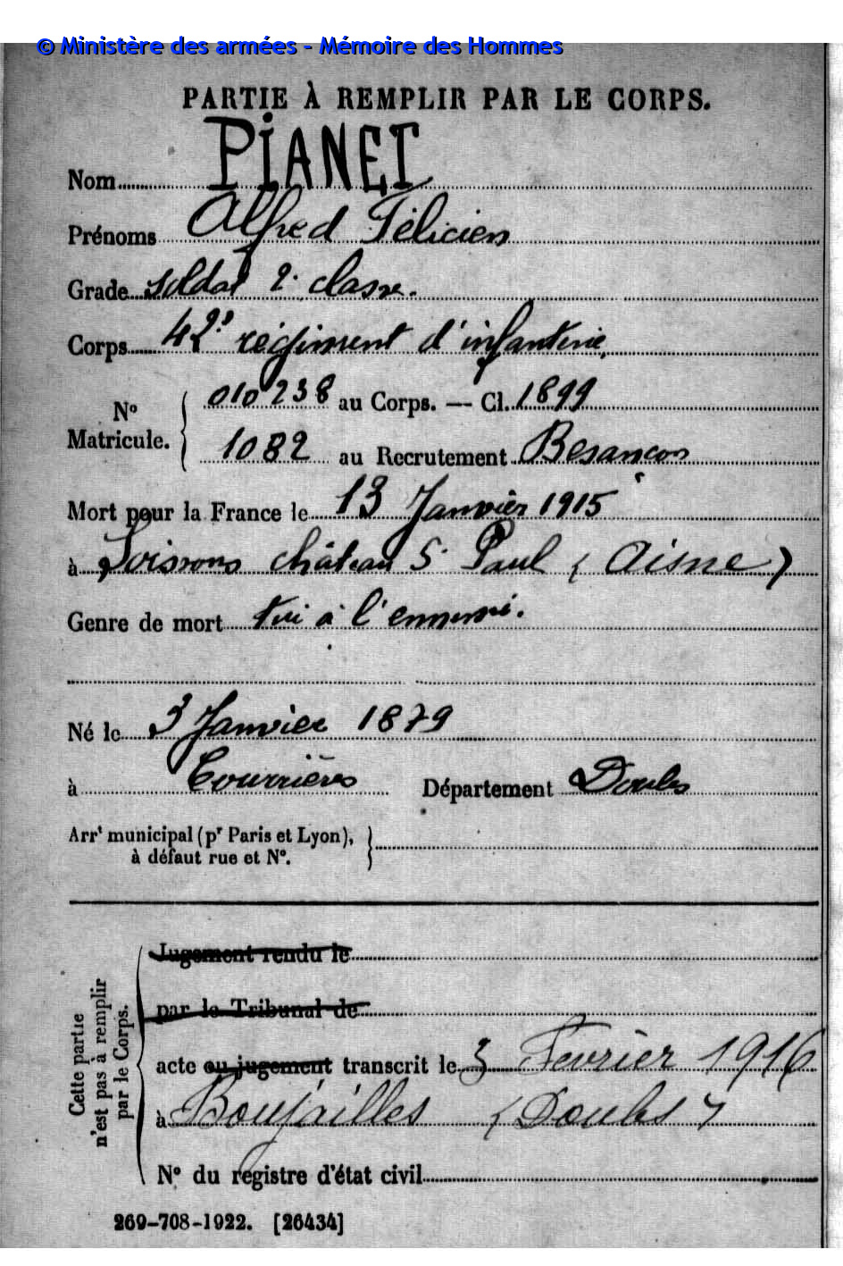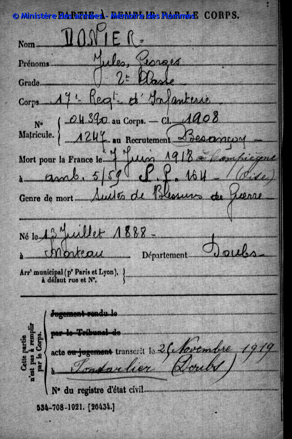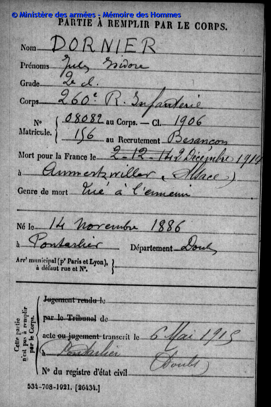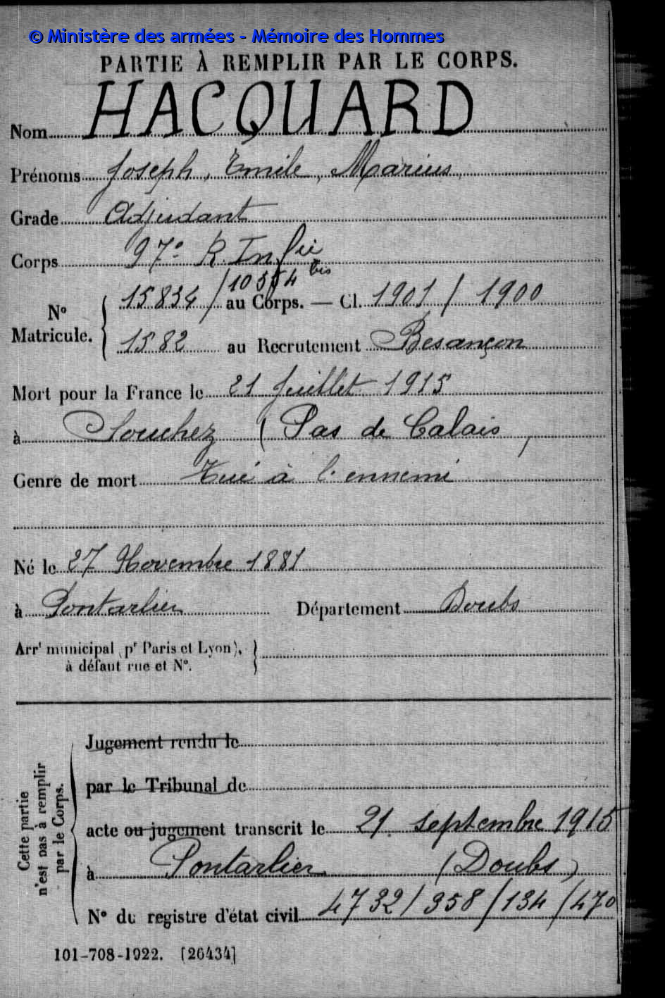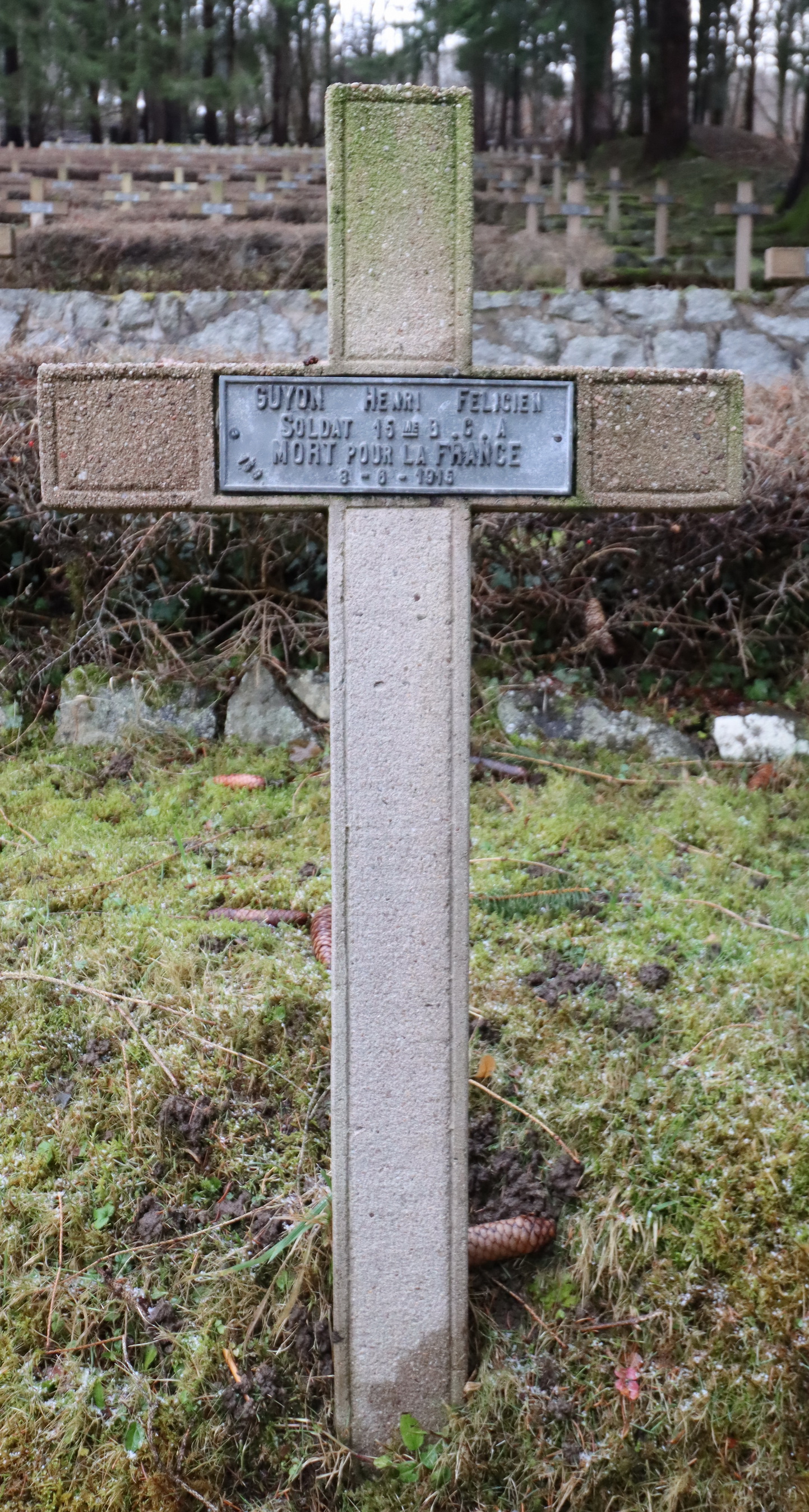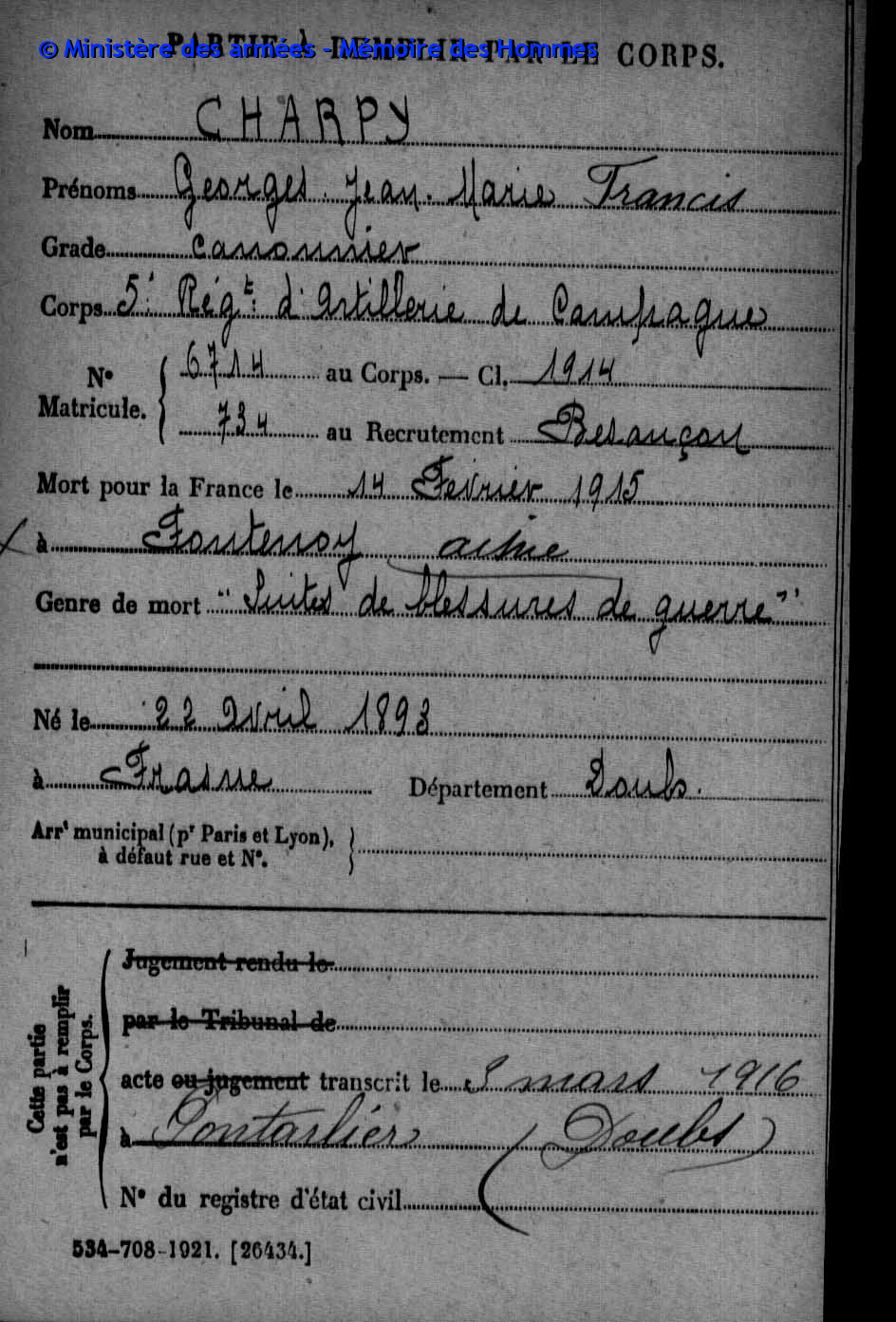 | Chasseur MICHAUD Charles Félicien Fernand 17.05.1877 - 19.08.1916 15ème Bataillon de Chasseurs à Pied Verstarb durch Krankheit ans Kriegsfolgen zu Hause in Pontarlier (F) |