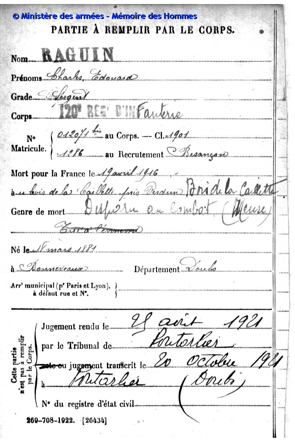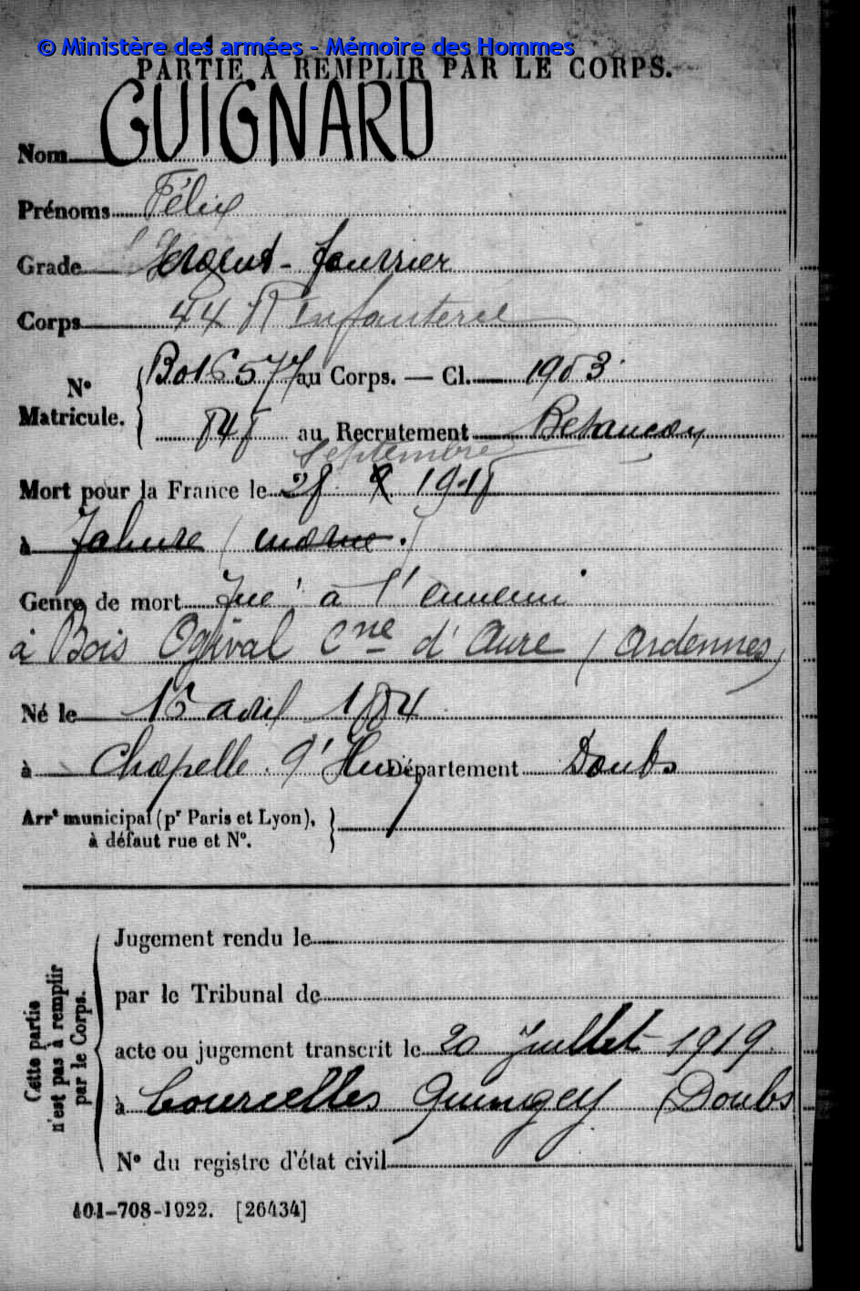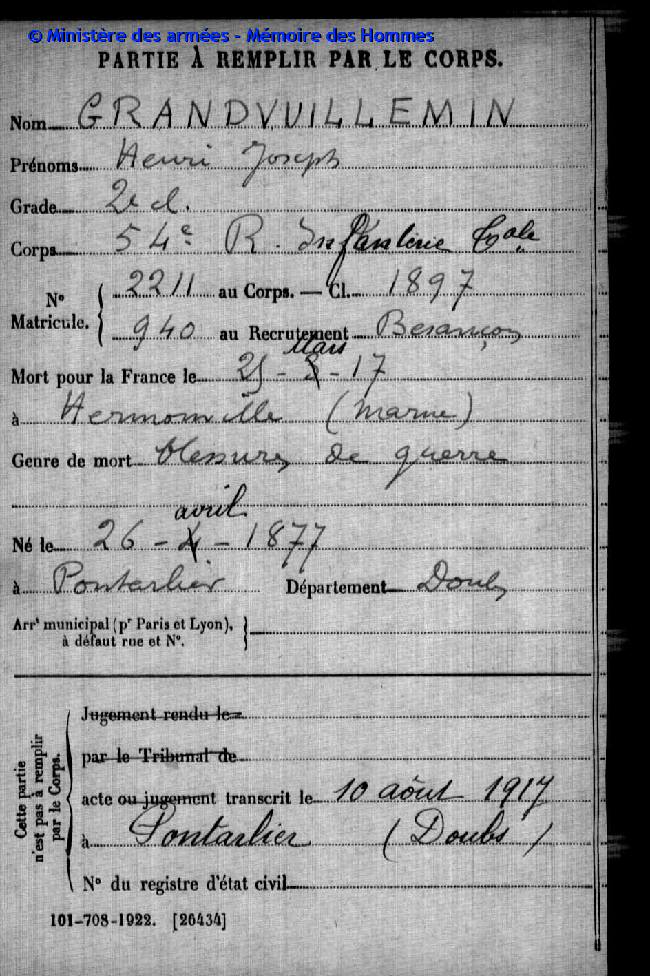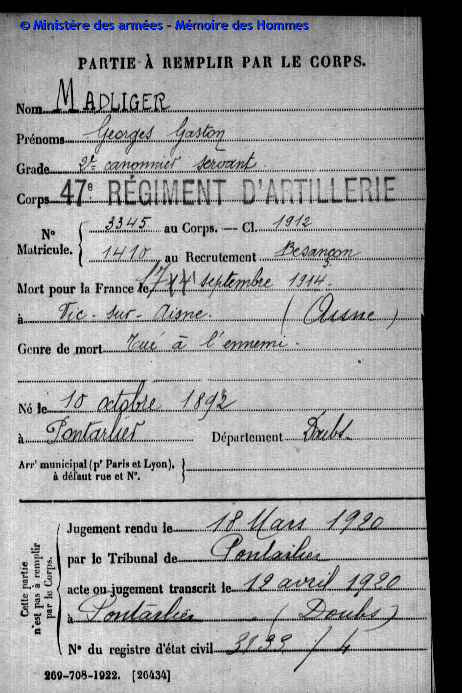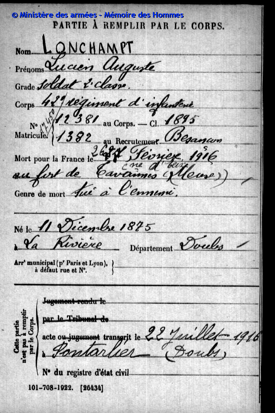 | Chasseur MICHAUD Charles Félicien Fernand 17.05.1877 - 19.08.1916 15ème Bataillon de Chasseurs à Pied Verstarb durch Krankheit ans Kriegsfolgen zu Hause in Pontarlier (F) |