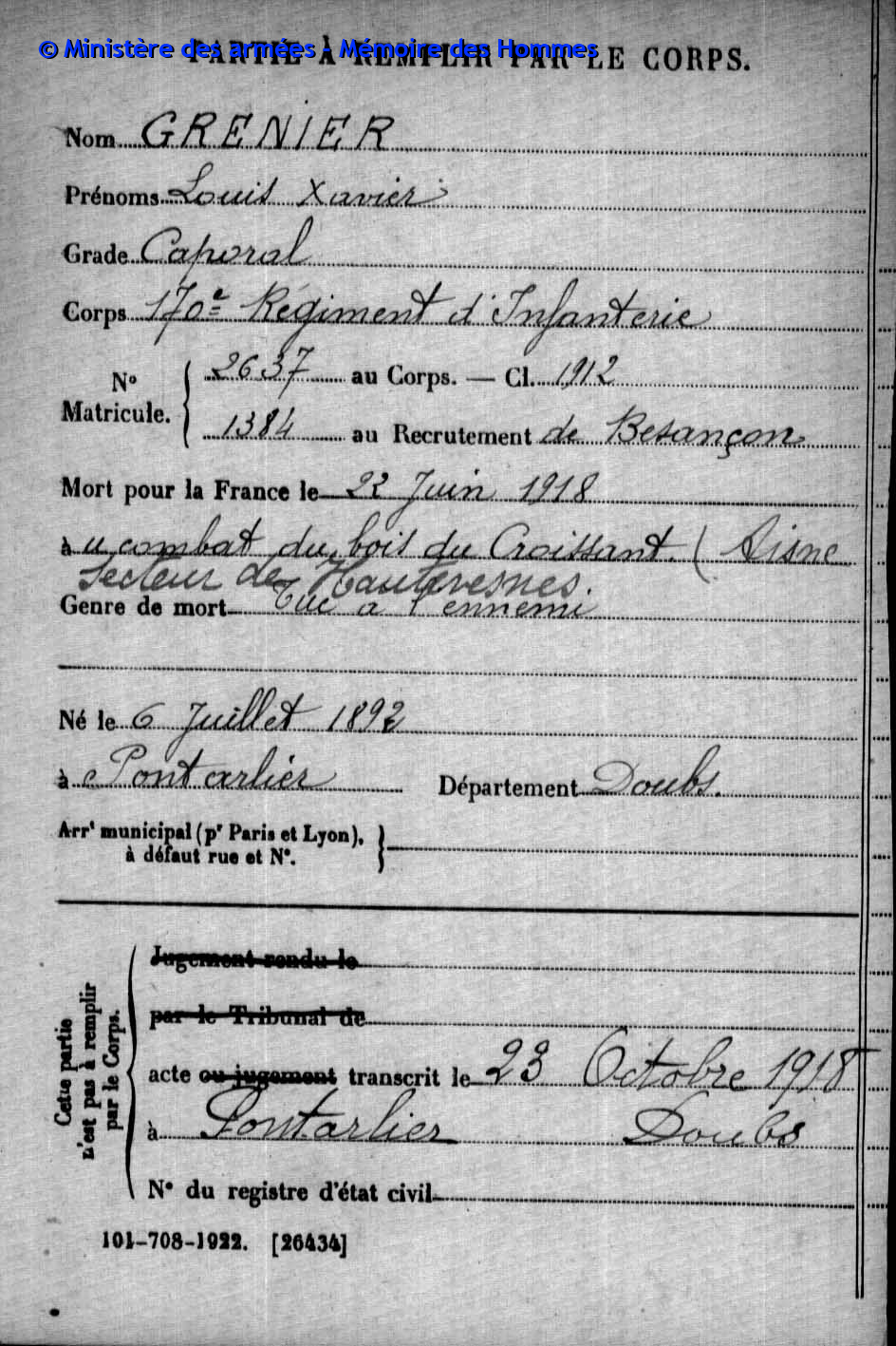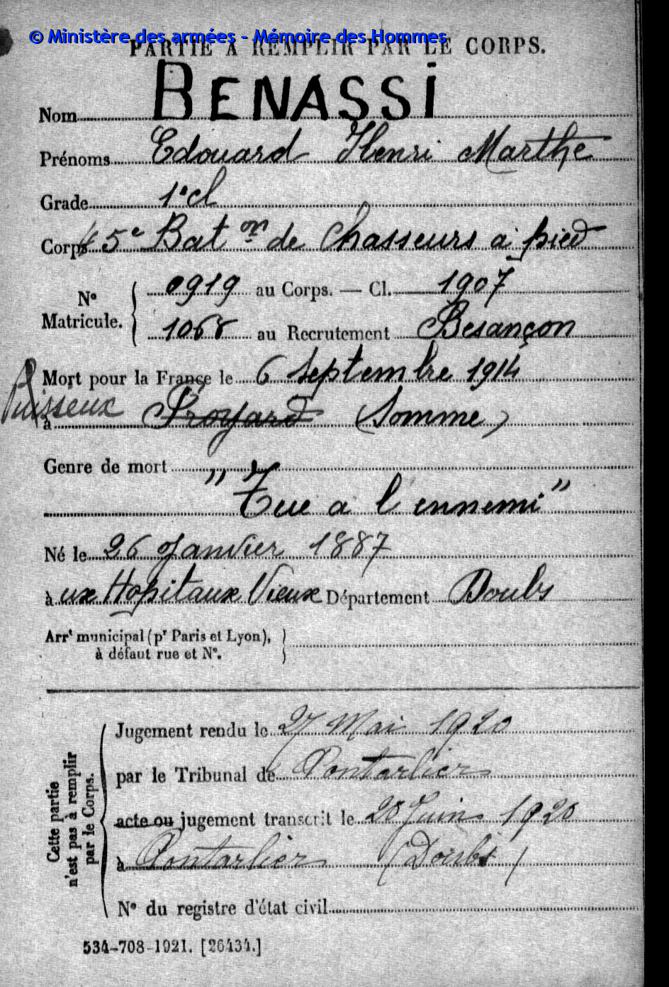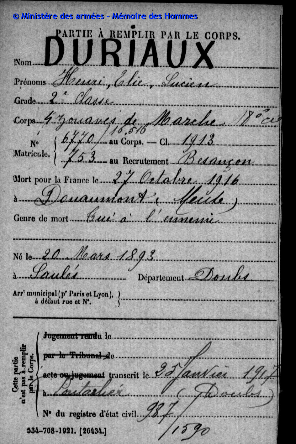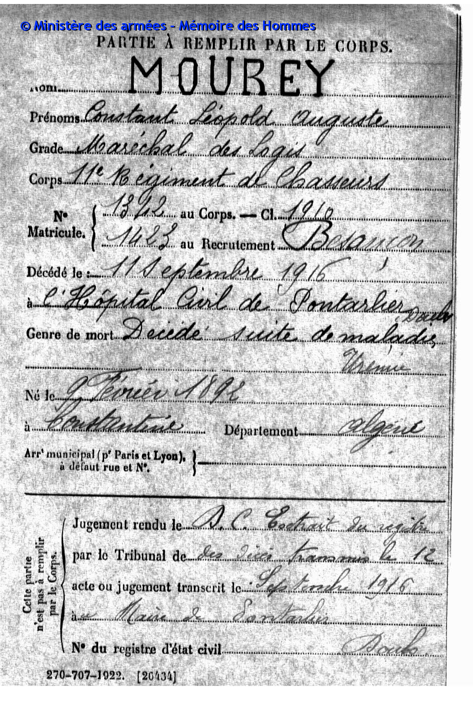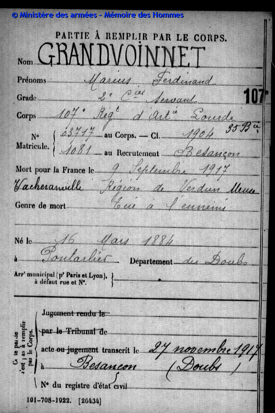 | Chasseur MICHAUD Charles Félicien Fernand 17.05.1877 - 19.08.1916 15ème Bataillon de Chasseurs à Pied Verstarb durch Krankheit ans Kriegsfolgen zu Hause in Pontarlier (F) |