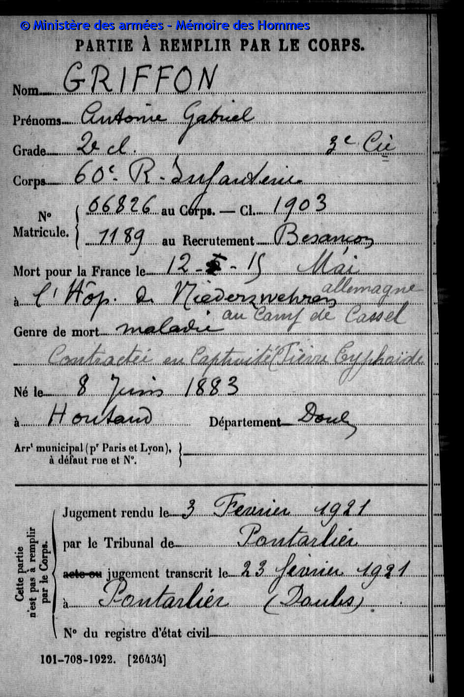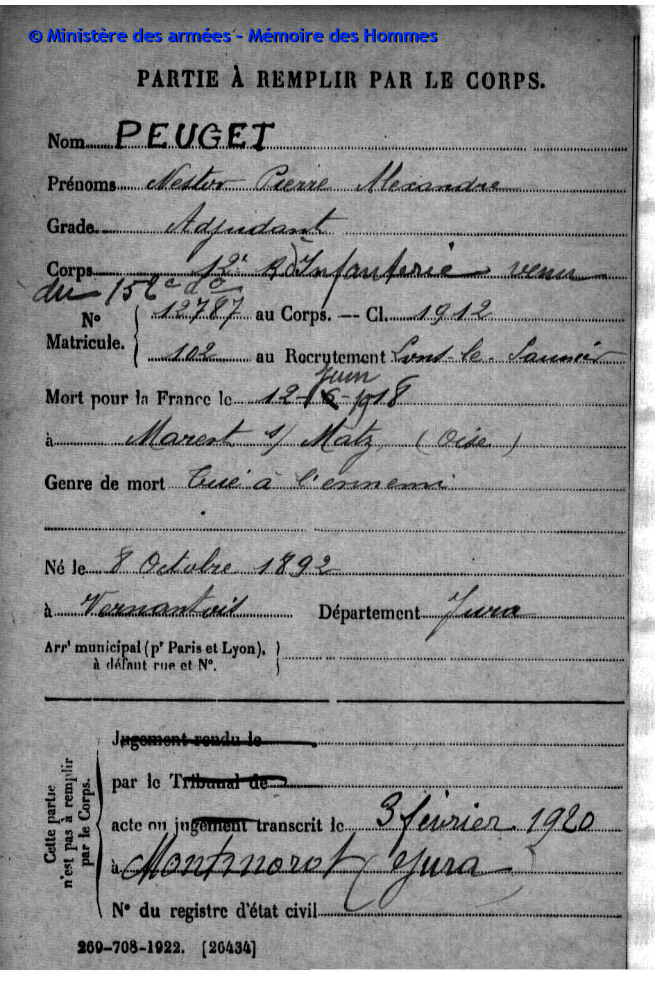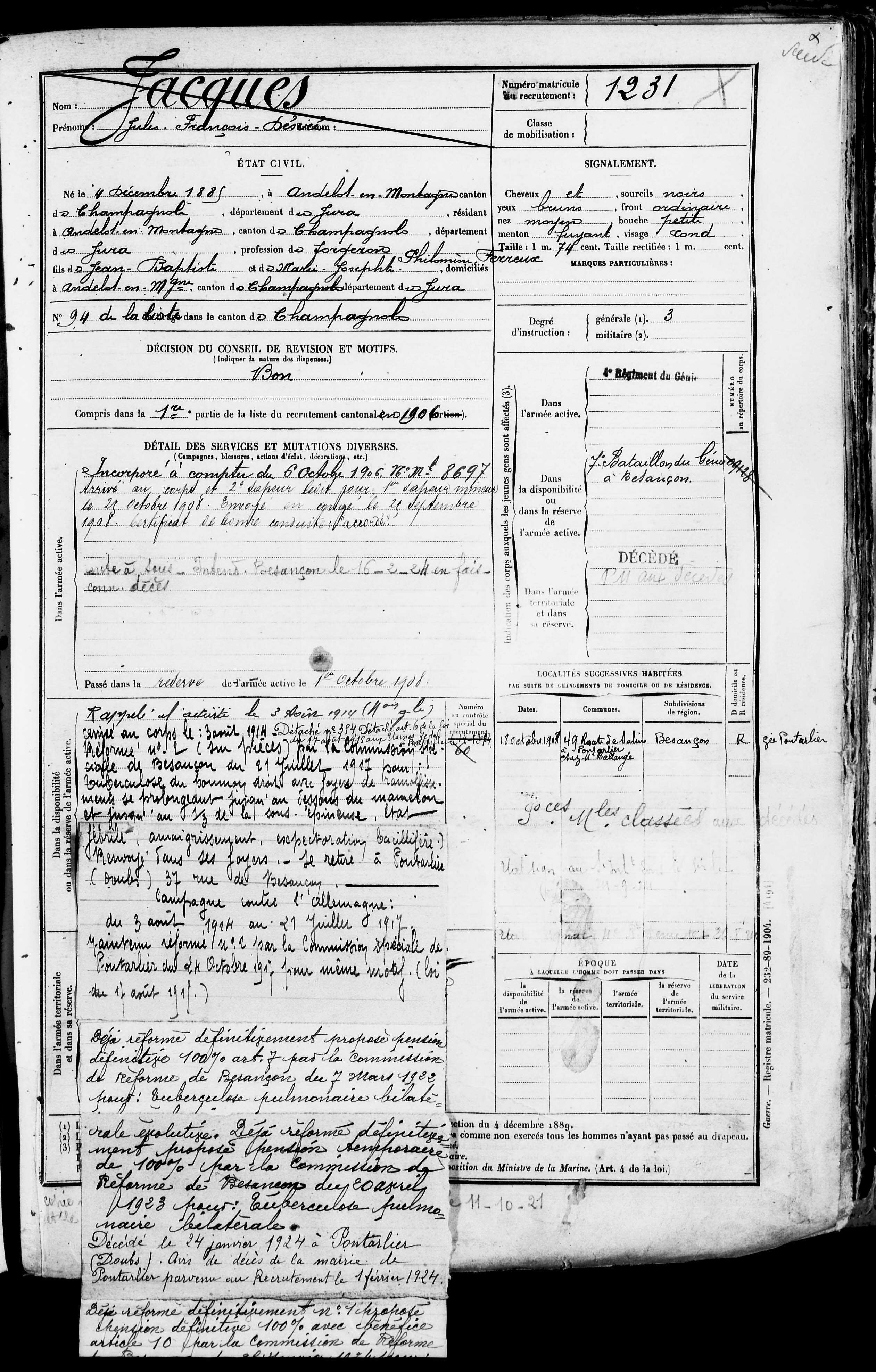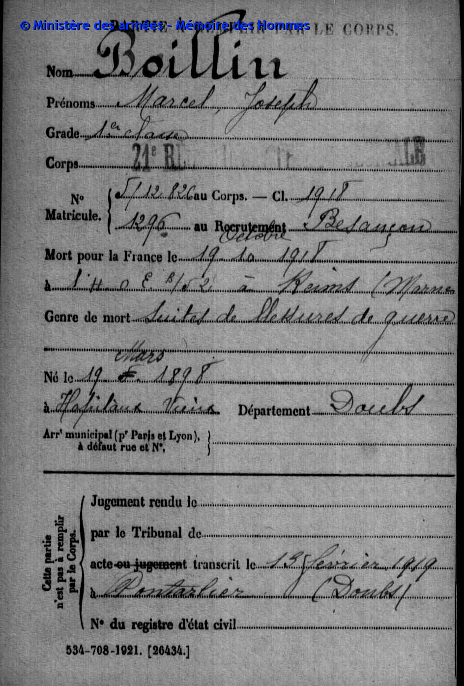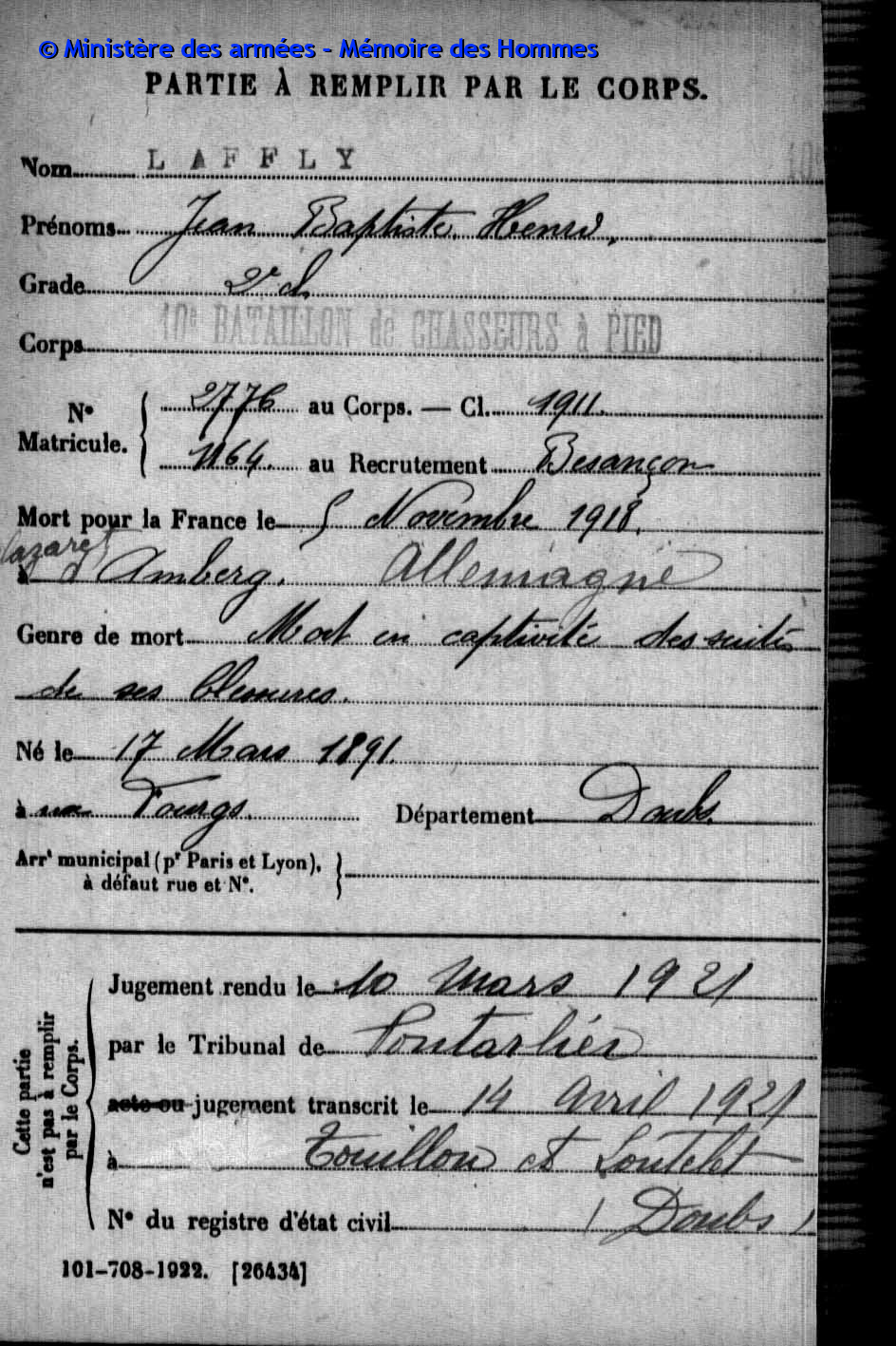 | Chasseur MICHAUD Charles Félicien Fernand 17.05.1877 - 19.08.1916 15ème Bataillon de Chasseurs à Pied Verstarb durch Krankheit ans Kriegsfolgen zu Hause in Pontarlier (F) |