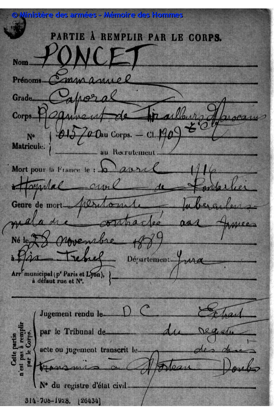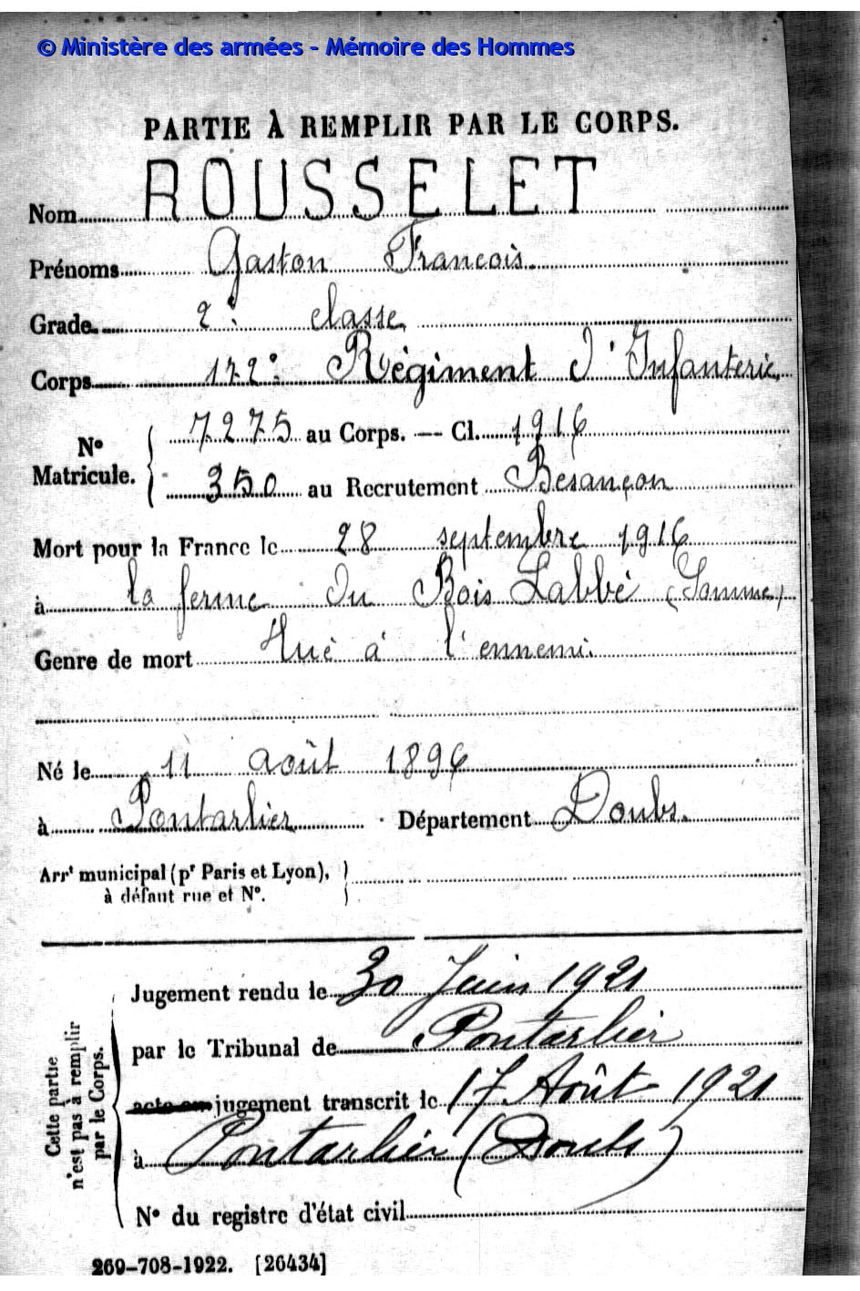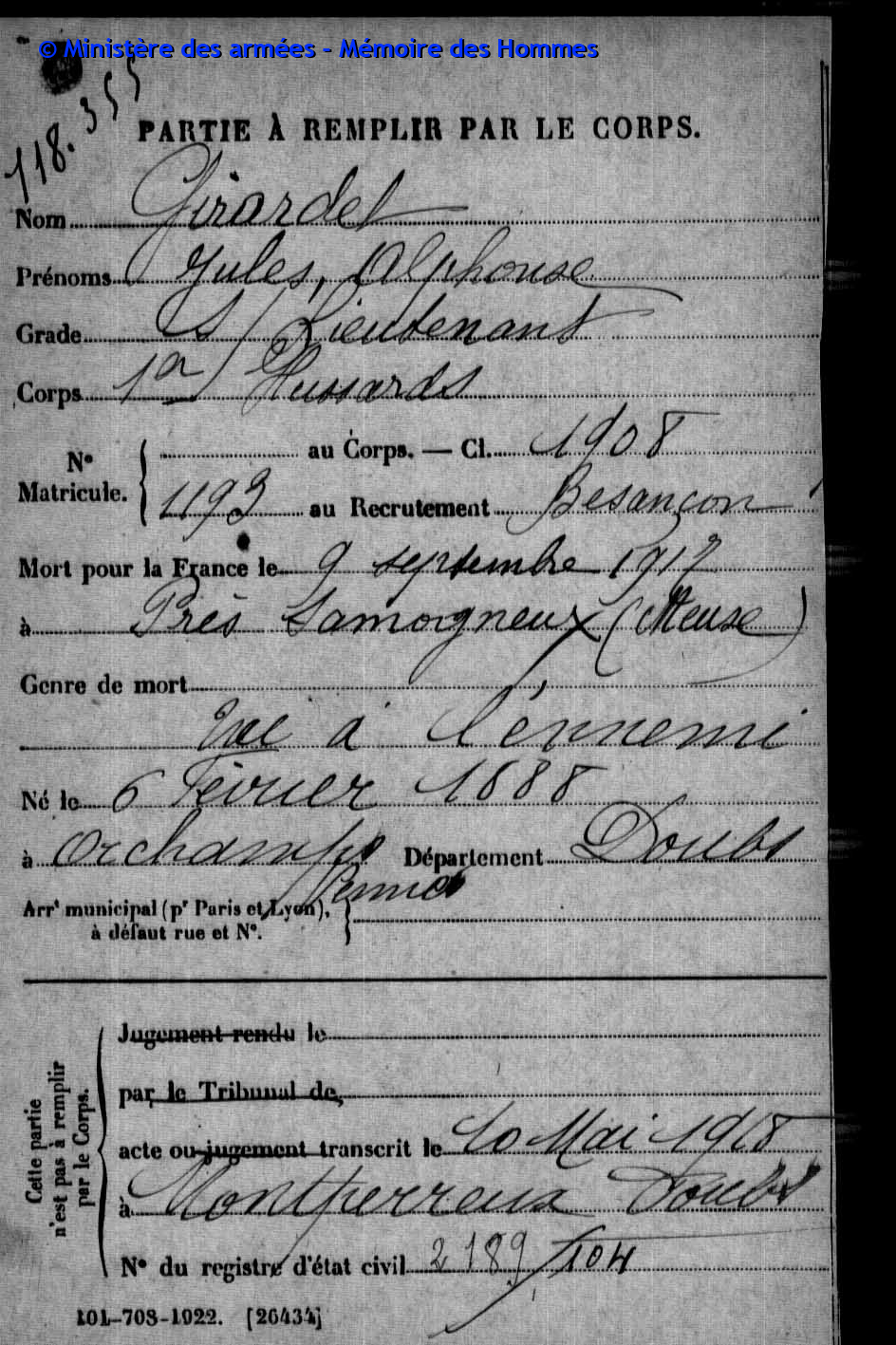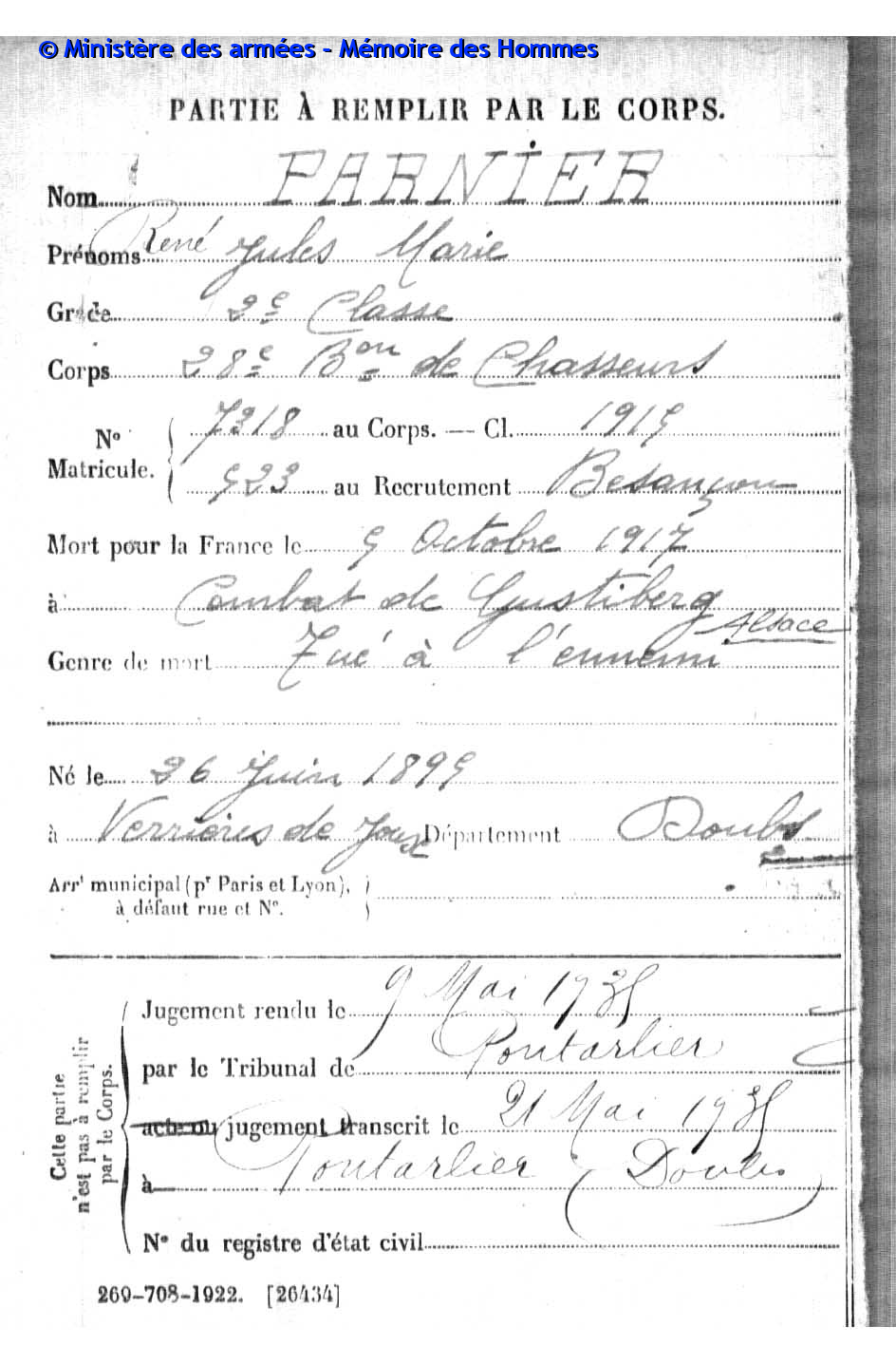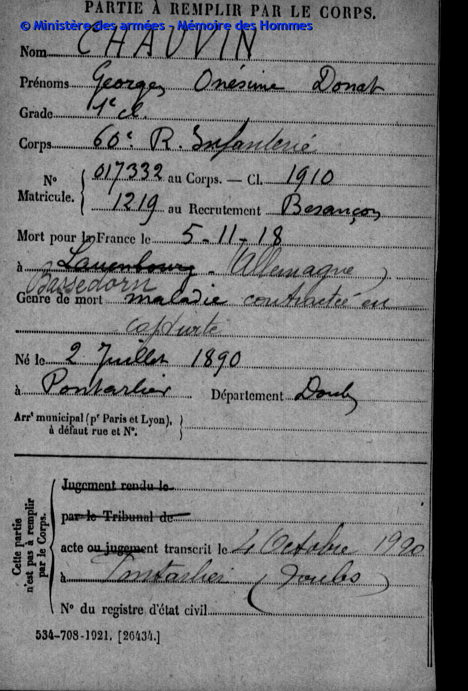 | Chasseur MICHAUD Charles Félicien Fernand 17.05.1877 - 19.08.1916 15ème Bataillon de Chasseurs à Pied Verstarb durch Krankheit ans Kriegsfolgen zu Hause in Pontarlier (F) |