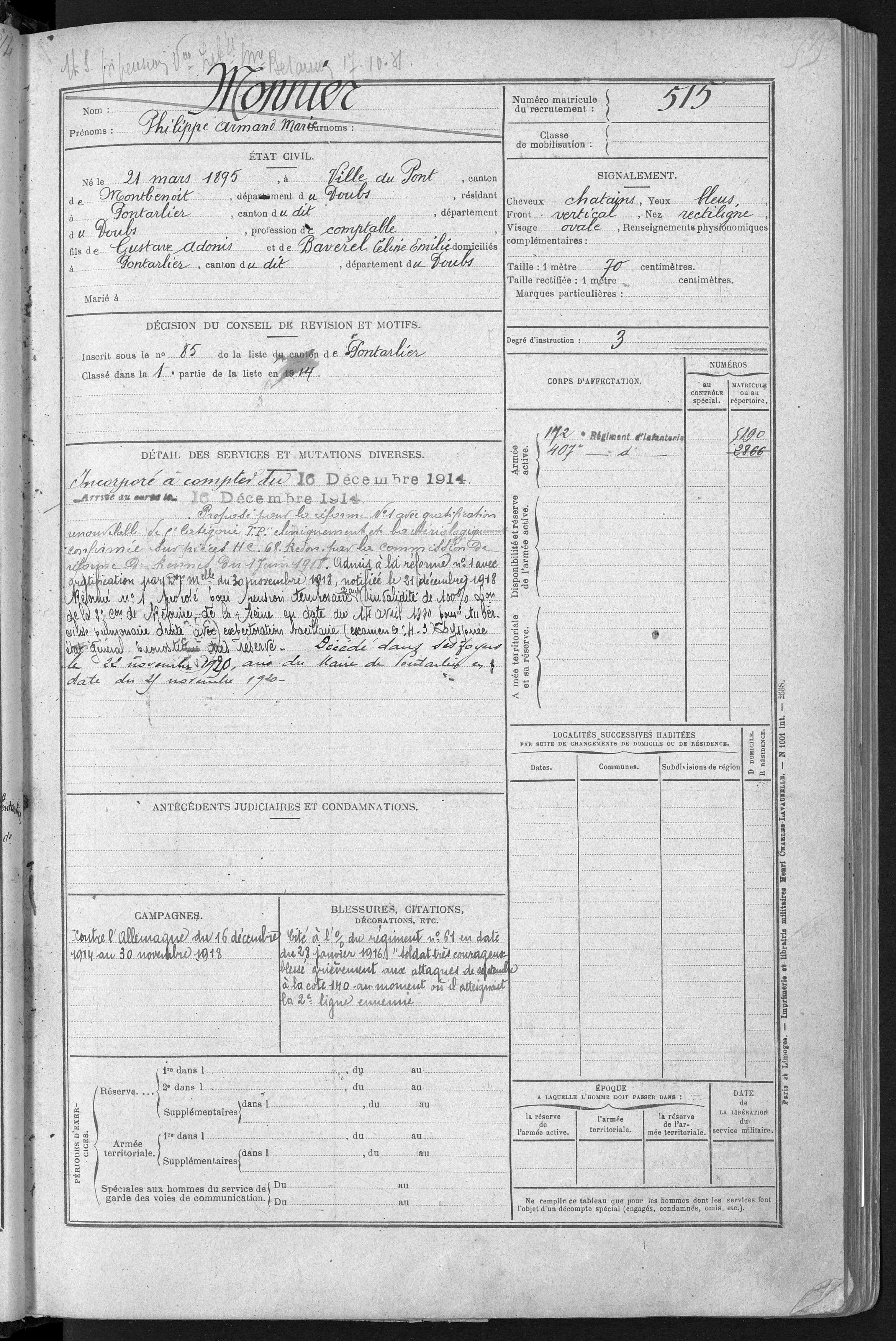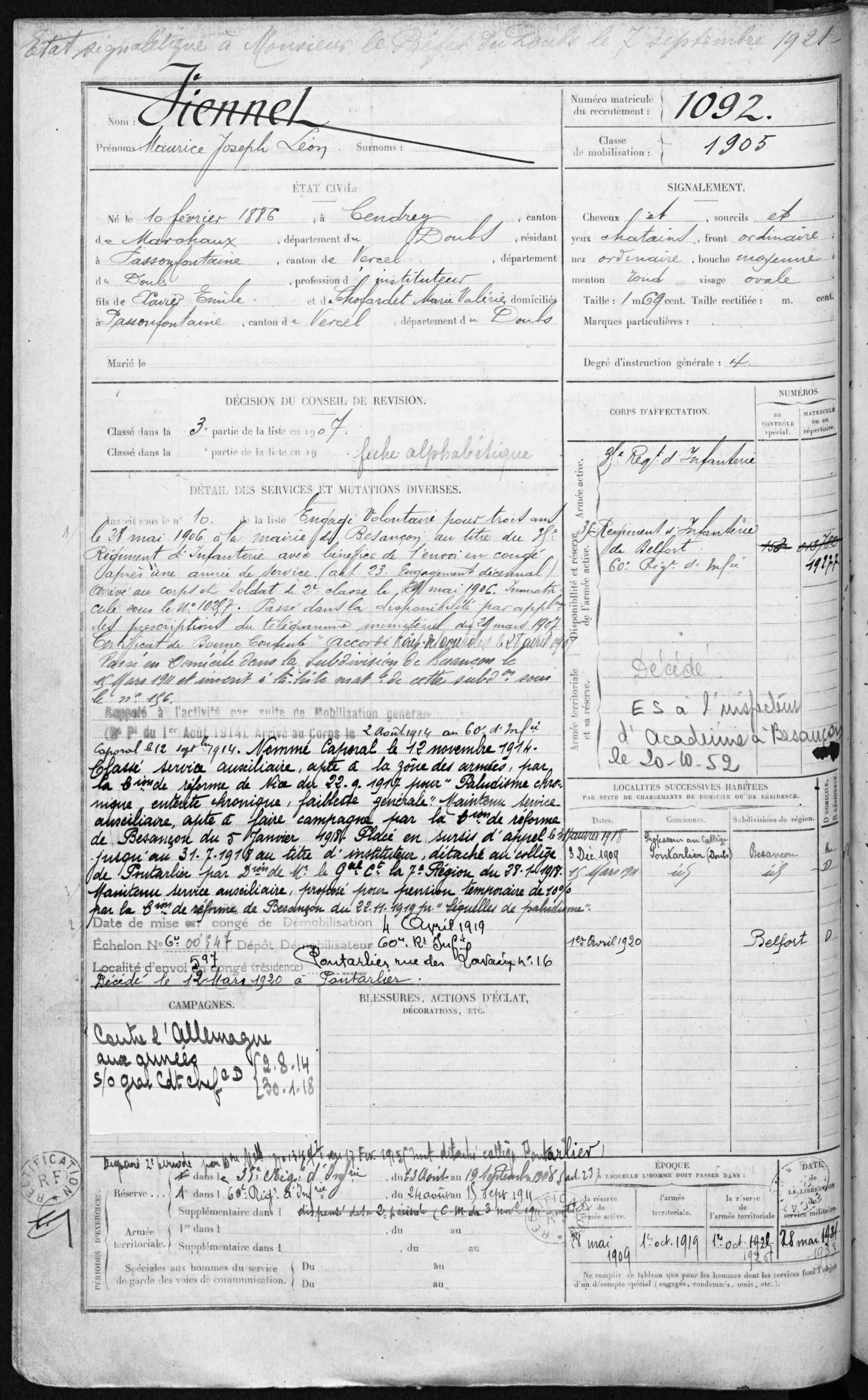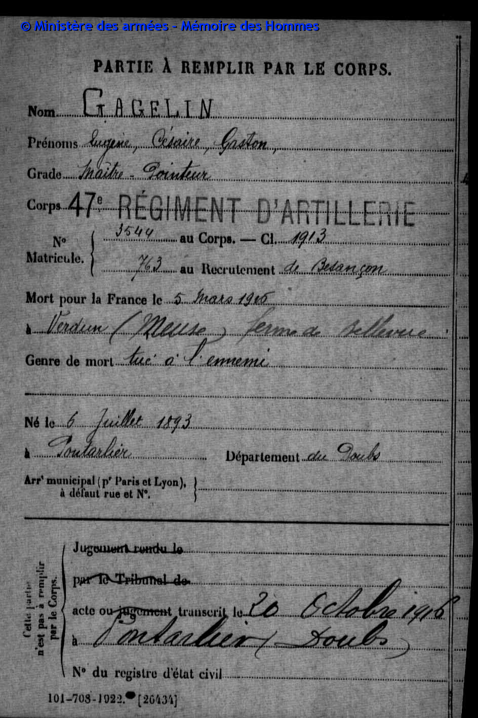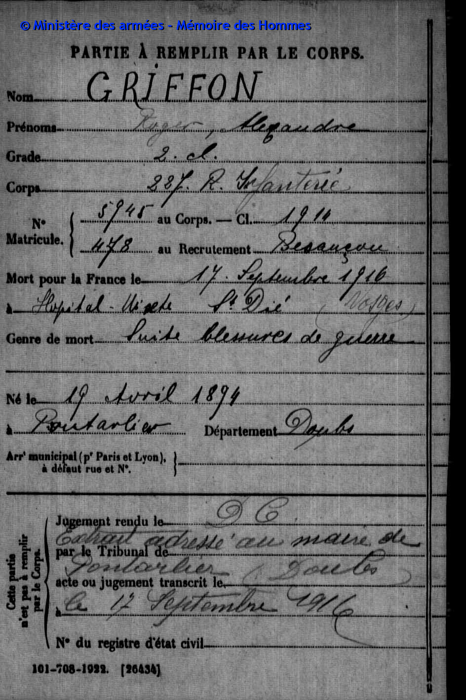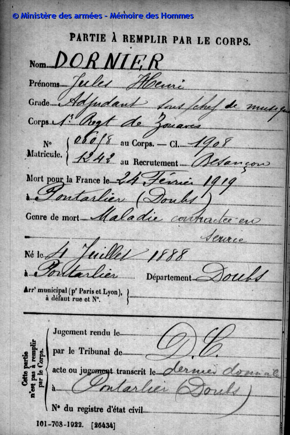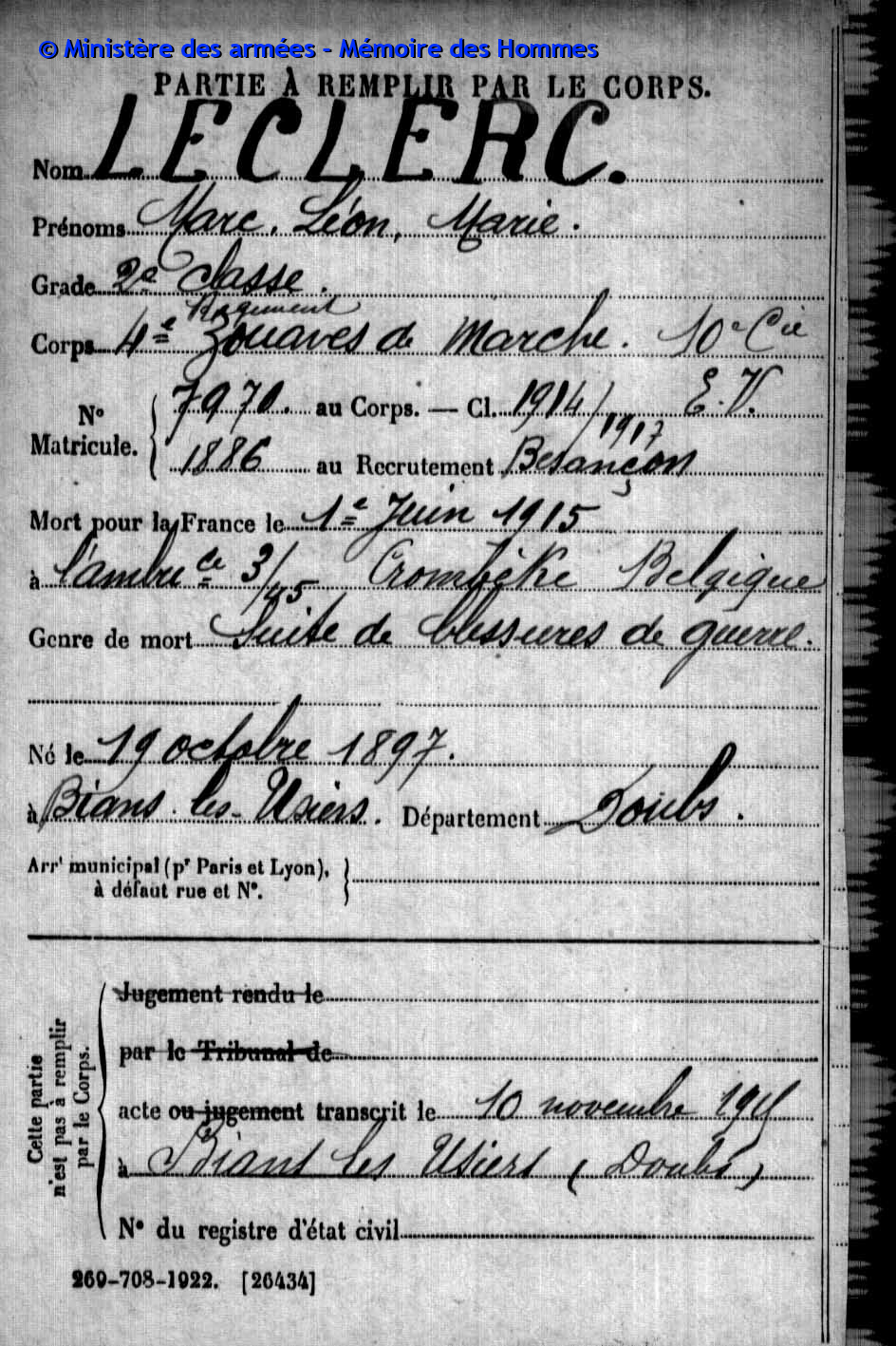 | Chasseur MICHAUD Charles Félicien Fernand 17.05.1877 - 19.08.1916 15ème Bataillon de Chasseurs à Pied Verstarb durch Krankheit ans Kriegsfolgen zu Hause in Pontarlier (F) |