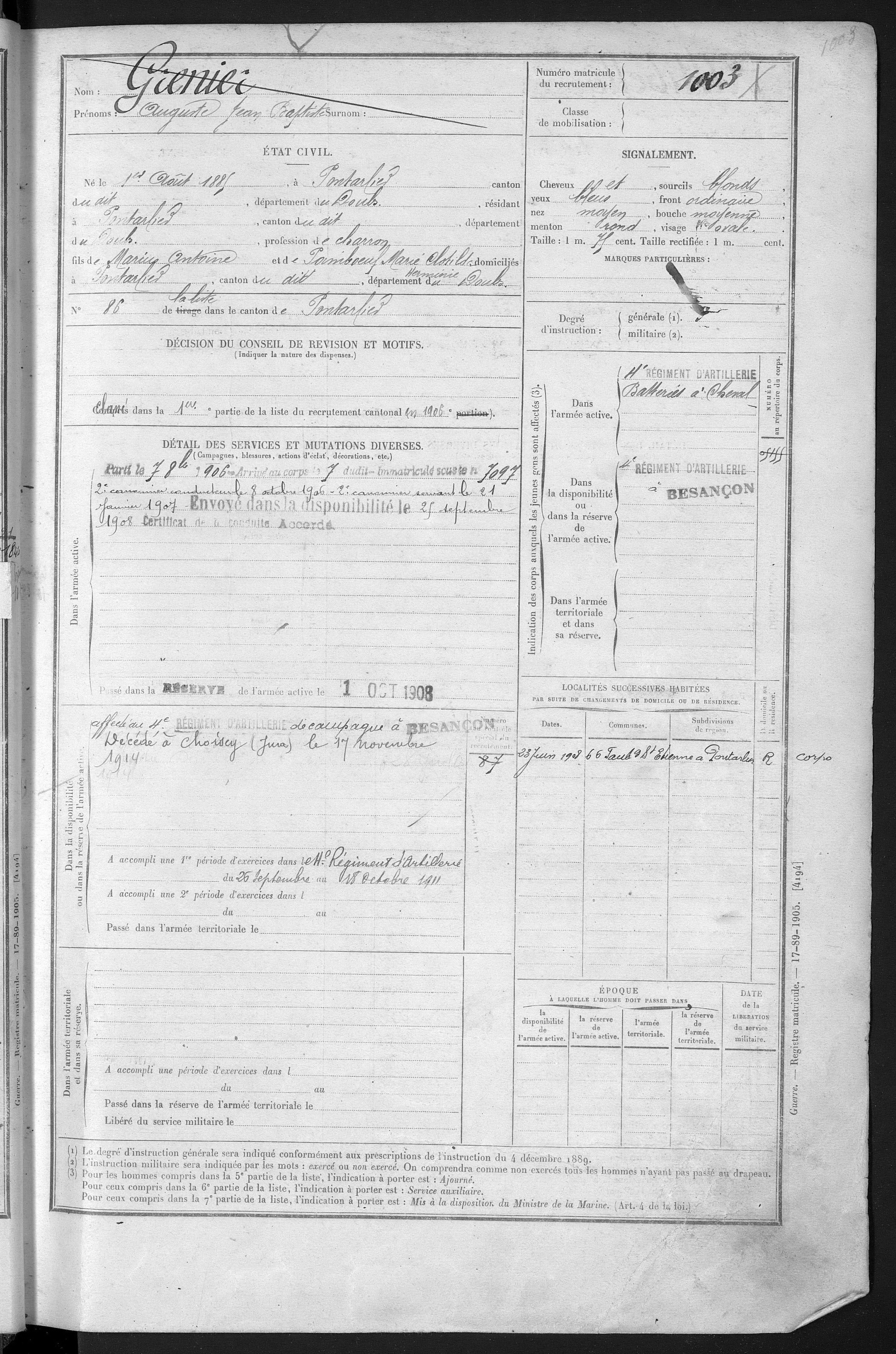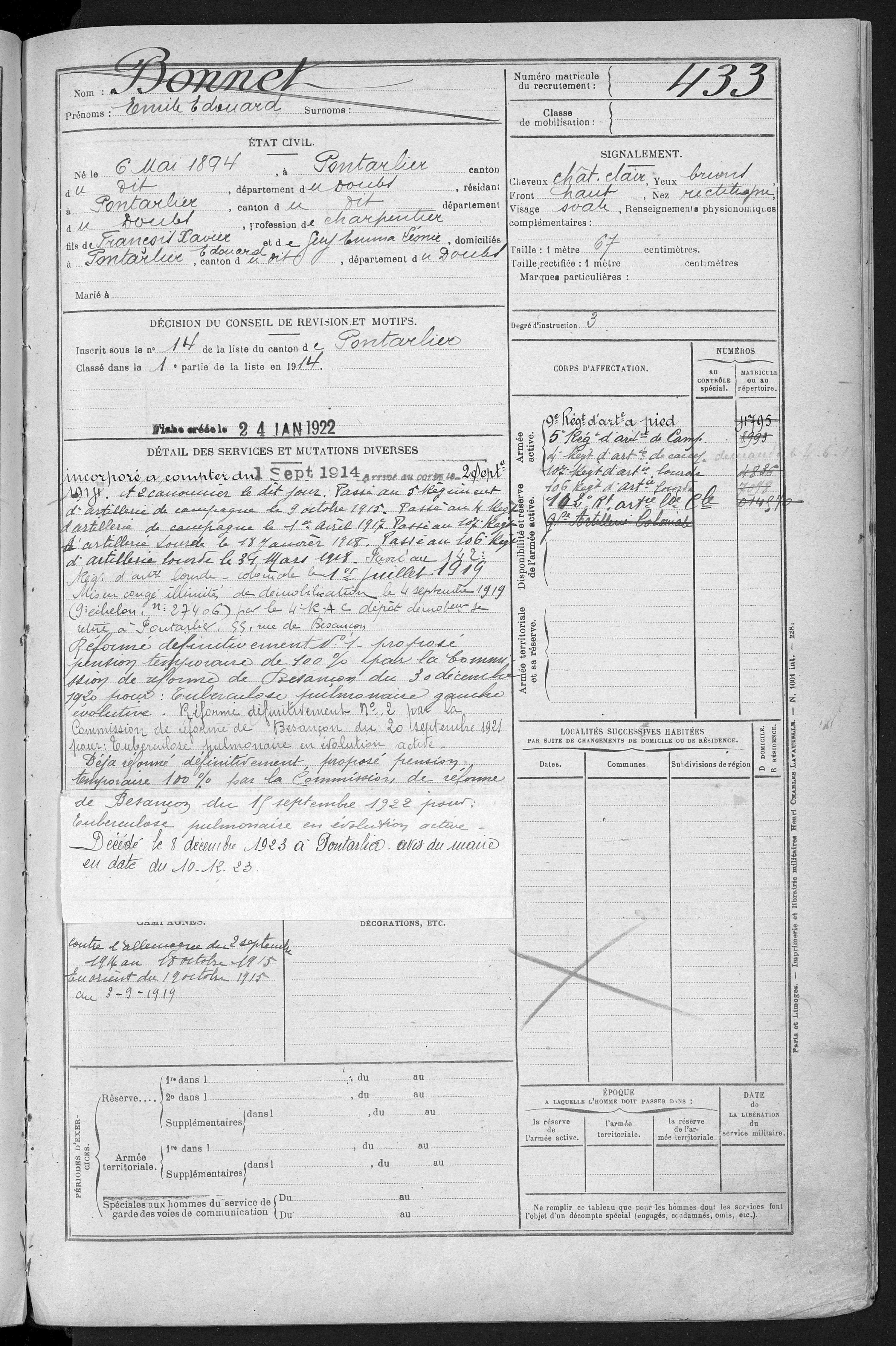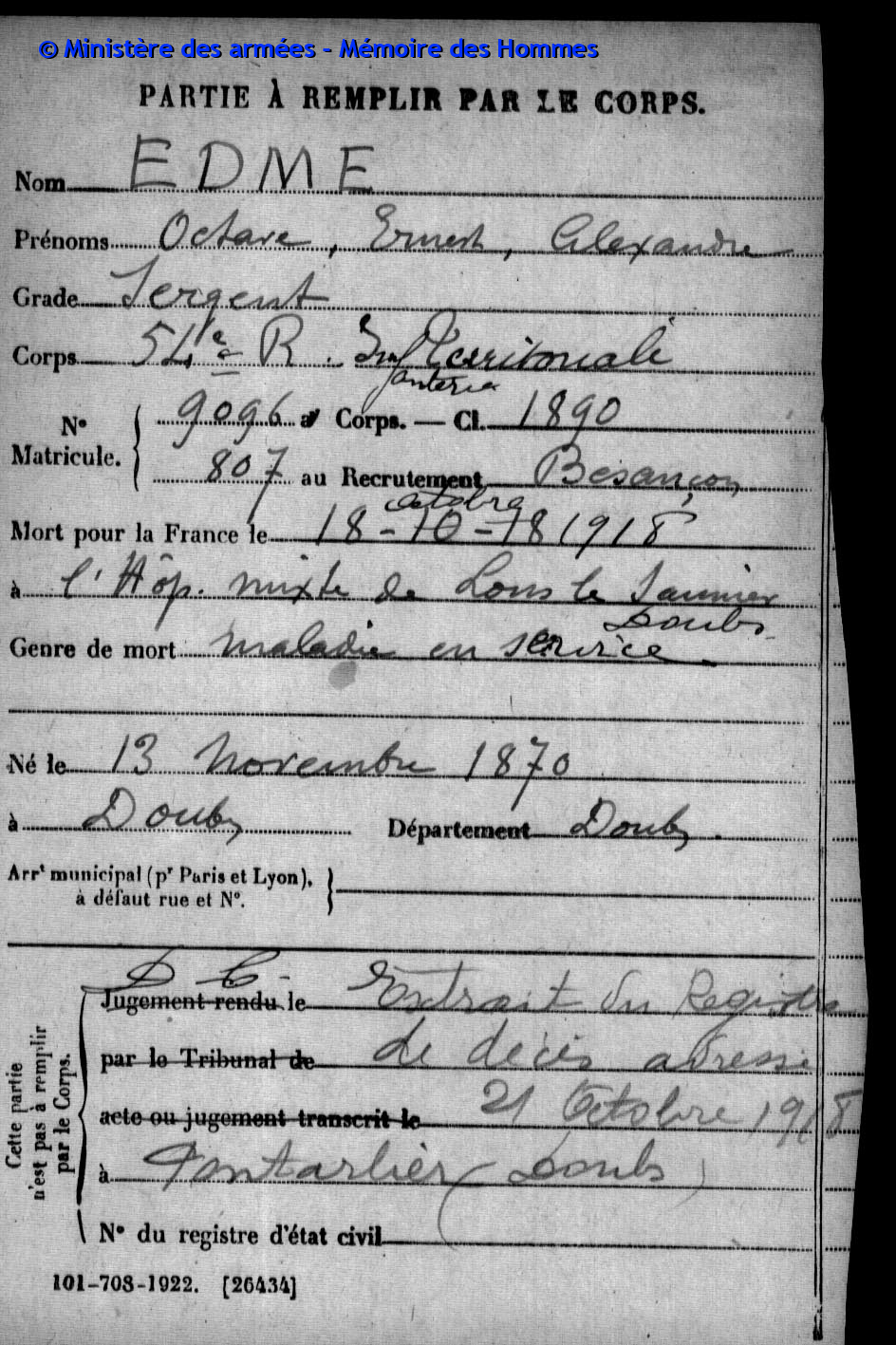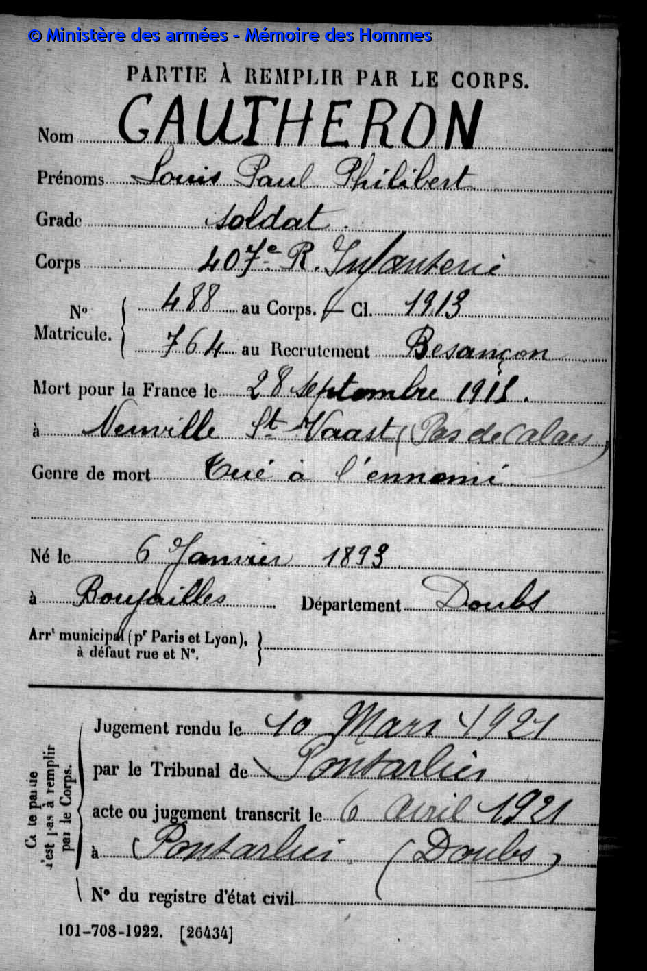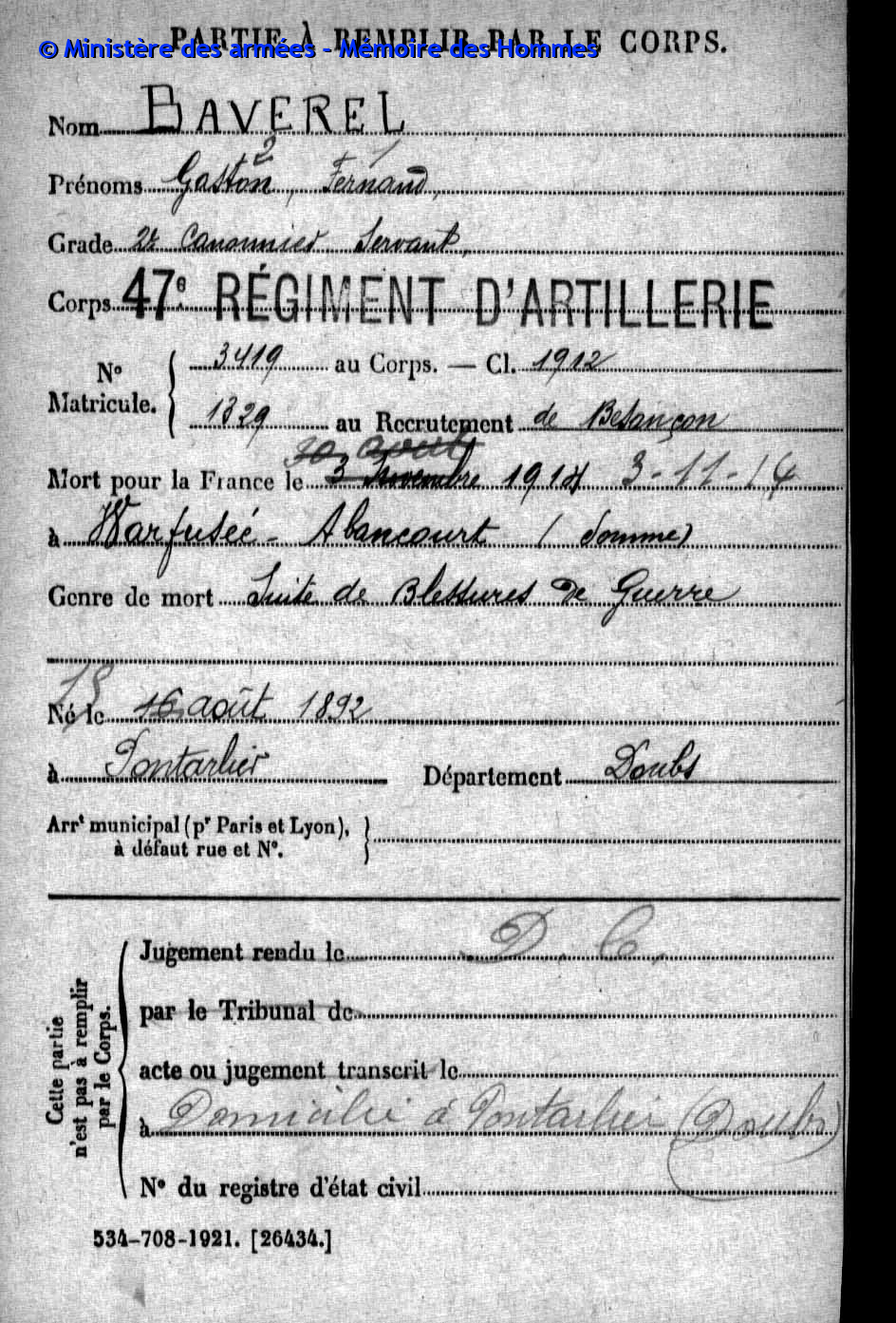 | Chasseur MICHAUD Charles Félicien Fernand 17.05.1877 - 19.08.1916 15ème Bataillon de Chasseurs à Pied Verstarb durch Krankheit ans Kriegsfolgen zu Hause in Pontarlier (F) |