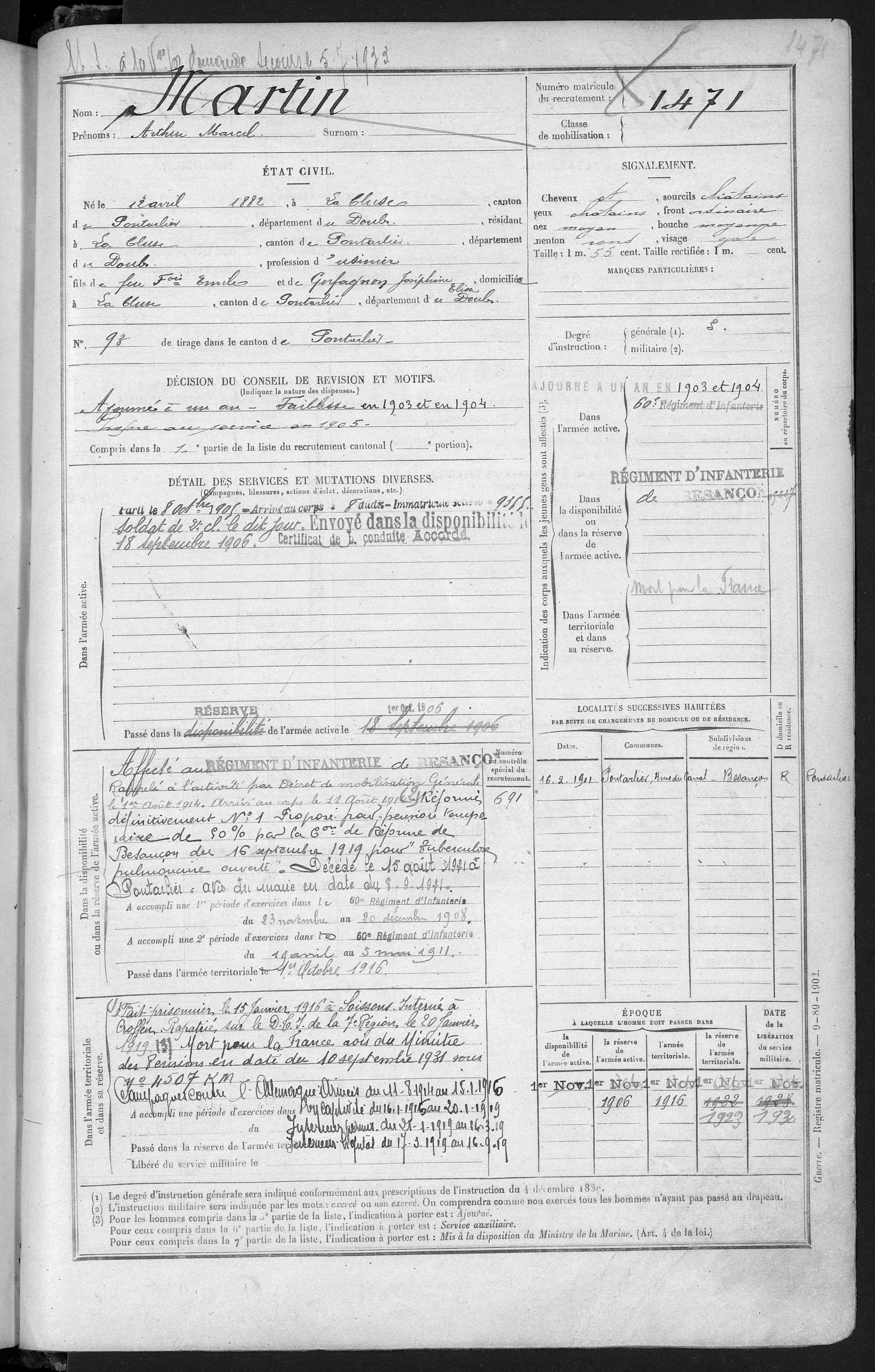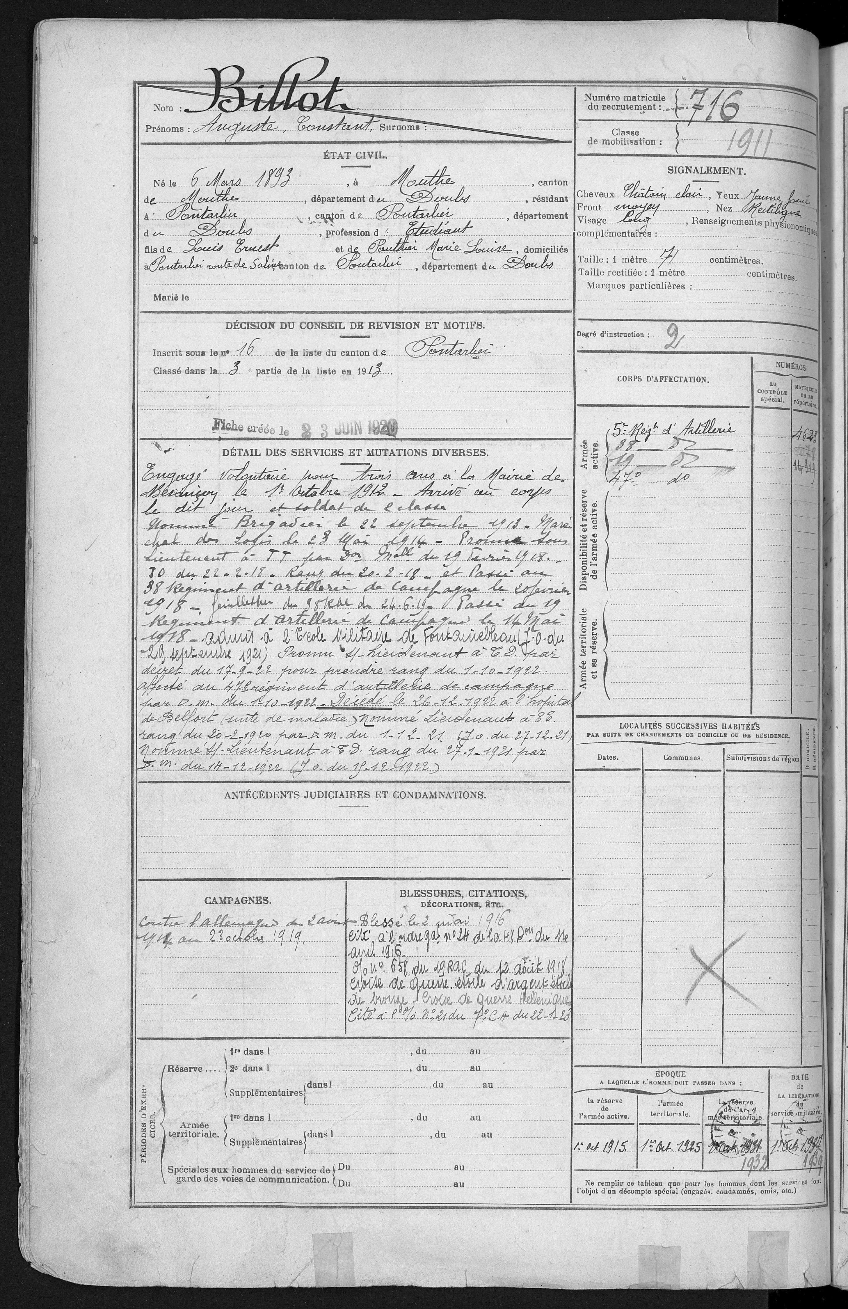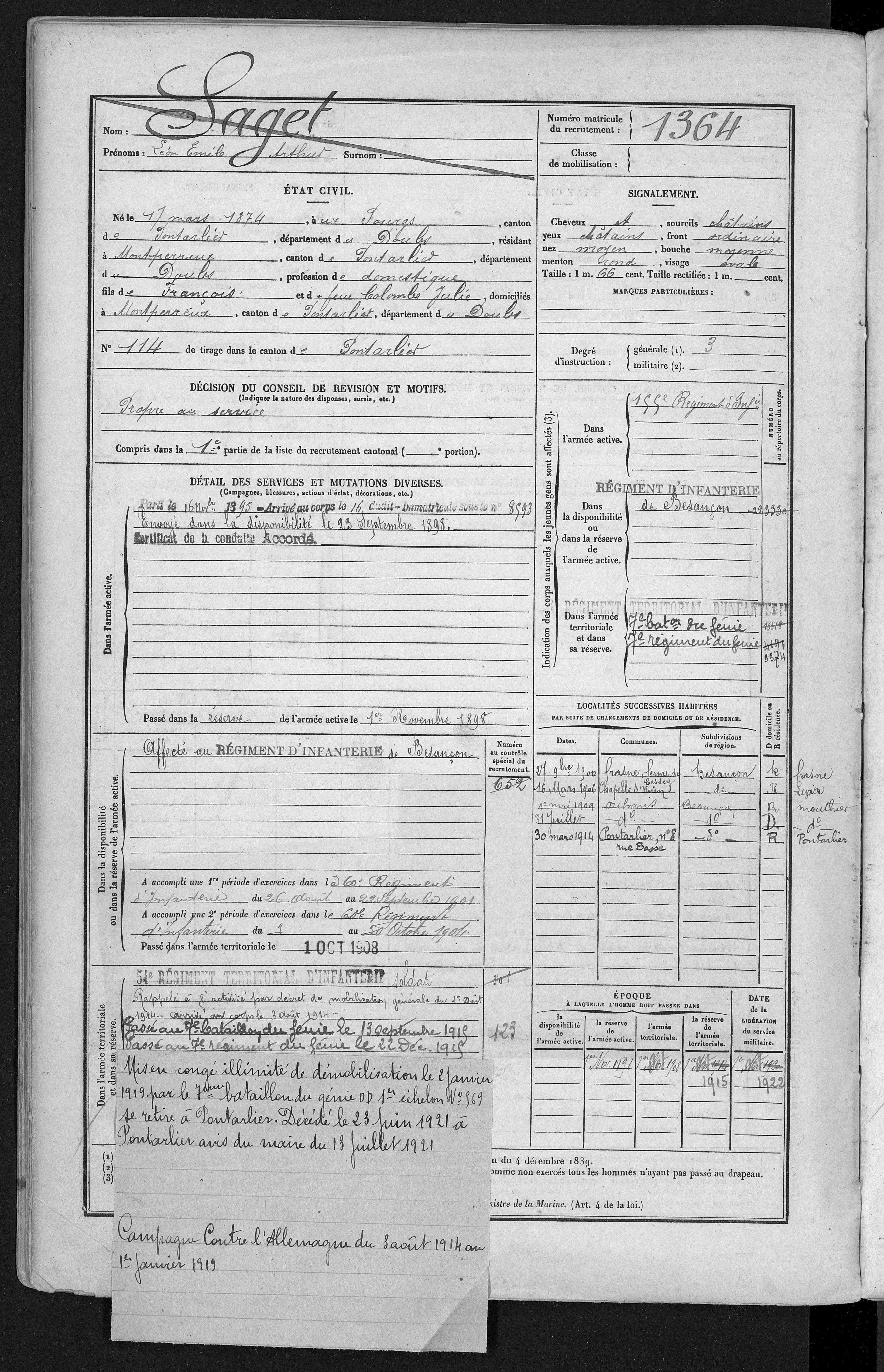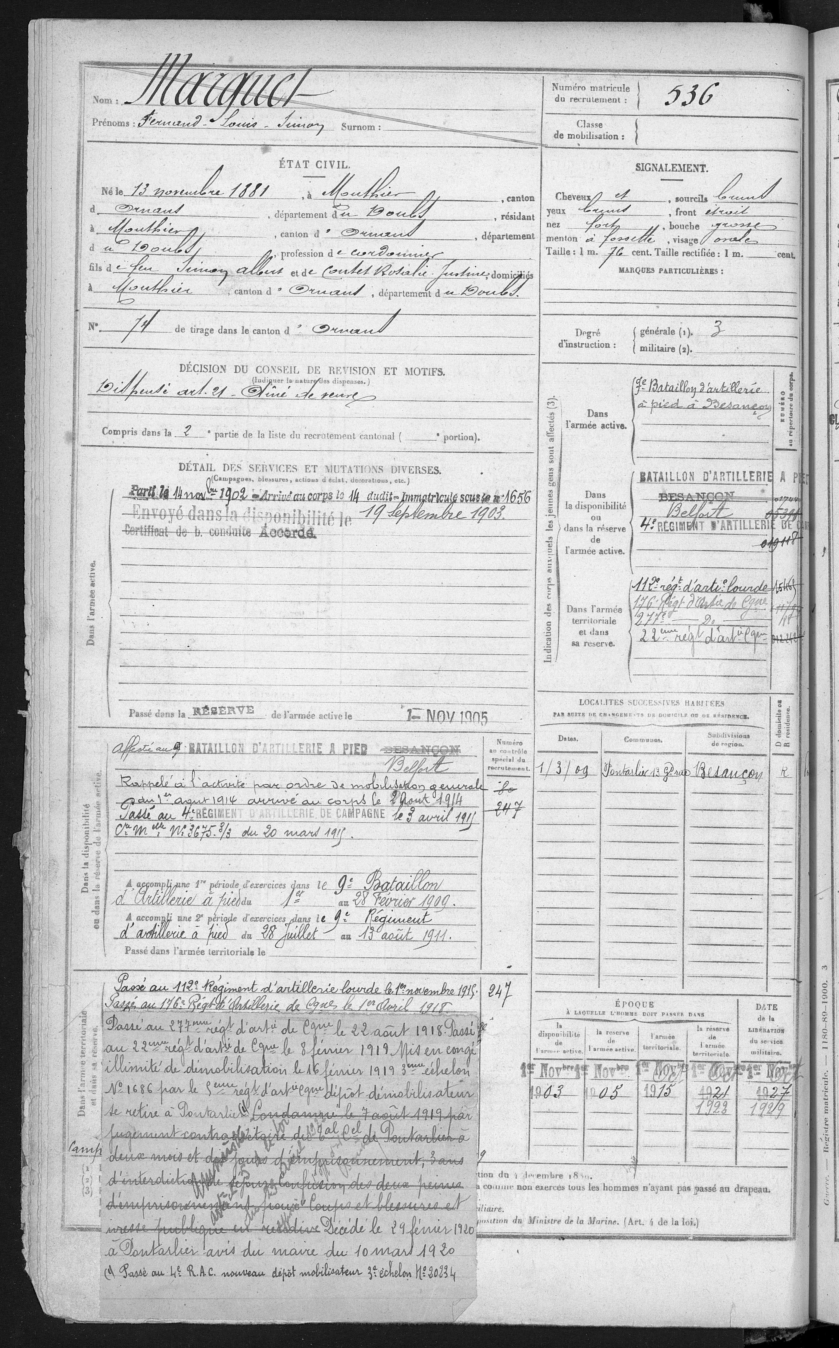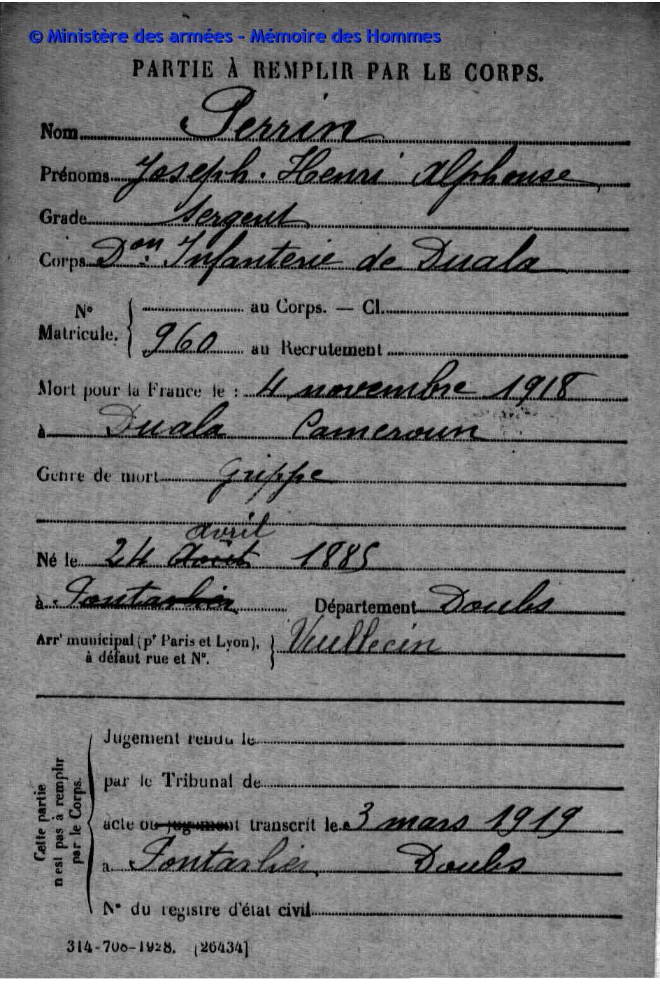 | Chasseur MICHAUD Charles Félicien Fernand 17.05.1877 - 19.08.1916 15ème Bataillon de Chasseurs à Pied Verstarb durch Krankheit ans Kriegsfolgen zu Hause in Pontarlier (F) |