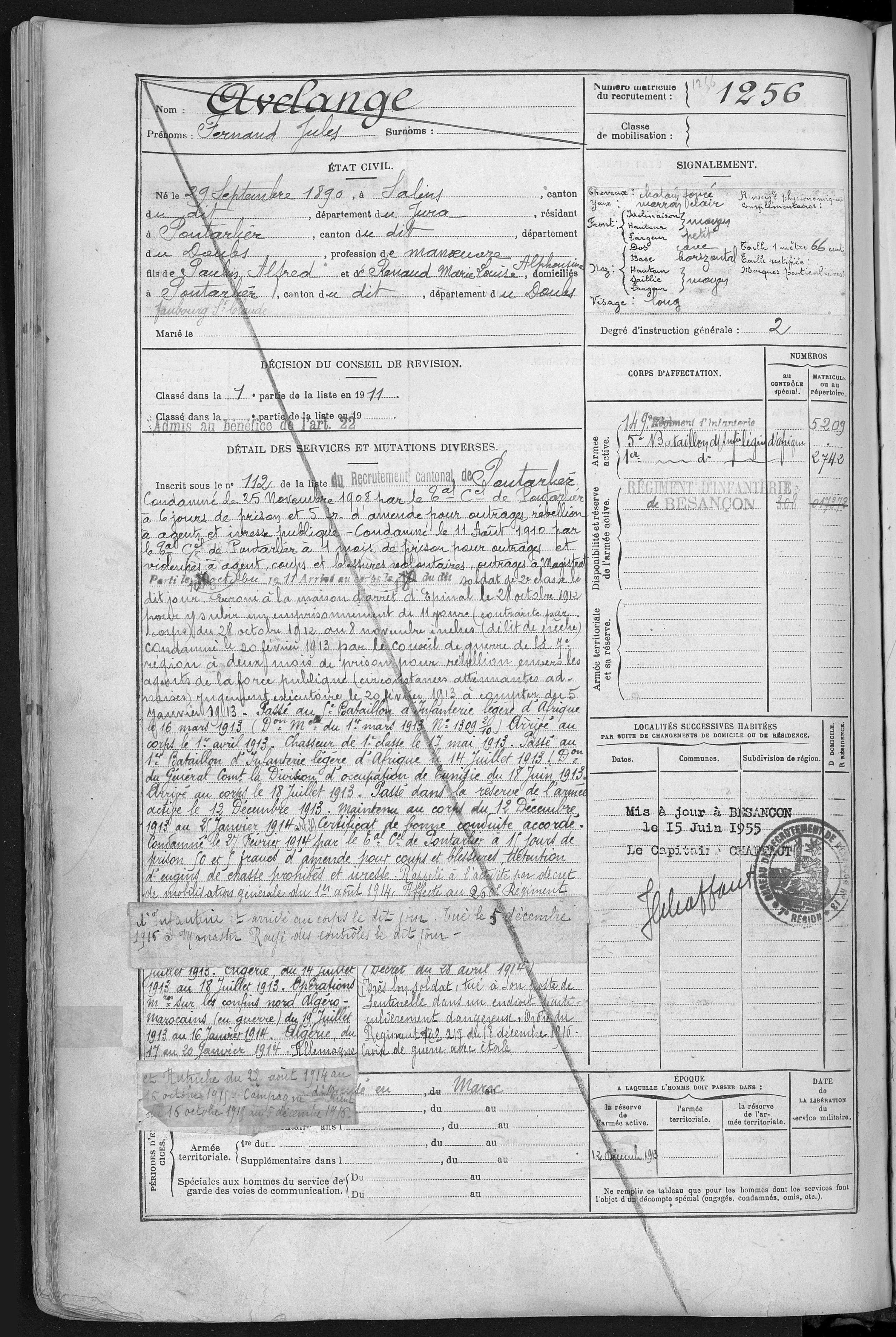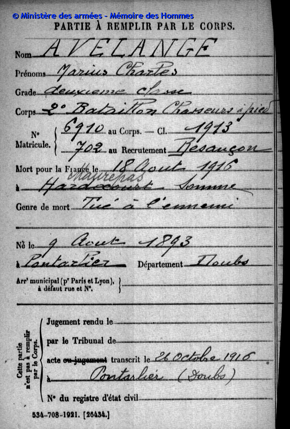 2ème classe AVELANGE Marius Charles 09.08.1893 - 18.08.1916 2ème Bataillon de Chasseurs à Pied Gefallen in Maurepas - Somme (F) |