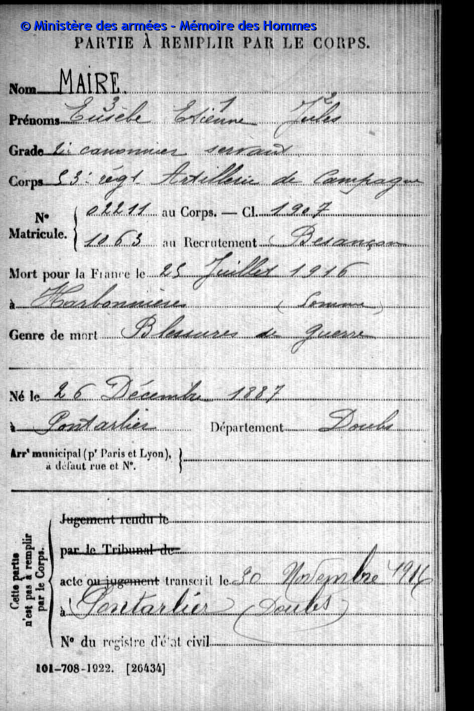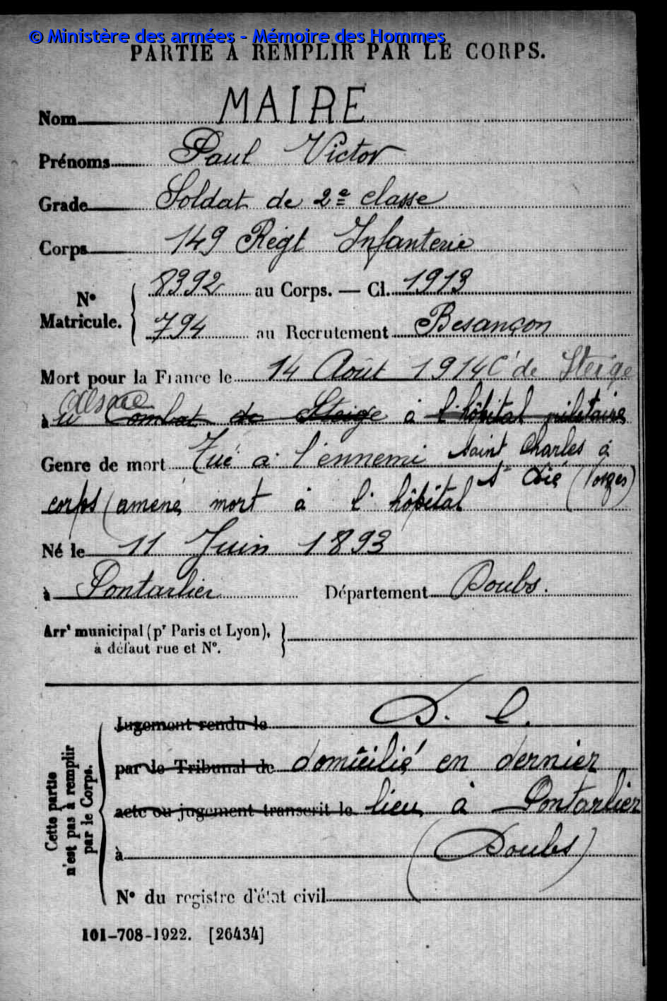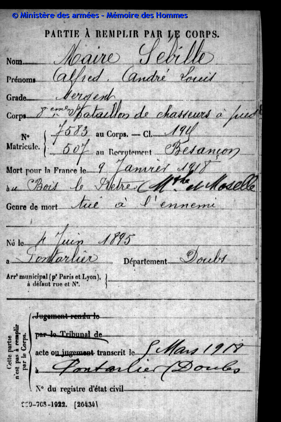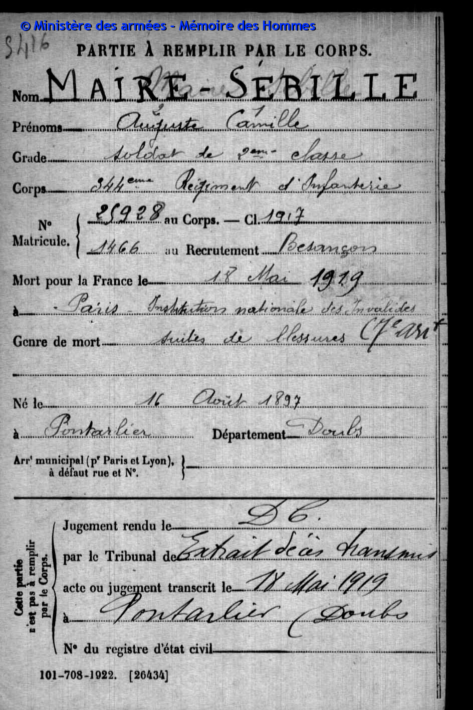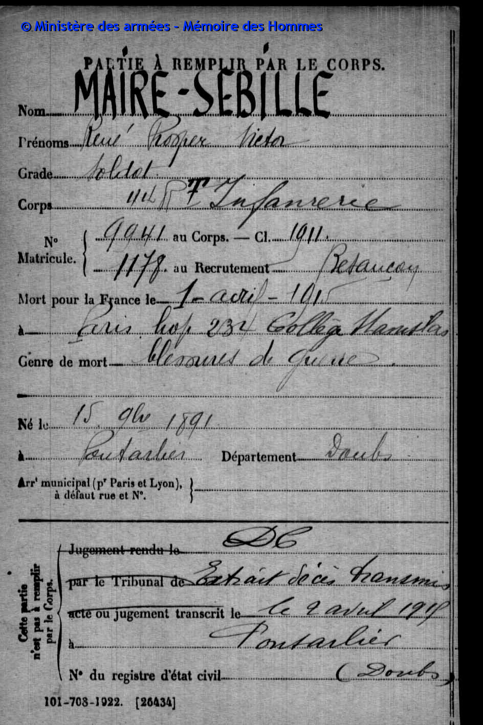 | Soldat MAIRE-SEBILLE René Prosper Victor 15.11.1891 - 01.04.1915 44ème Régiment d'Infanterie Verstarb an seinen Wunden im Hôpital No. 232 in Paris (F) |
