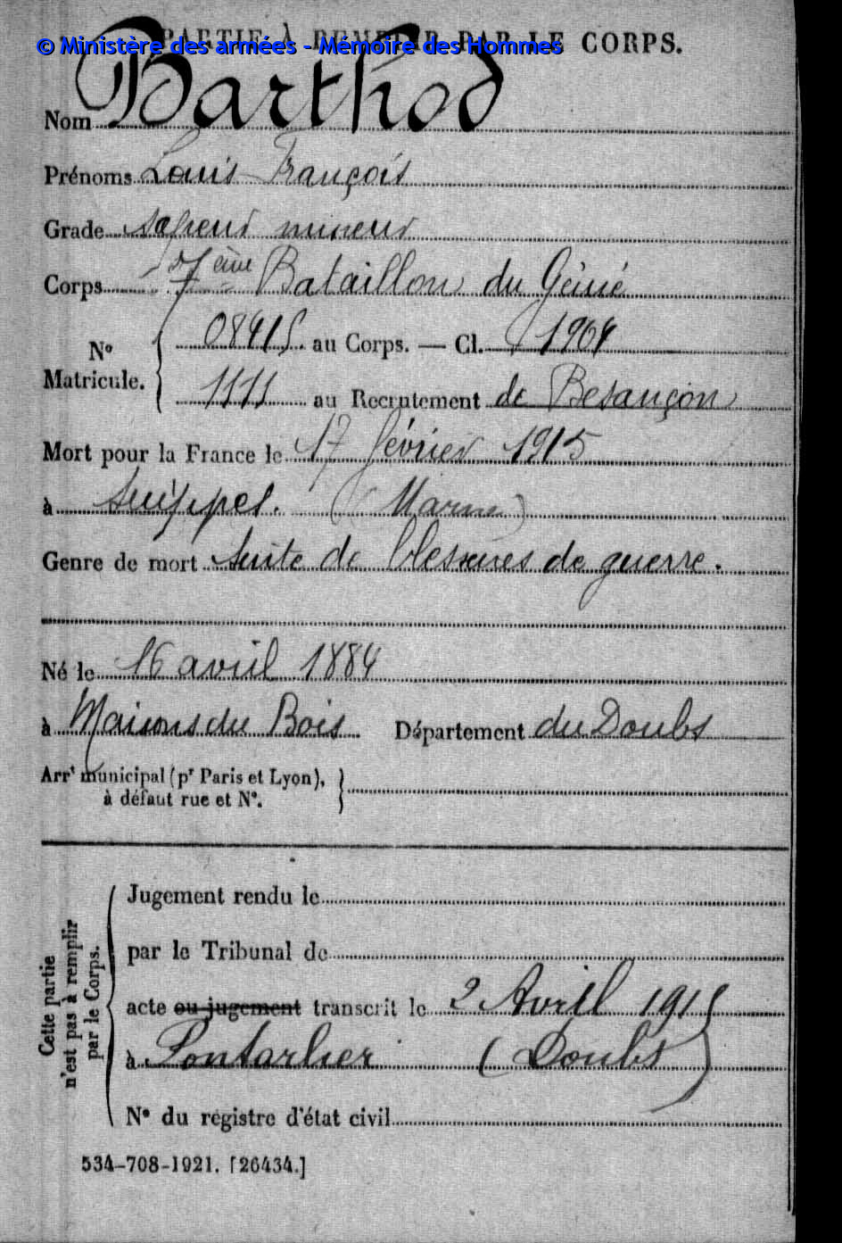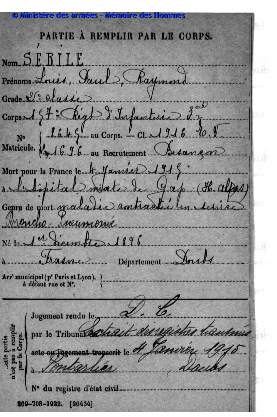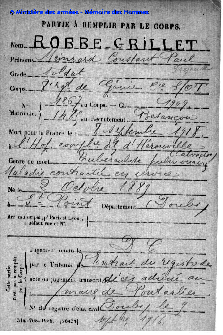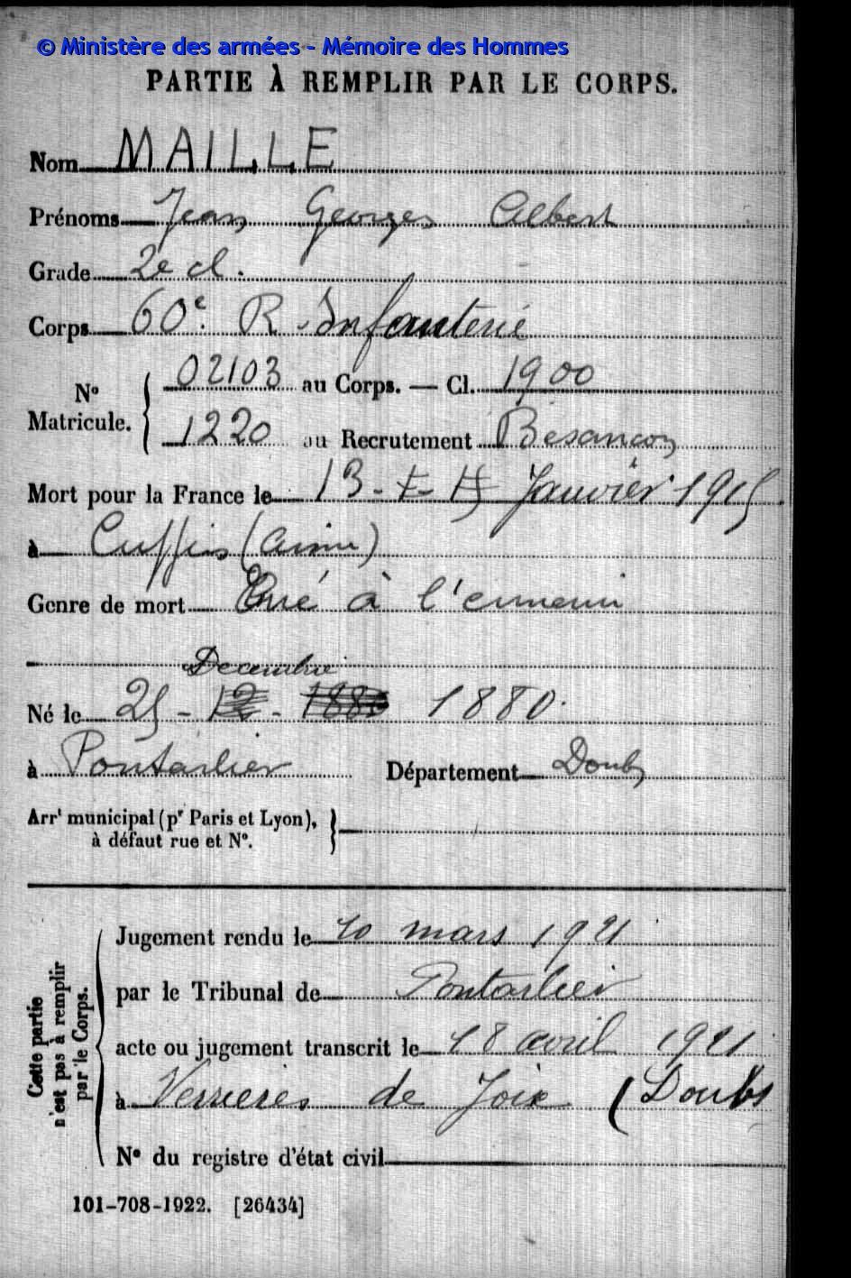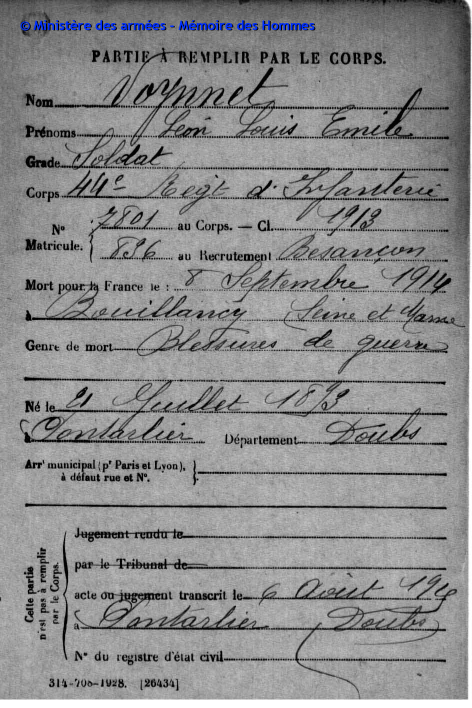 | Soldat MAIRE-SEBILLE René Prosper Victor 15.11.1891 - 01.04.1915 44ème Régiment d'Infanterie Verstarb an seinen Wunden im Hôpital No. 232 in Paris (F) |