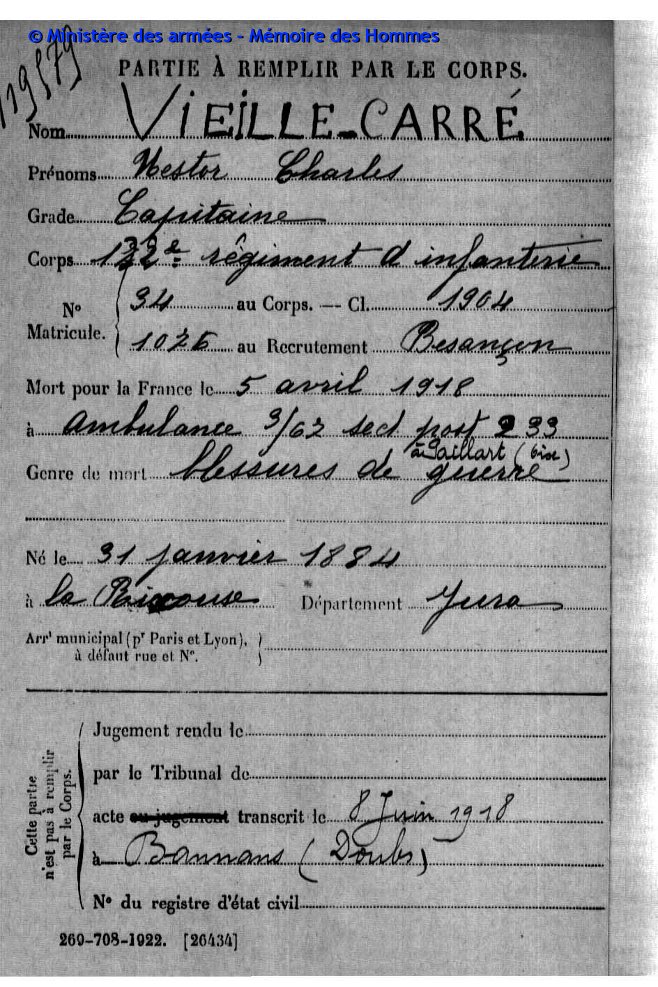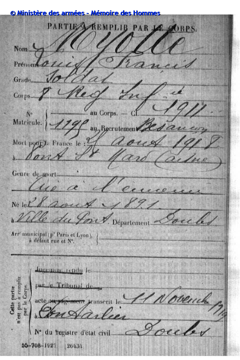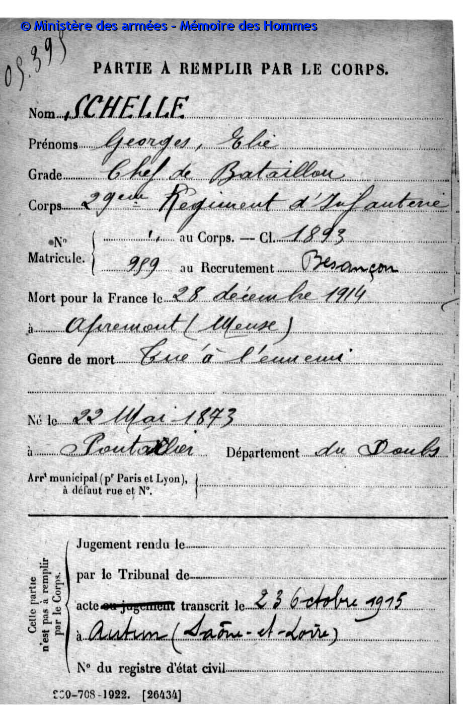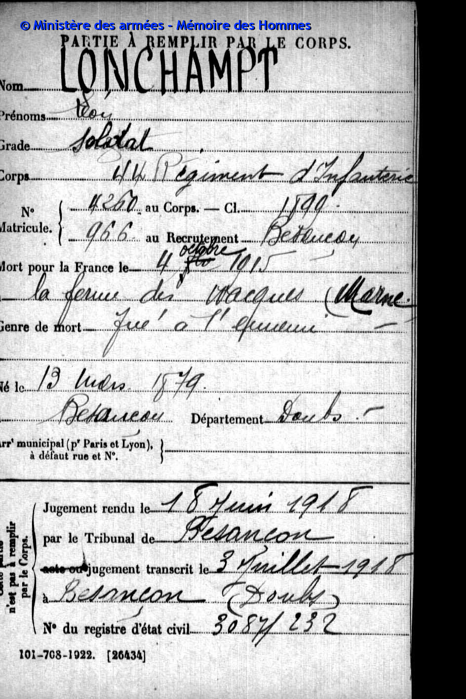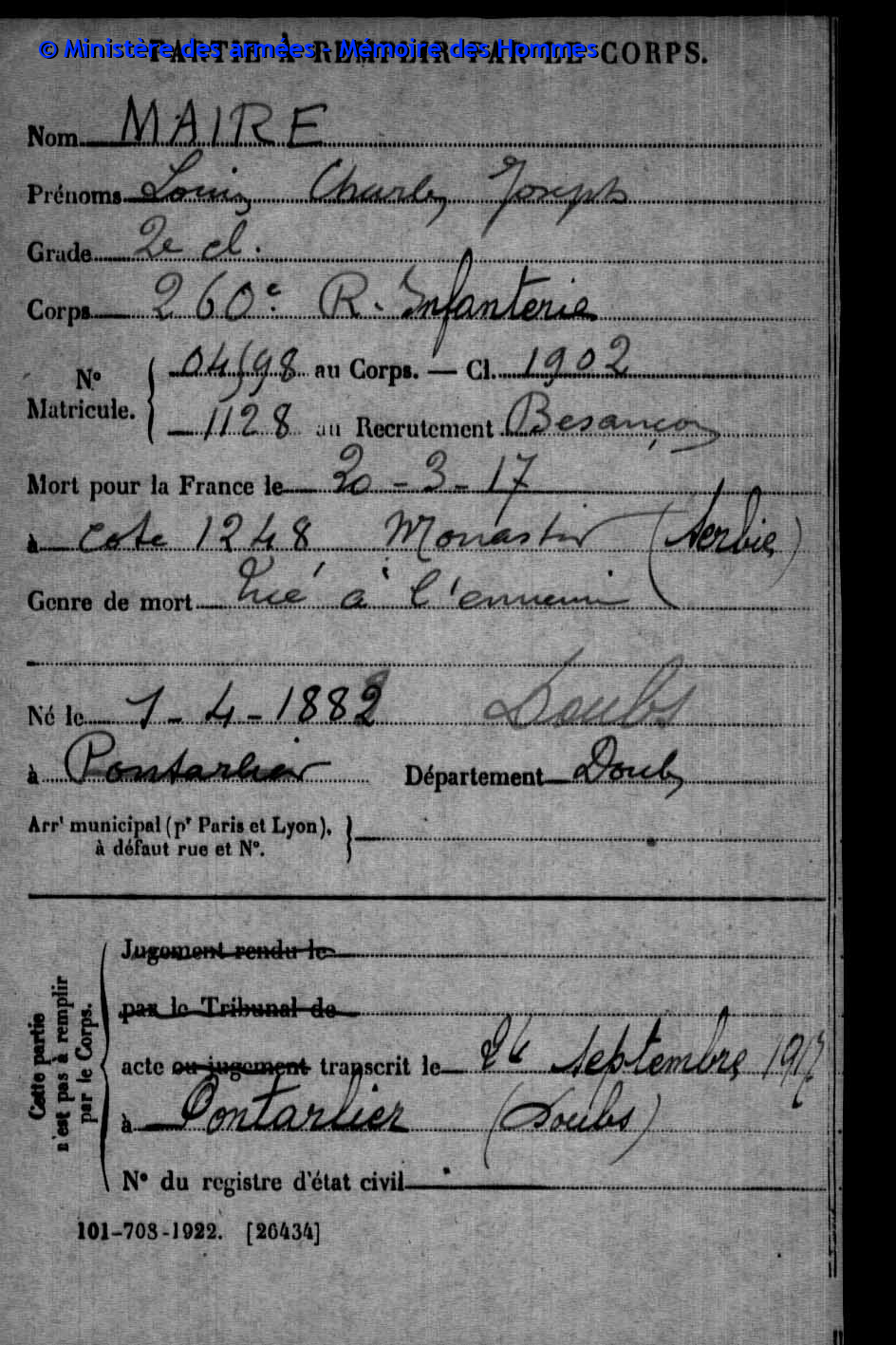 | Soldat MAIRE-SEBILLE René Prosper Victor 15.11.1891 - 01.04.1915 44ème Régiment d'Infanterie Verstarb an seinen Wunden im Hôpital No. 232 in Paris (F) |