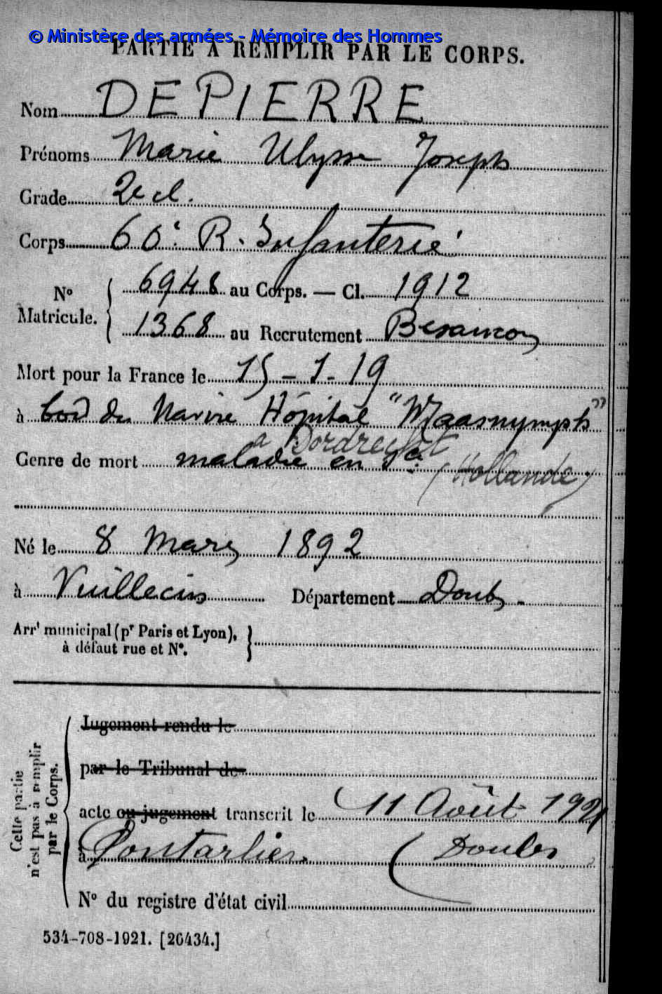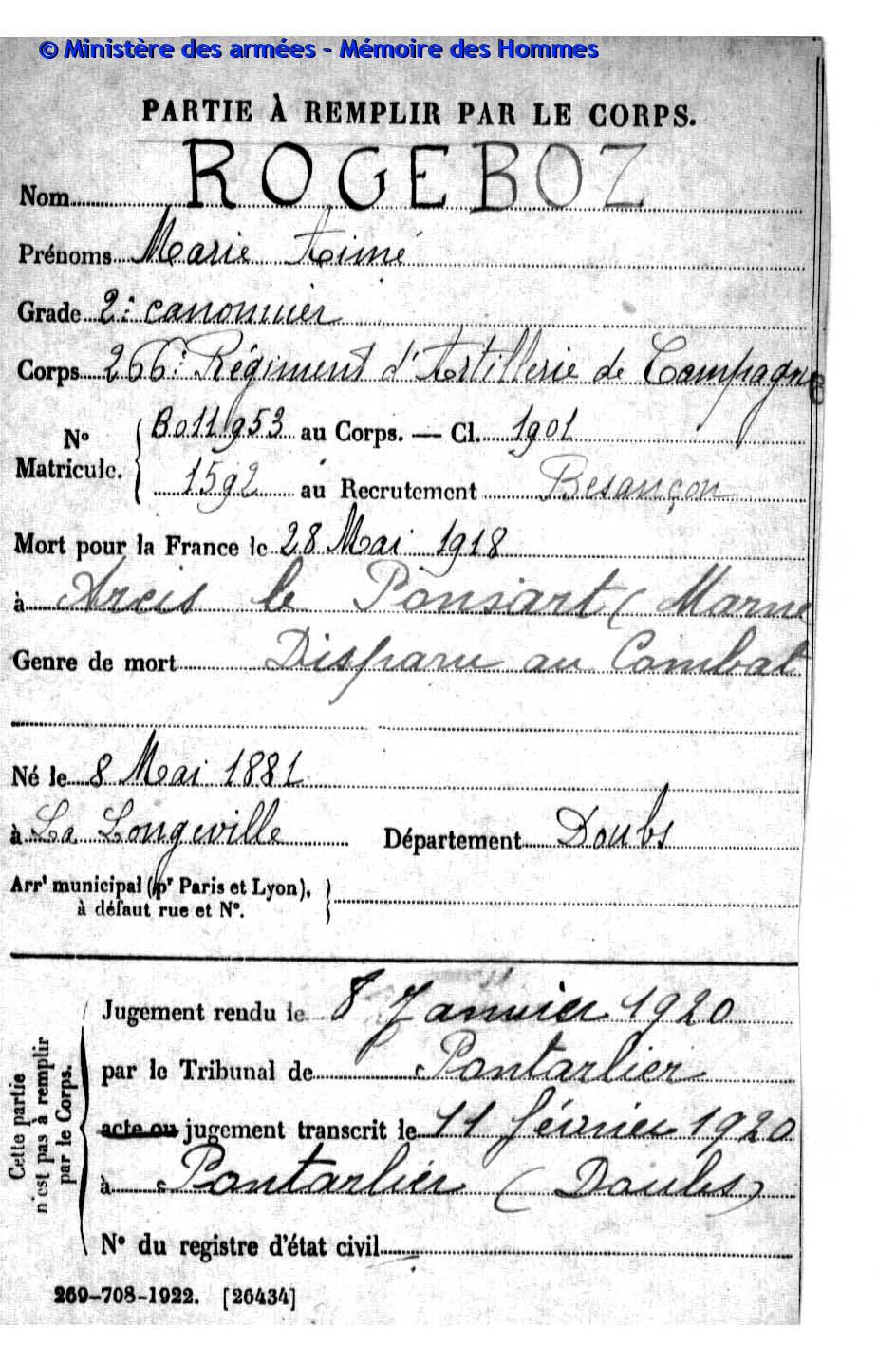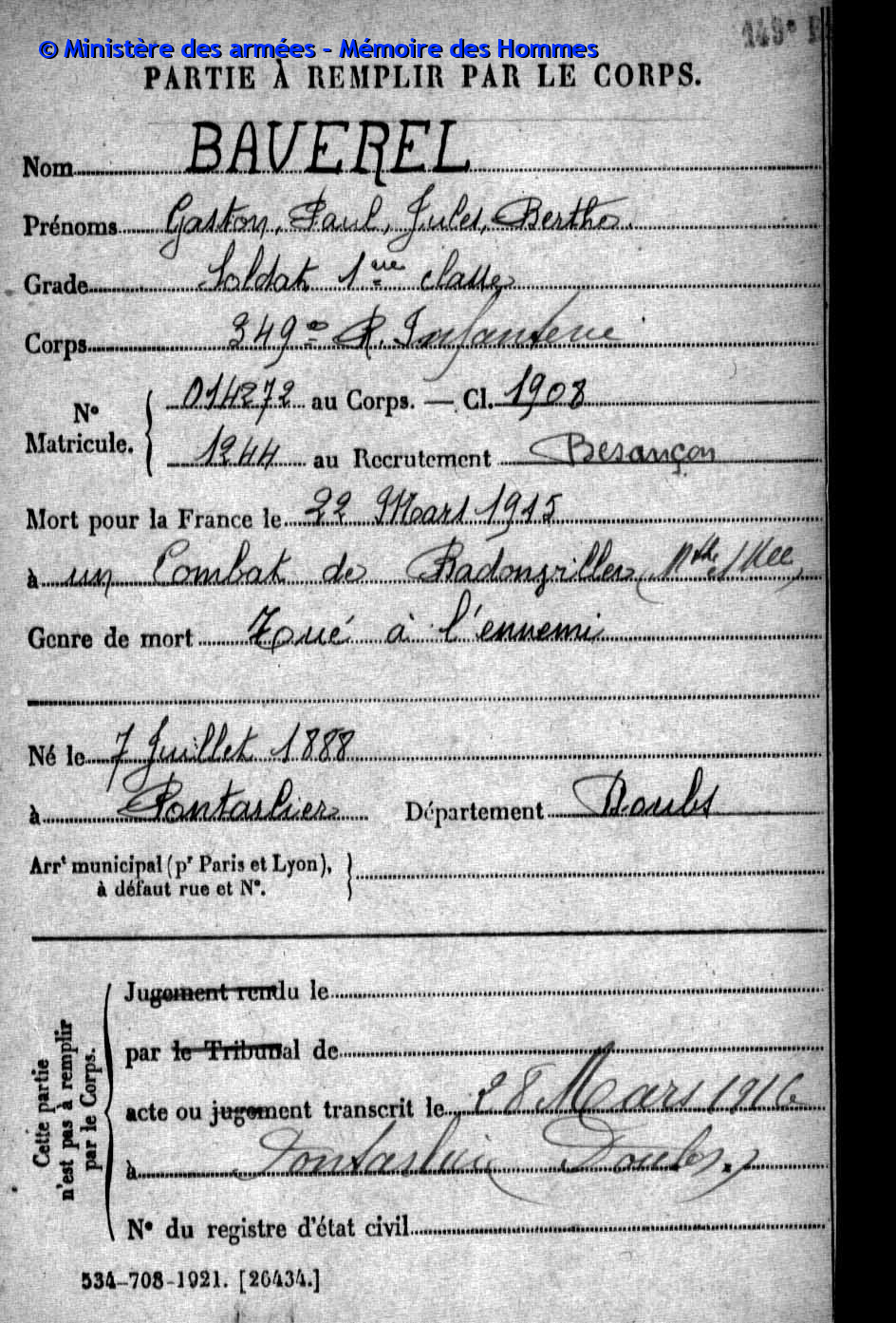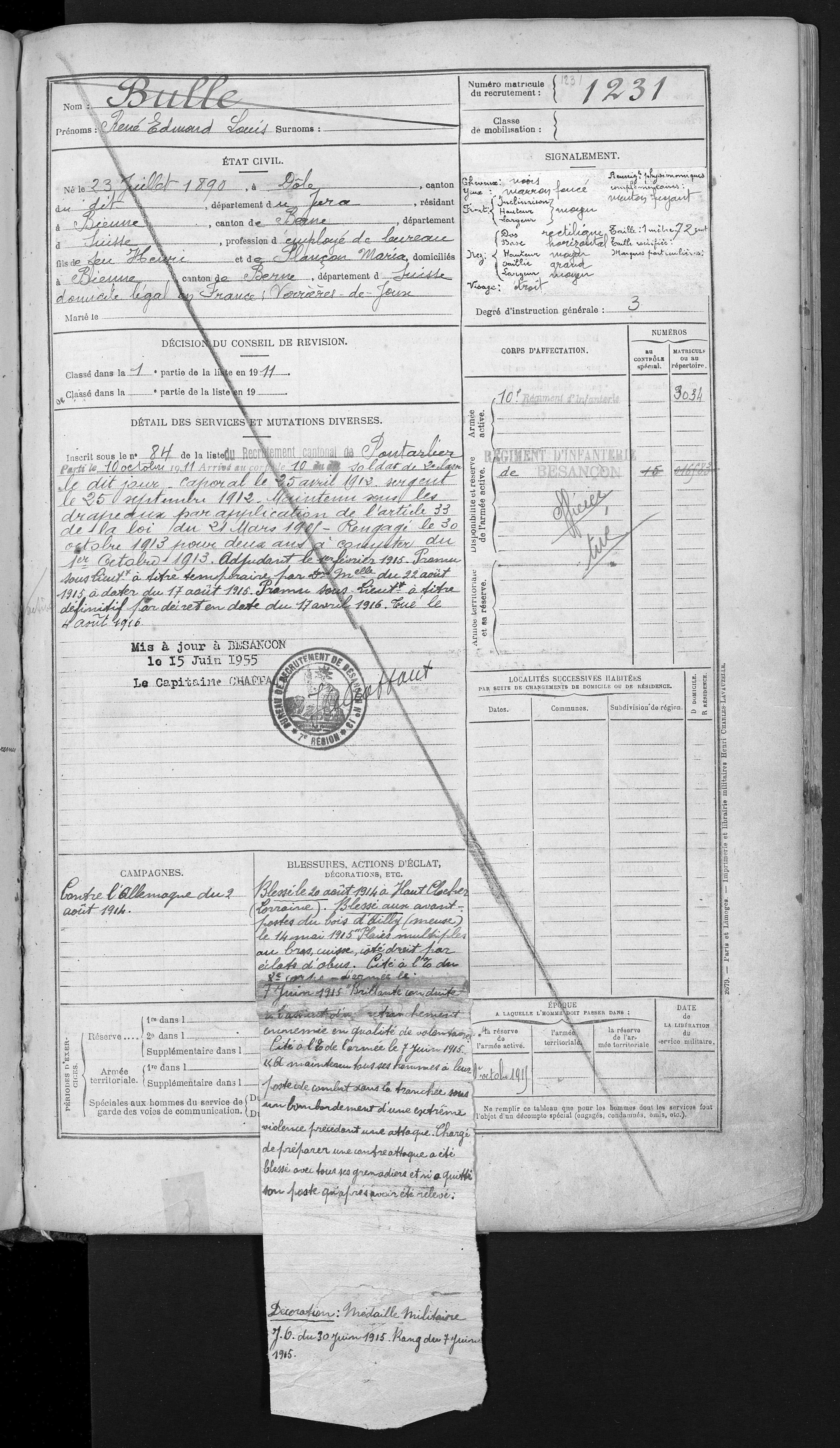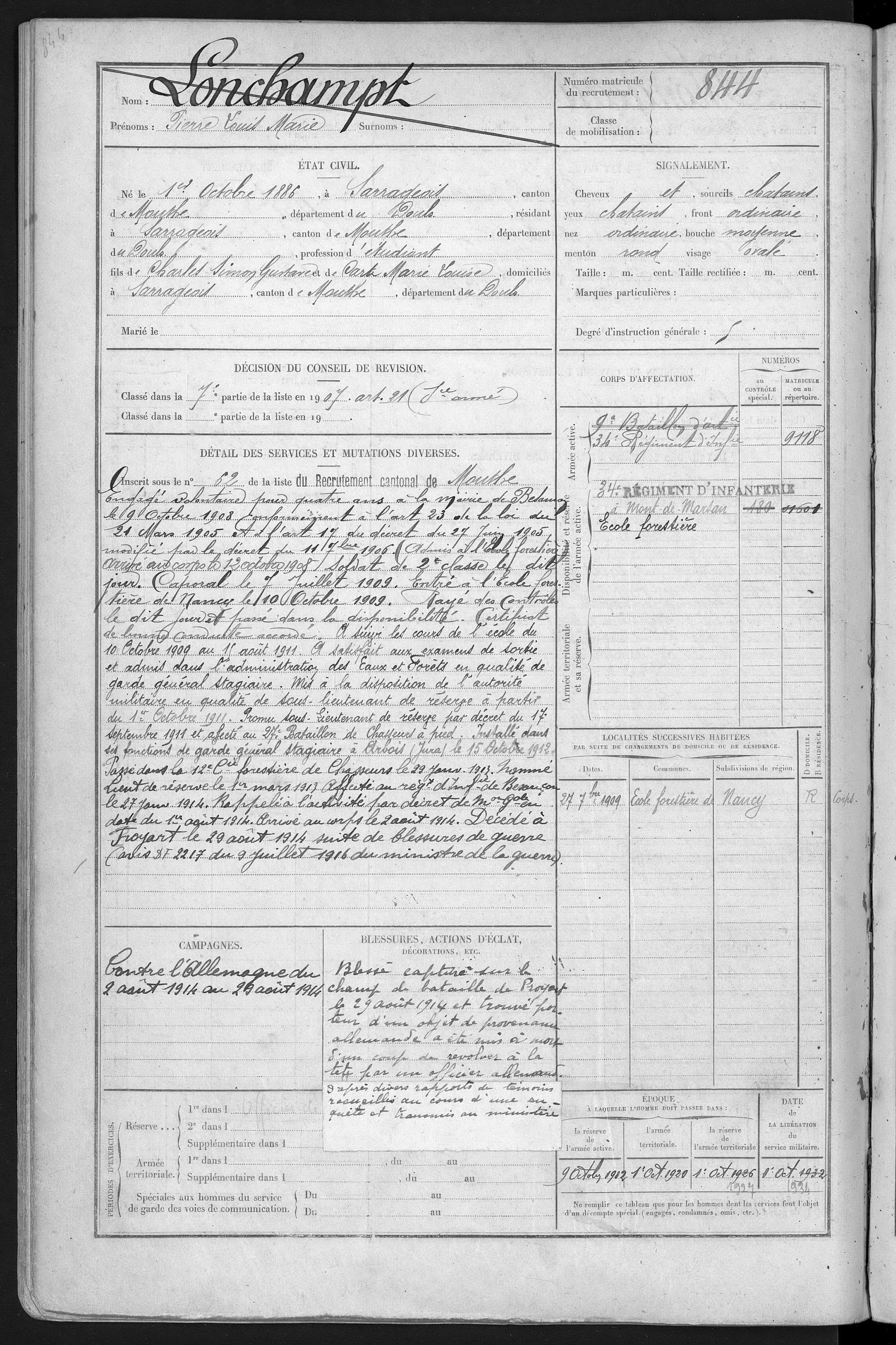 | Soldat MAIRE-SEBILLE René Prosper Victor 15.11.1891 - 01.04.1915 44ème Régiment d'Infanterie Verstarb an seinen Wunden im Hôpital No. 232 in Paris (F) |