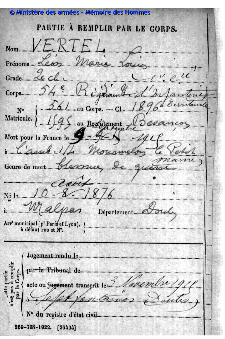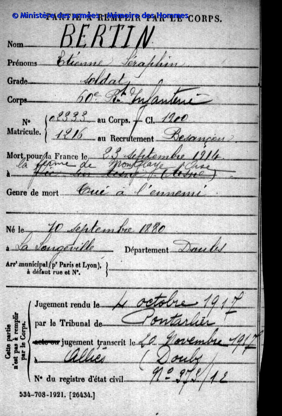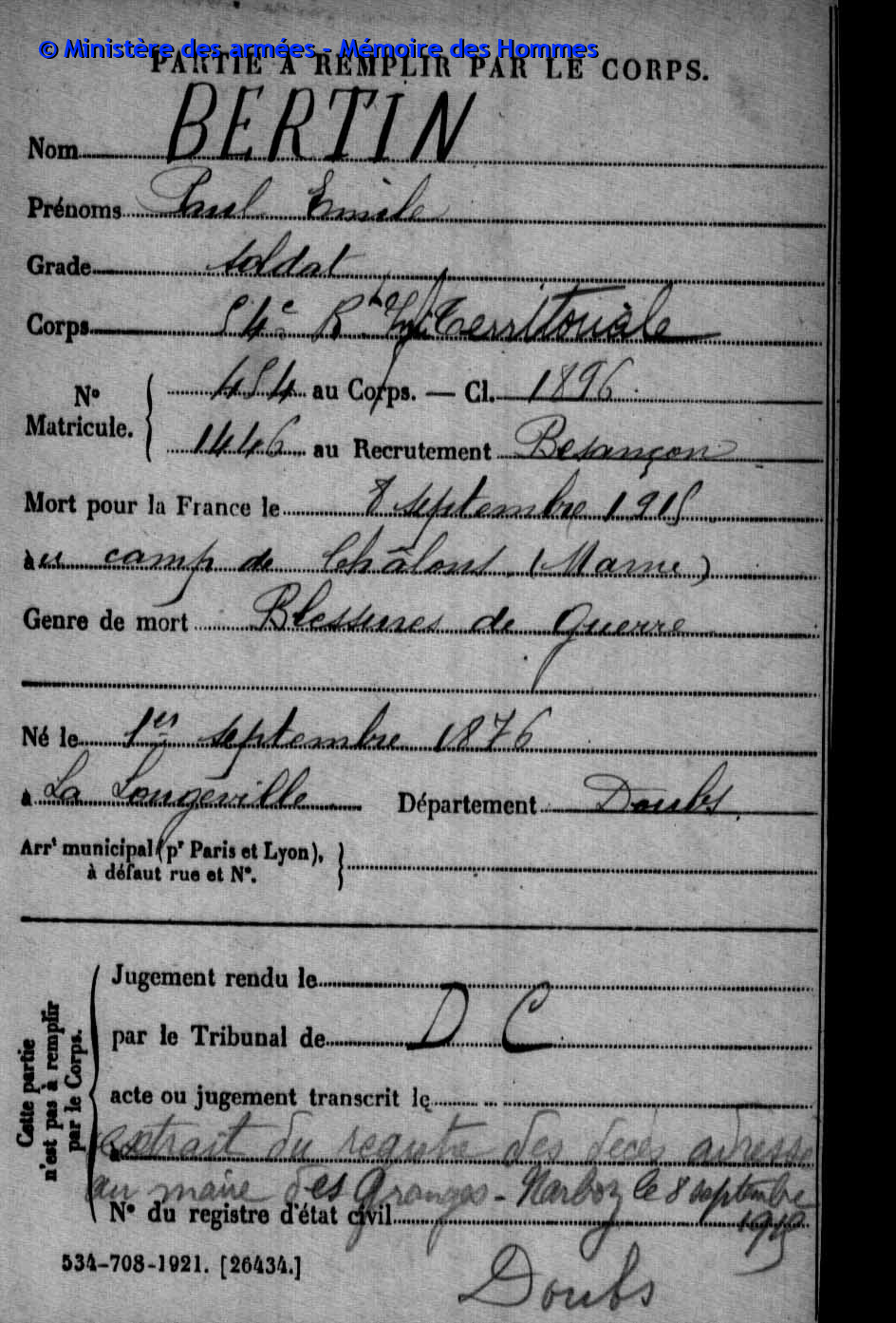 | Soldat BERTIN Paul Emile 01.09.1876 - 08.09.1915 54ème Régiment d'Infanterie Territoriale Verstarb an seinen Wunden in Châlons-sur-Marne (F) |