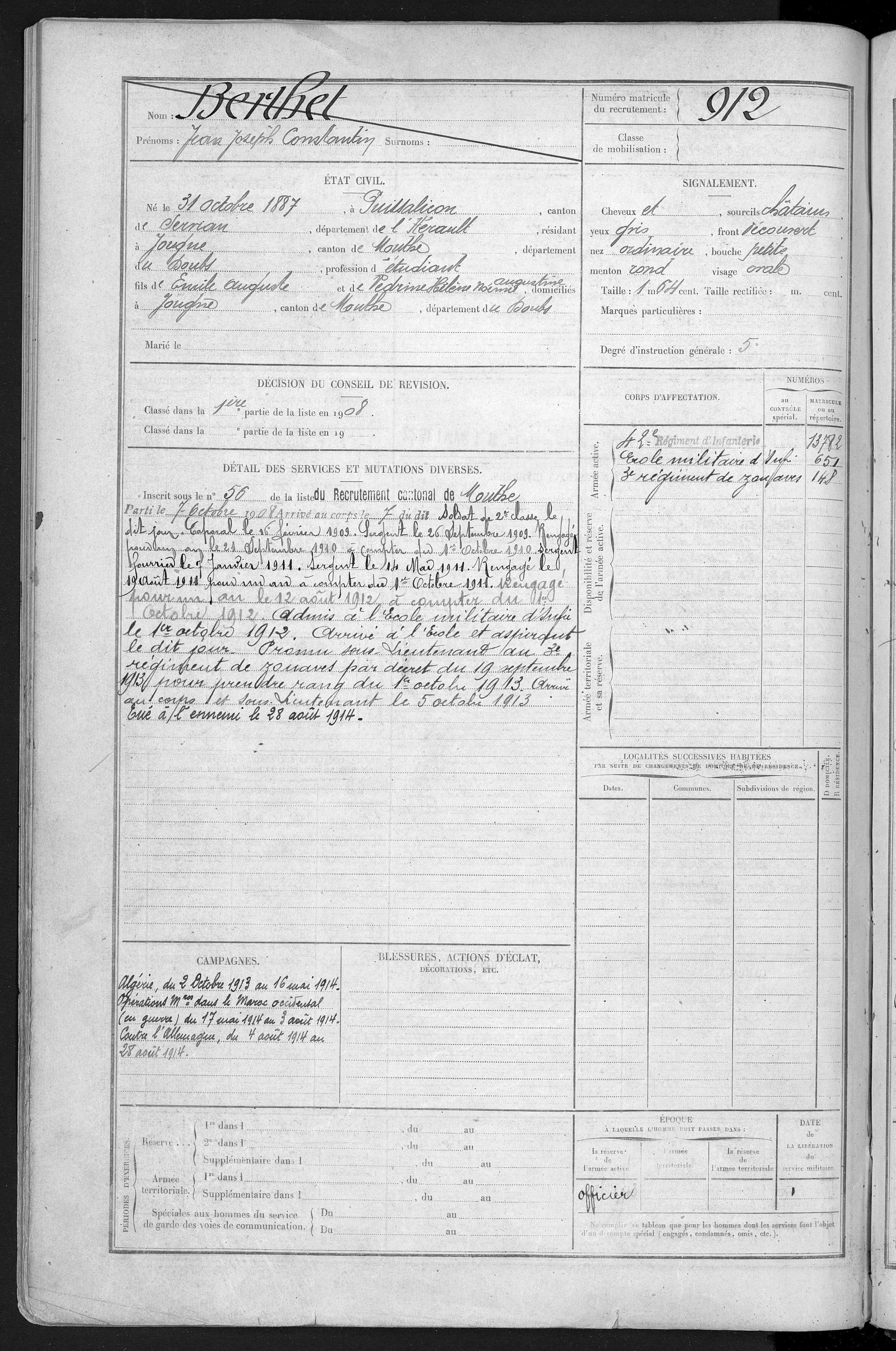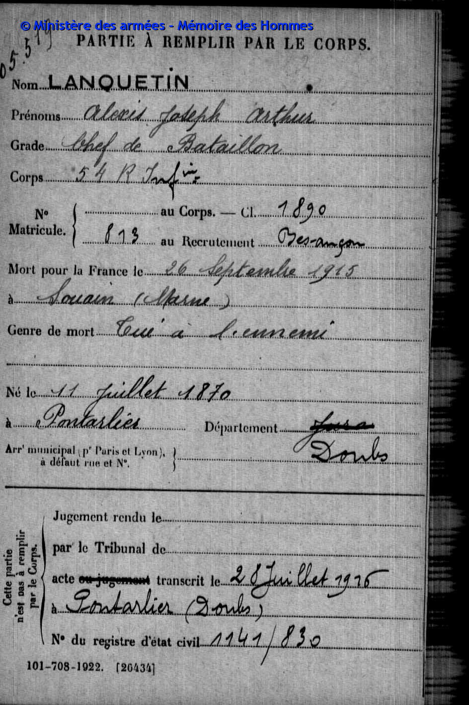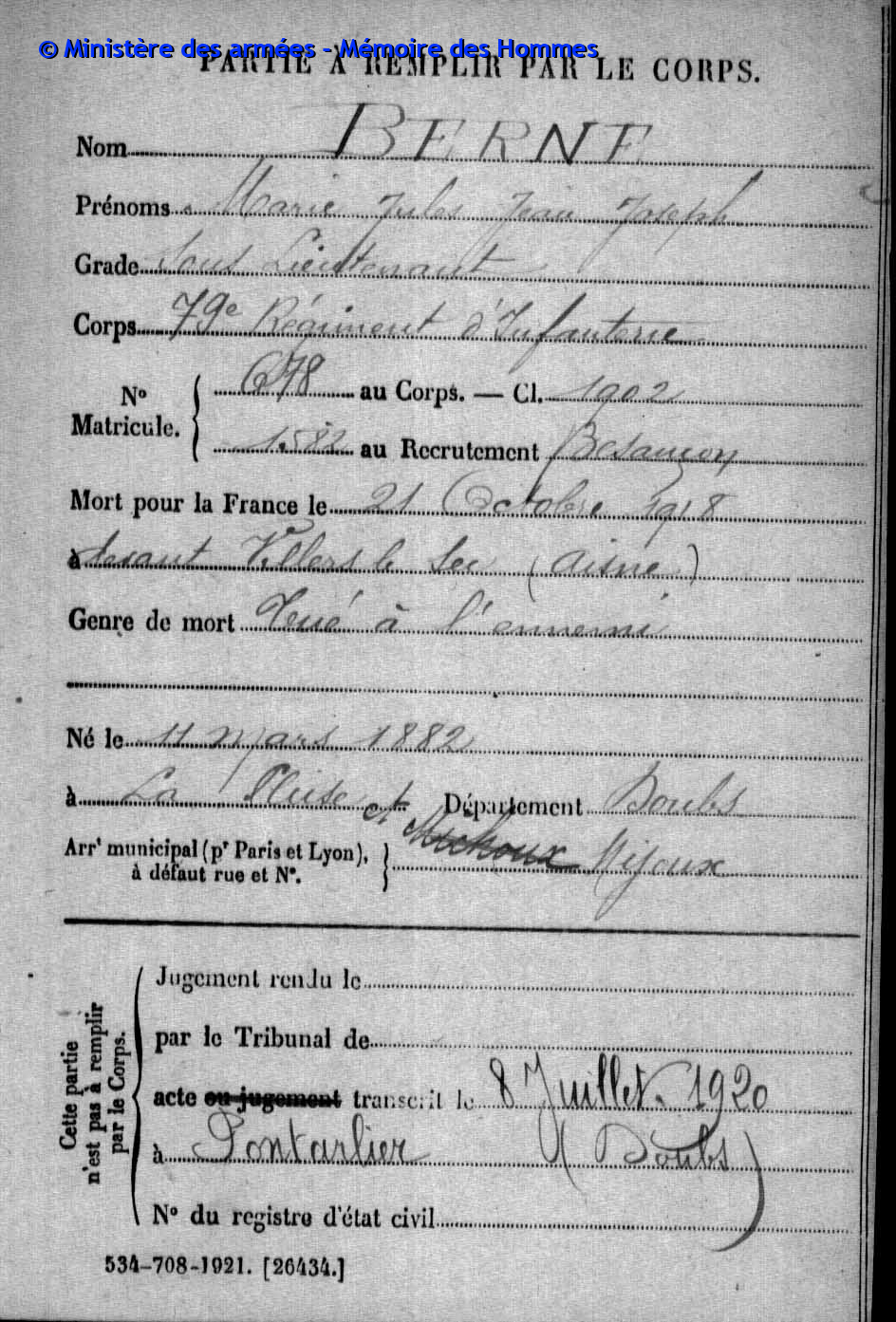| Soldat BERTIN Paul Emile 01.09.1876 - 08.09.1915 54ème Régiment d'Infanterie Territoriale Verstarb an seinen Wunden in Châlons-sur-Marne (F) |