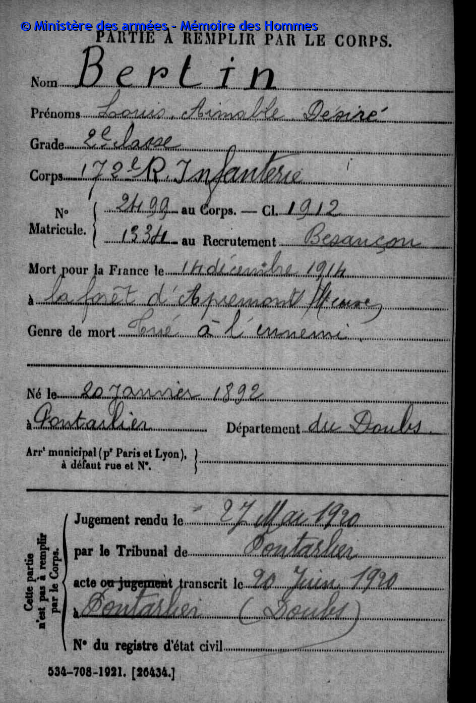 2ème classe BERTIN Louis Aimable Désiré 20.01.1892 - 14.12.1914 172ème Régiment d'Infanterie Gefallen in Apremont - Meuse (F) |