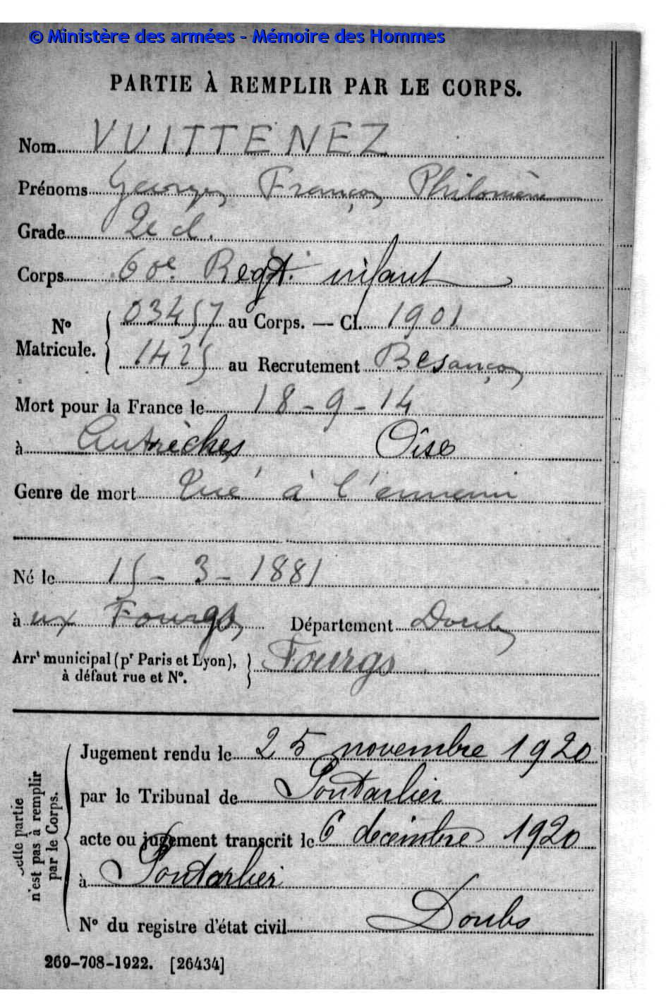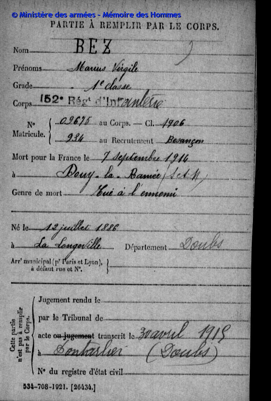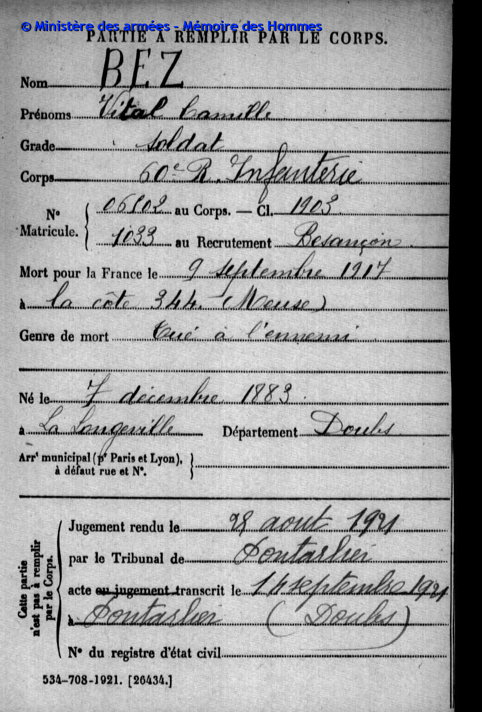 | Soldat BEZ Vital Camille 07.12.1883 - 09.09.1917 60ème Régiment d'Infanterie Gilt als vermisst nördlich von Verdun (F) |