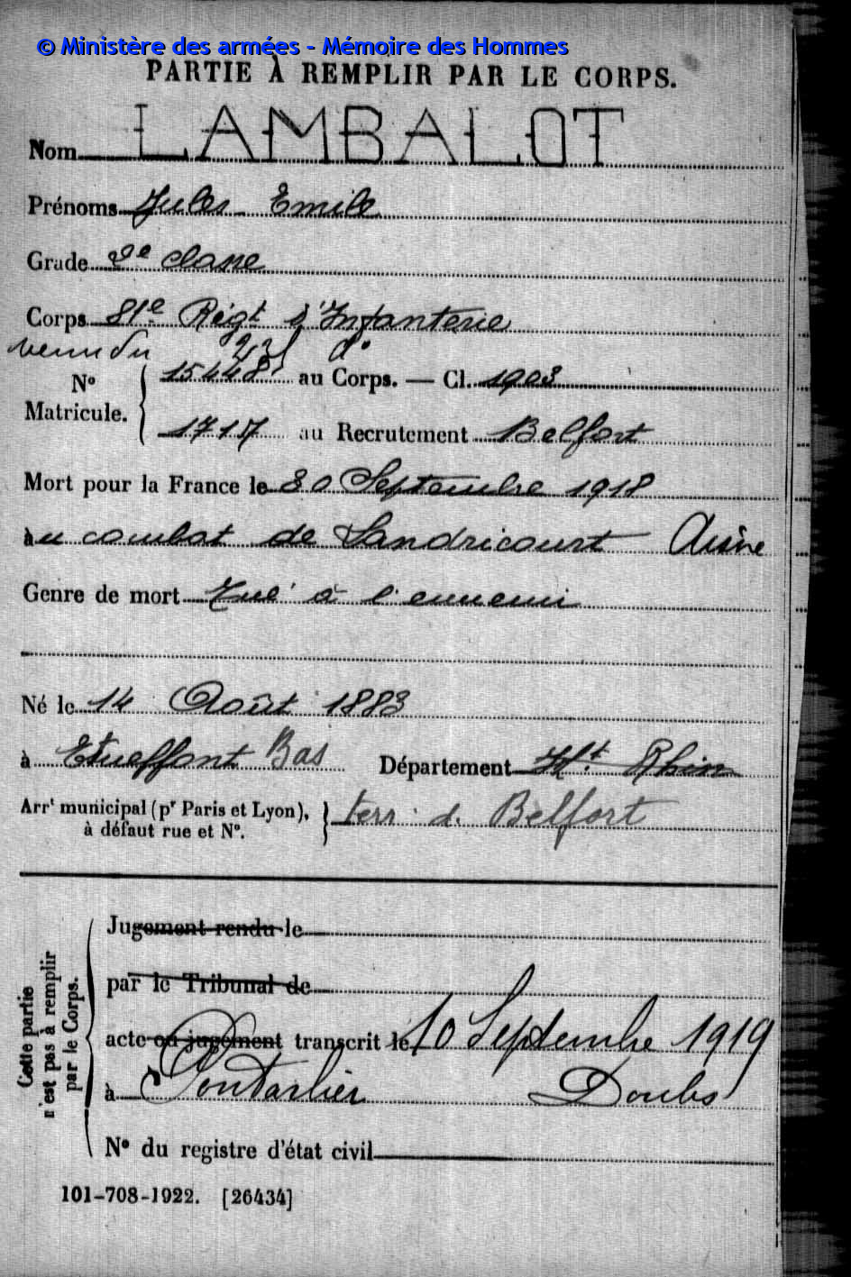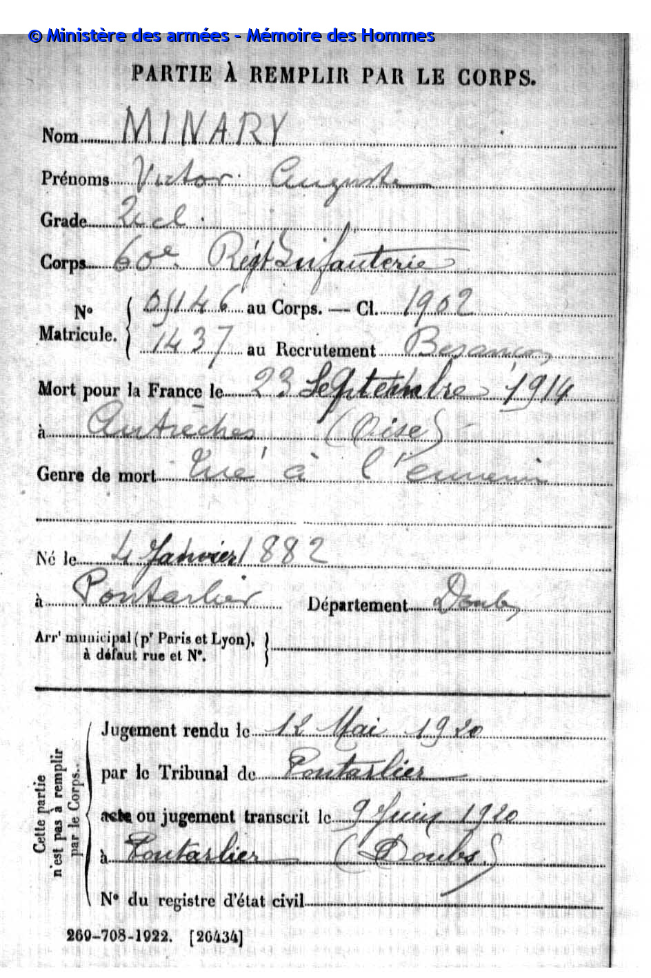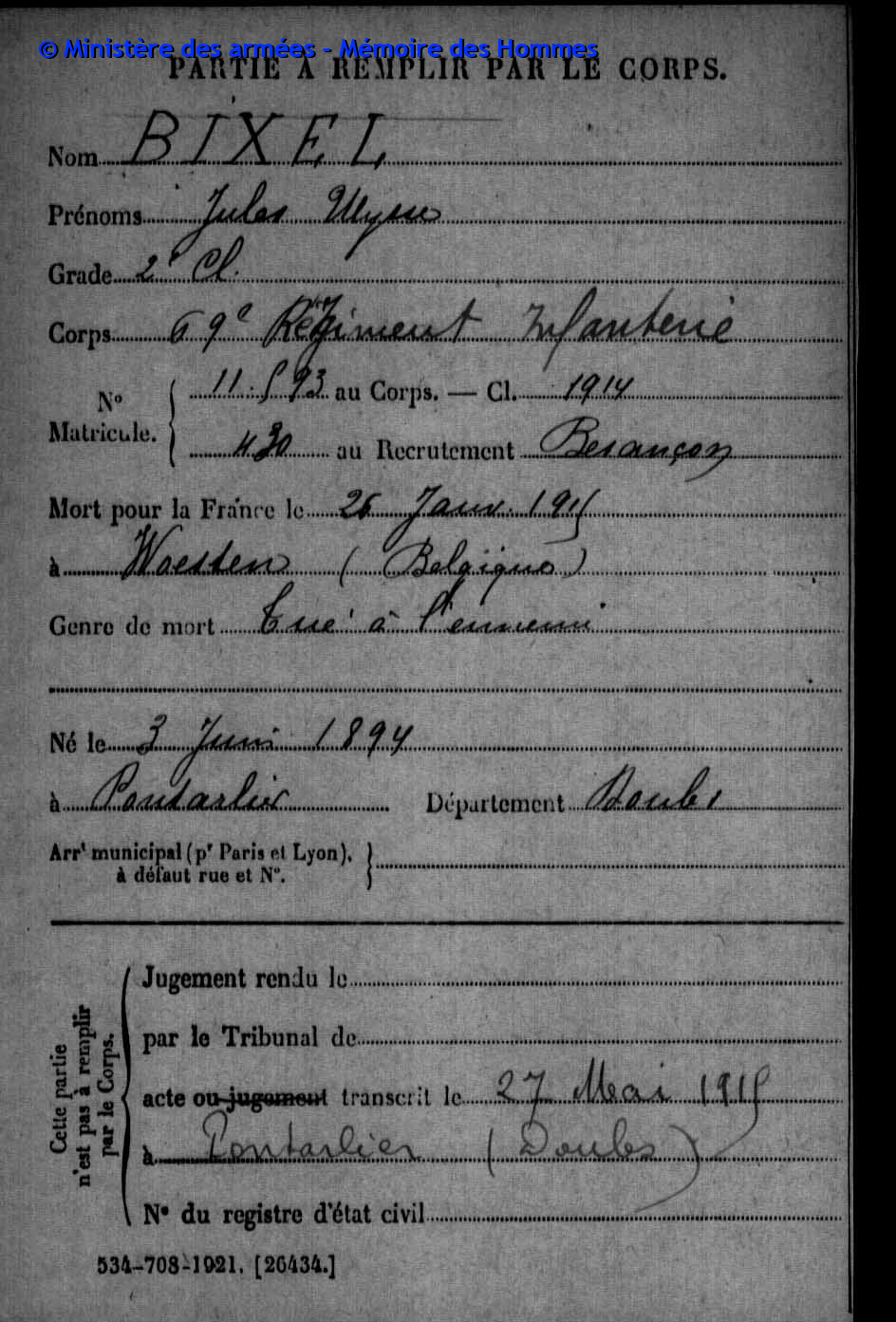| Soldat BEZ Vital Camille 07.12.1883 - 09.09.1917 60ème Régiment d'Infanterie Gilt als vermisst nördlich von Verdun (F) |