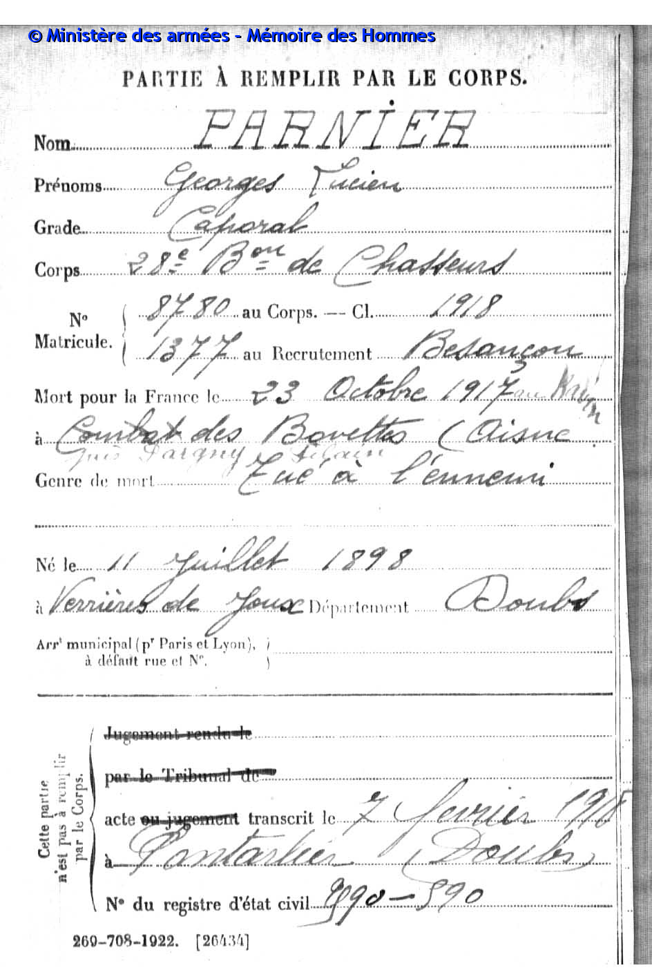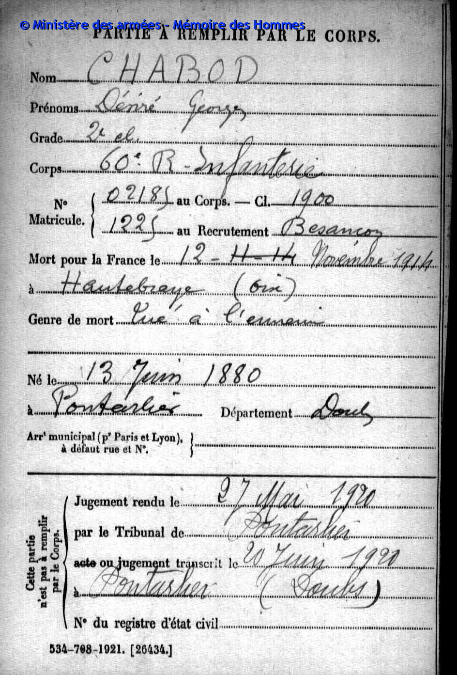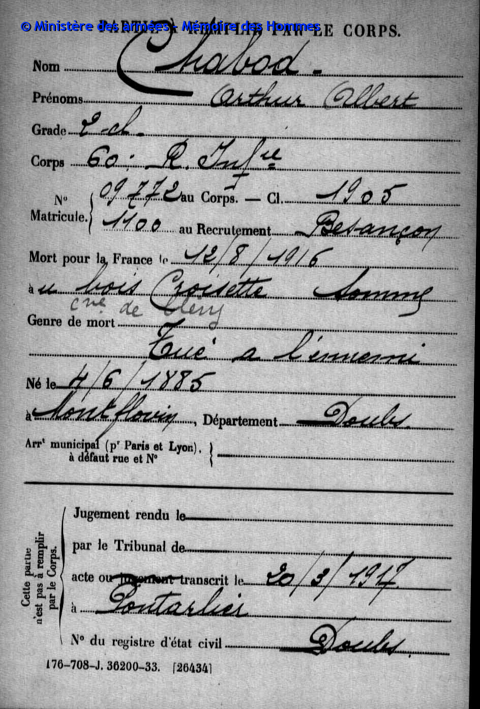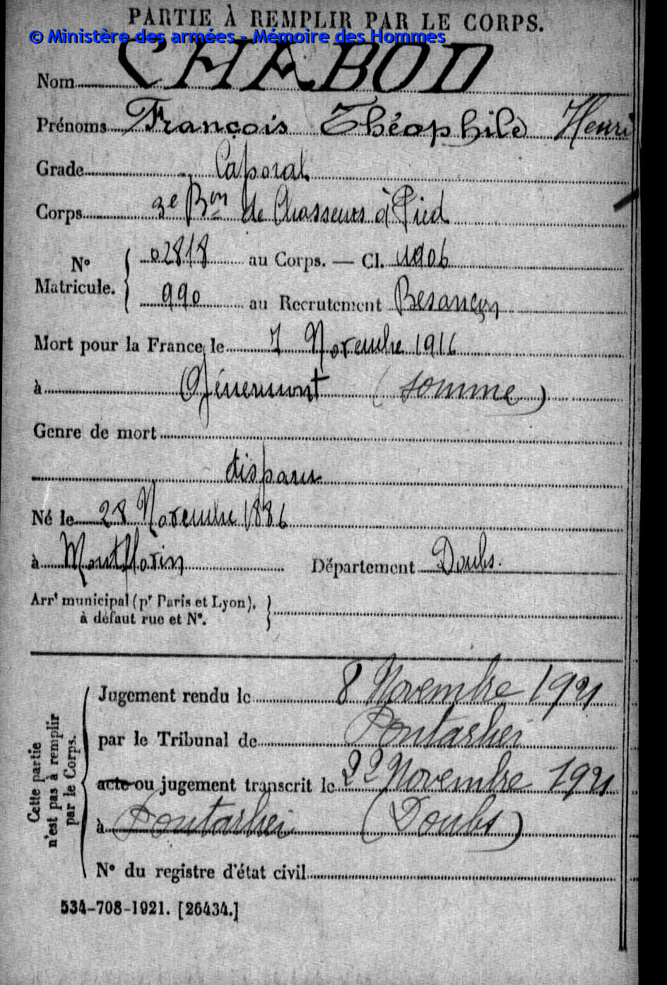 | Caporal CHABOD François Théophile Henri 28.11.1886 - 07.11.1916 3ème Bataillon de Chasseurs à Pied Gilt als vermisst in Fresnes-Mazancourt . Somme (F) |