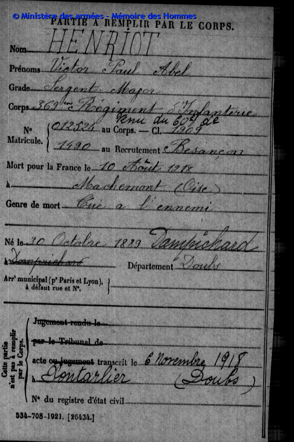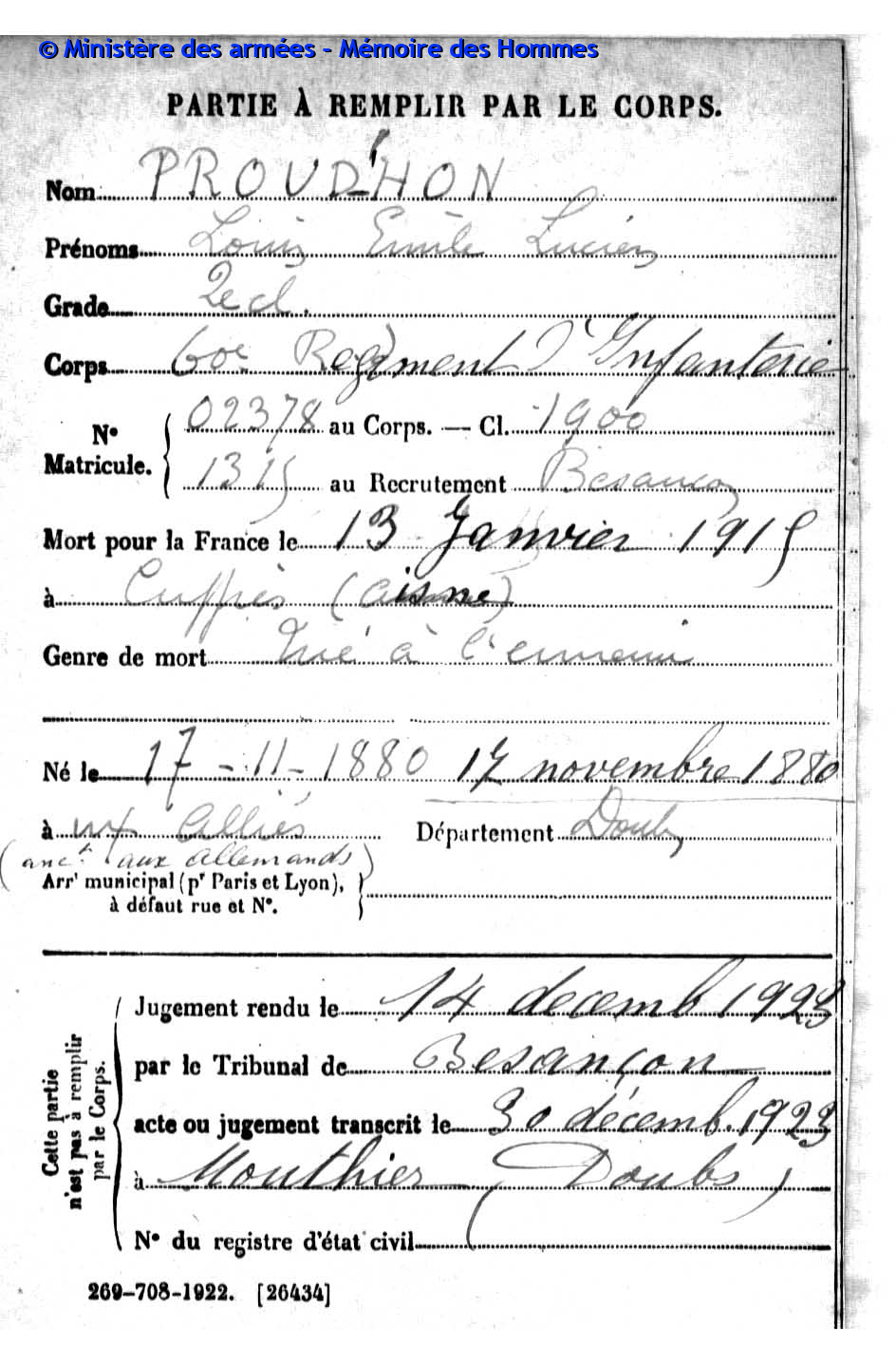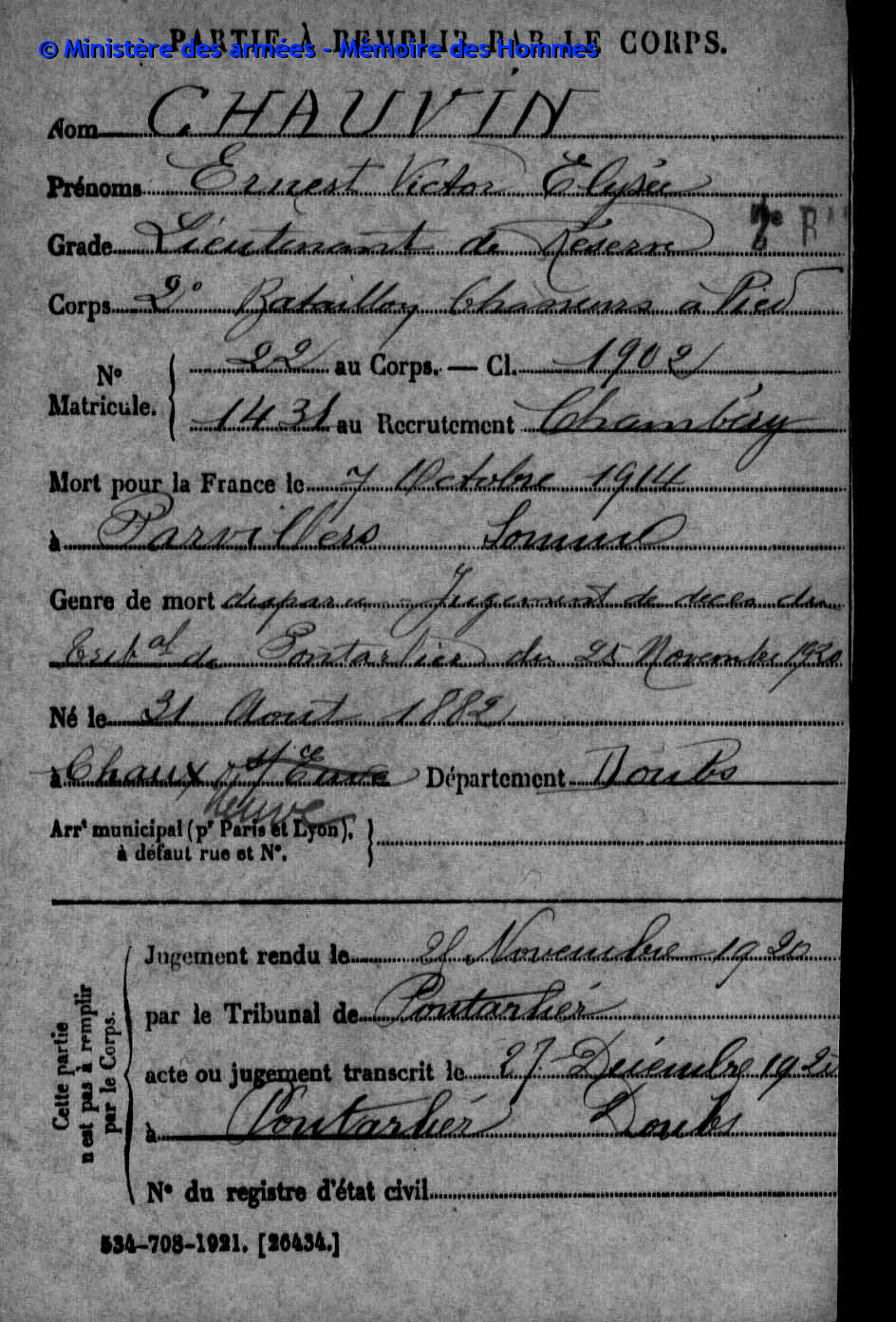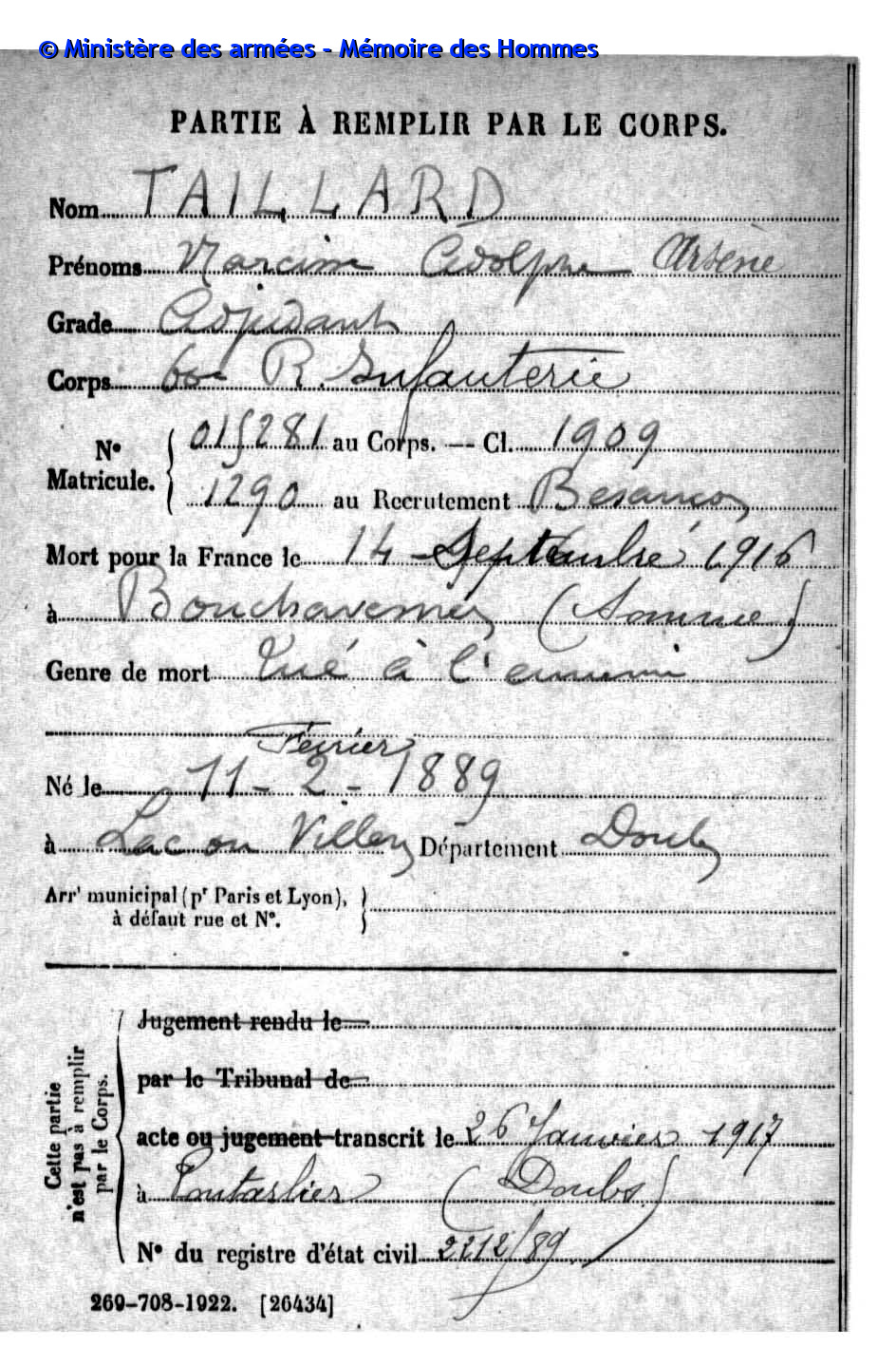 | Caporal CHABOD François Théophile Henri 28.11.1886 - 07.11.1916 3ème Bataillon de Chasseurs à Pied Gilt als vermisst in Fresnes-Mazancourt . Somme (F) |