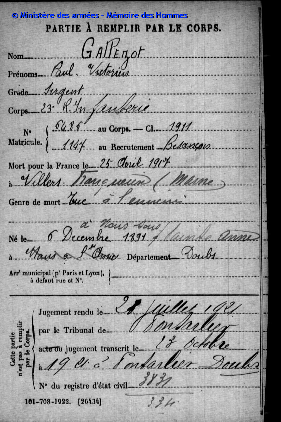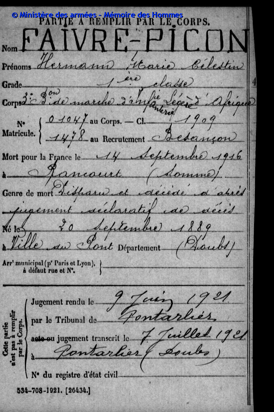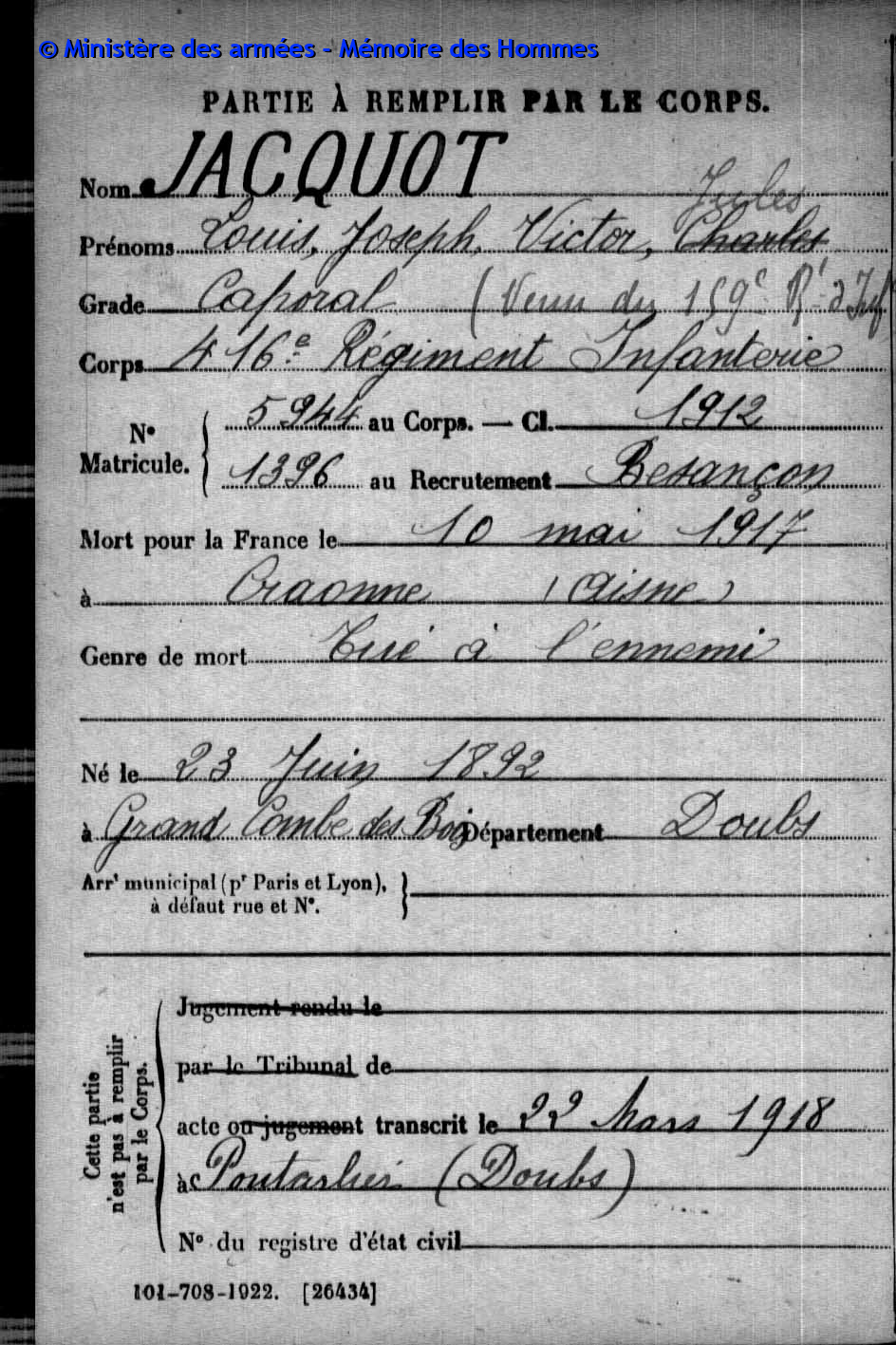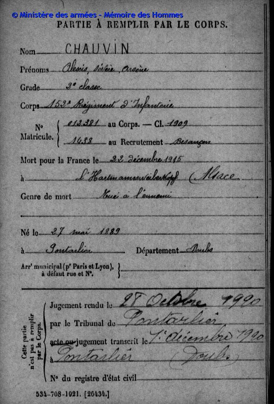 | Caporal CHABOD François Théophile Henri 28.11.1886 - 07.11.1916 3ème Bataillon de Chasseurs à Pied Gilt als vermisst in Fresnes-Mazancourt . Somme (F) |