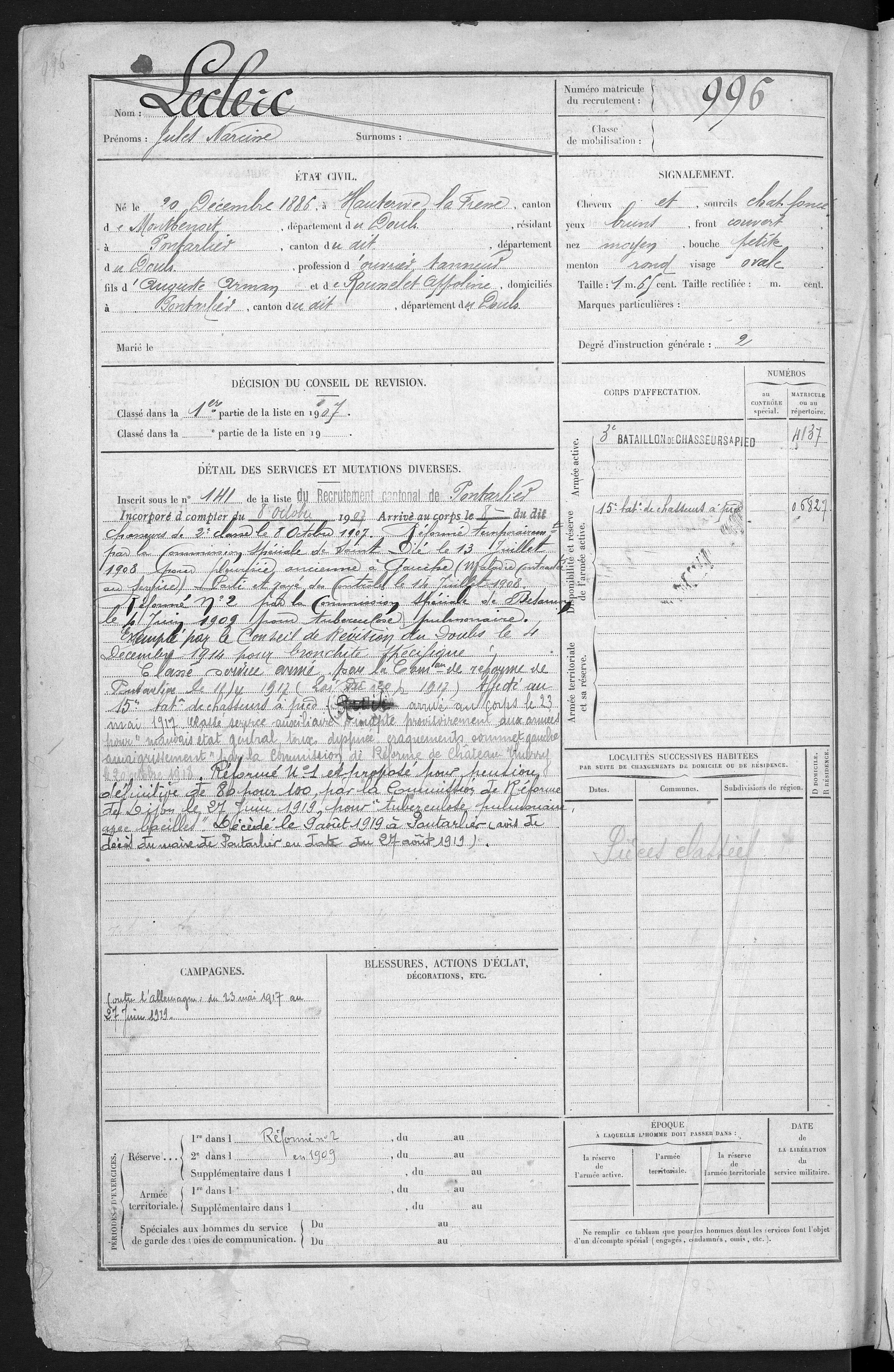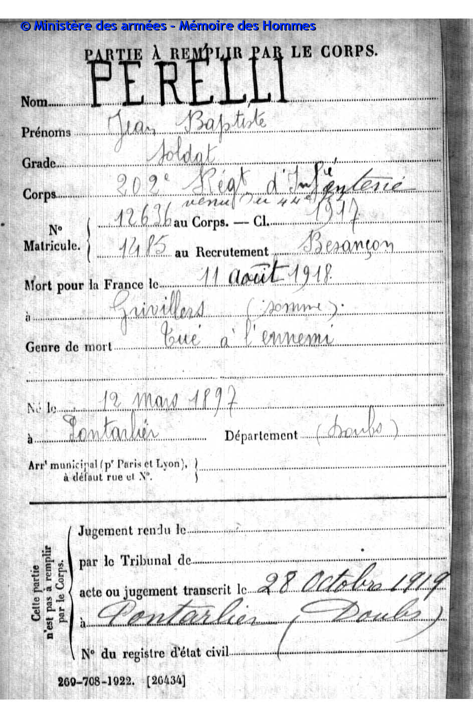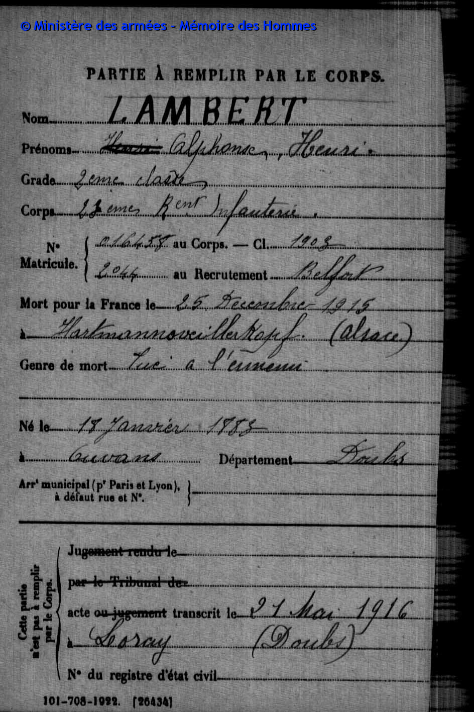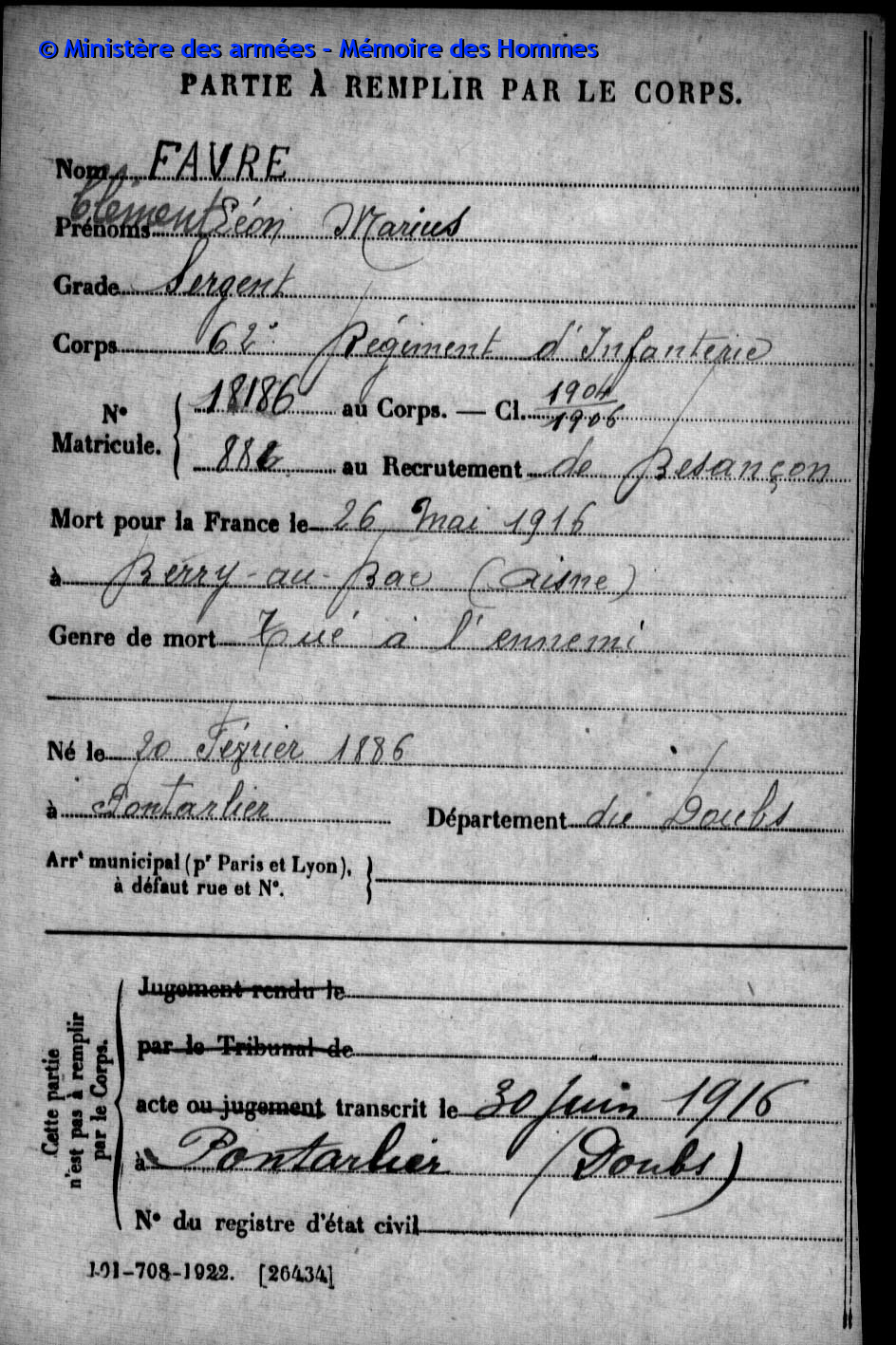 | Caporal CHABOD François Théophile Henri 28.11.1886 - 07.11.1916 3ème Bataillon de Chasseurs à Pied Gilt als vermisst in Fresnes-Mazancourt . Somme (F) |