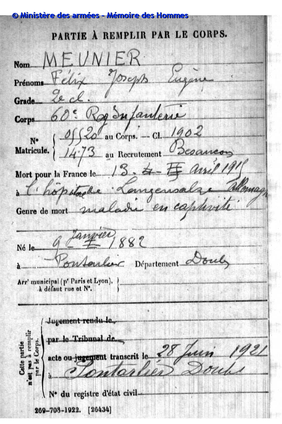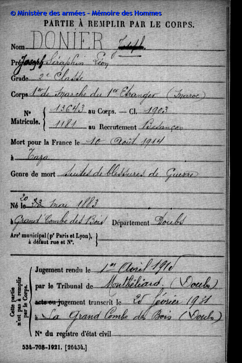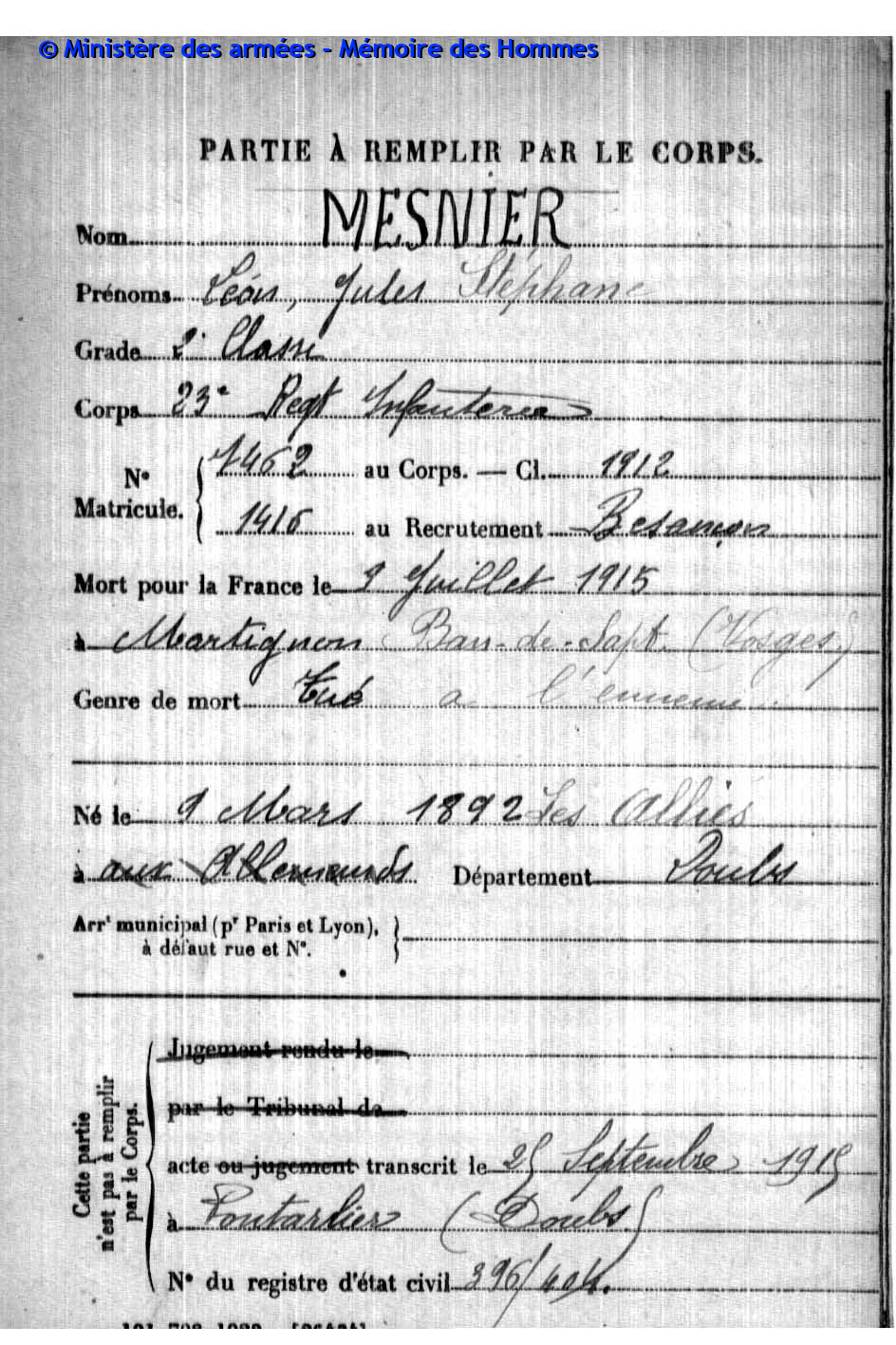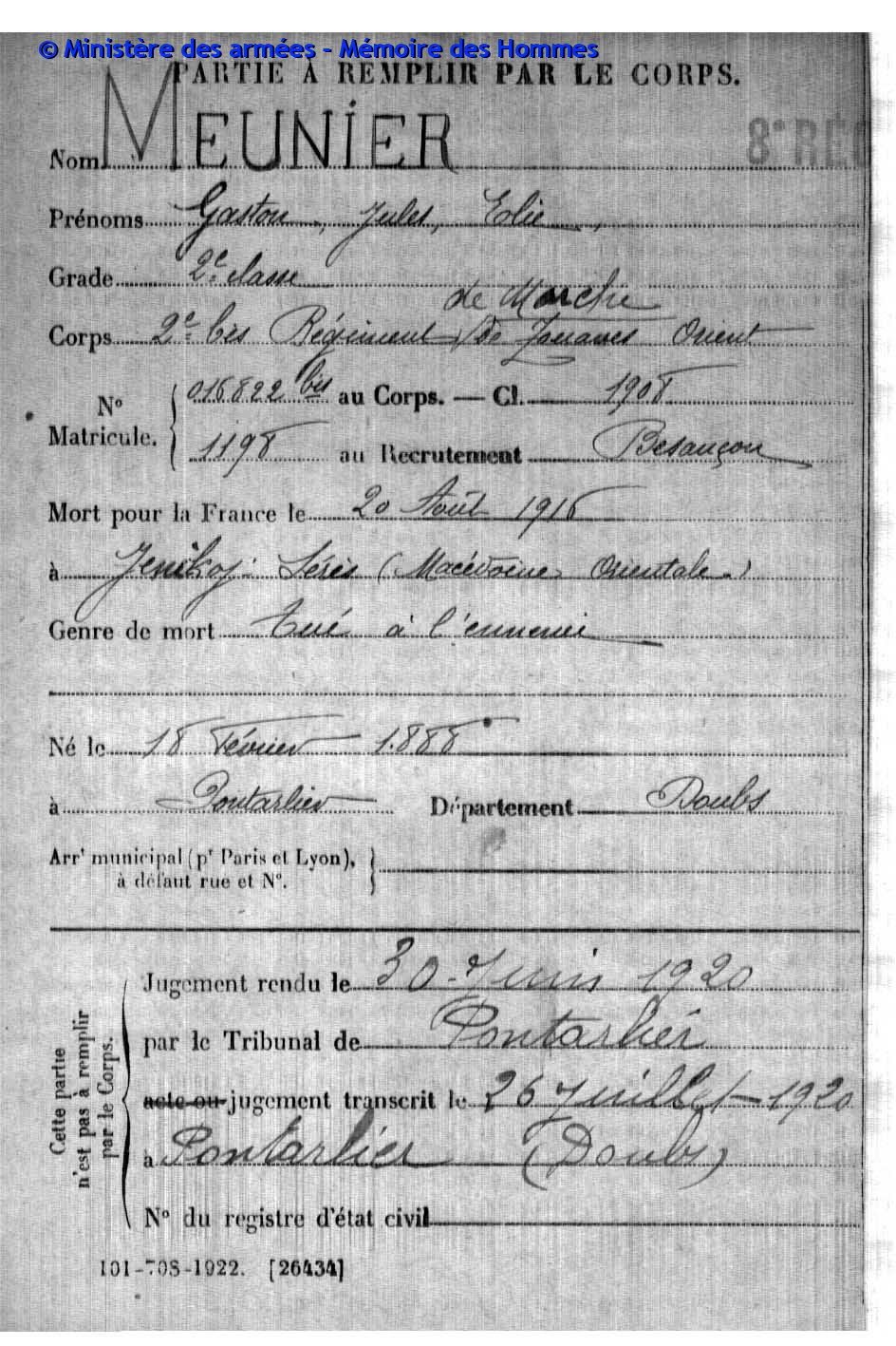 2ème classe MEUNIER Gaston Jules Elie 18.02.1888 - 20.08.1916 2ème Régiment des Marche de Zouaves Gefallen in Jeniköj (Mazedonien) |
