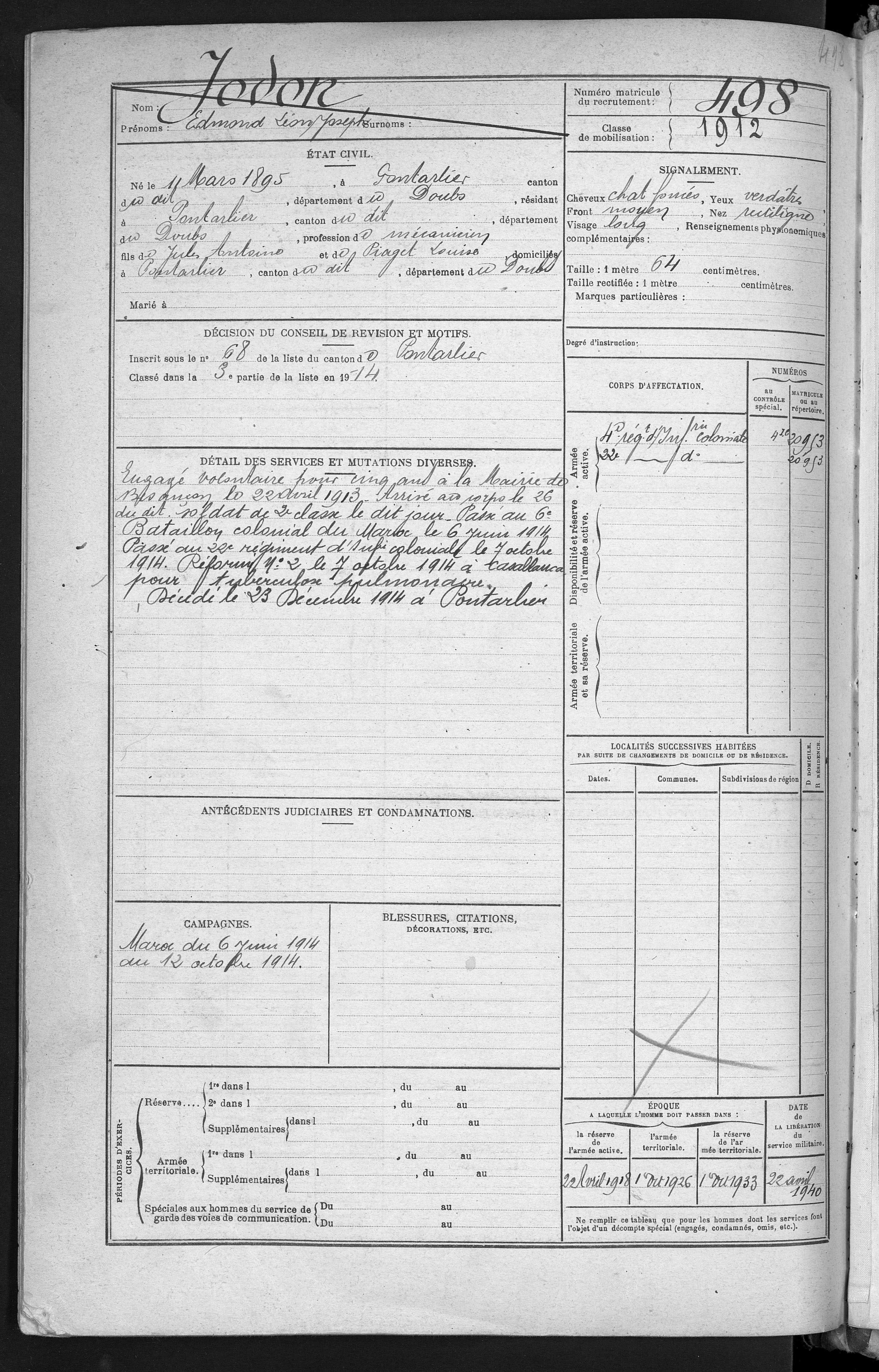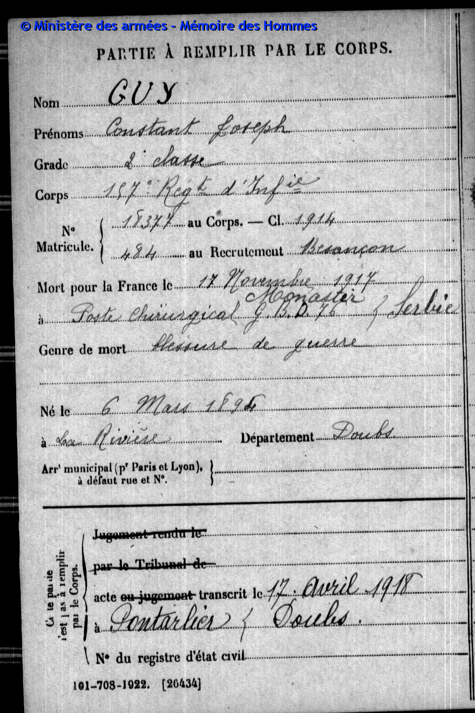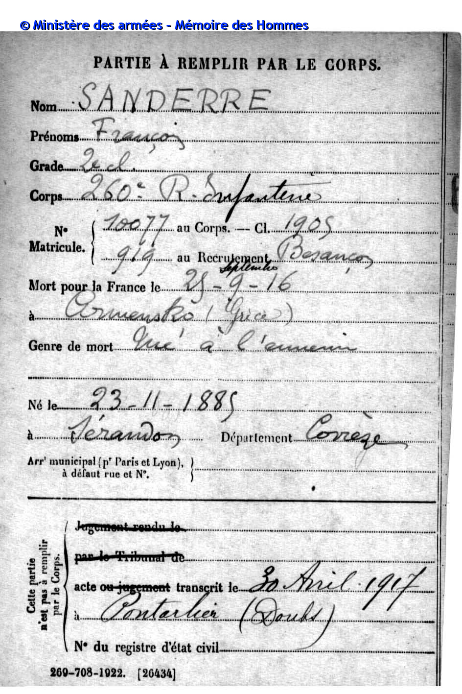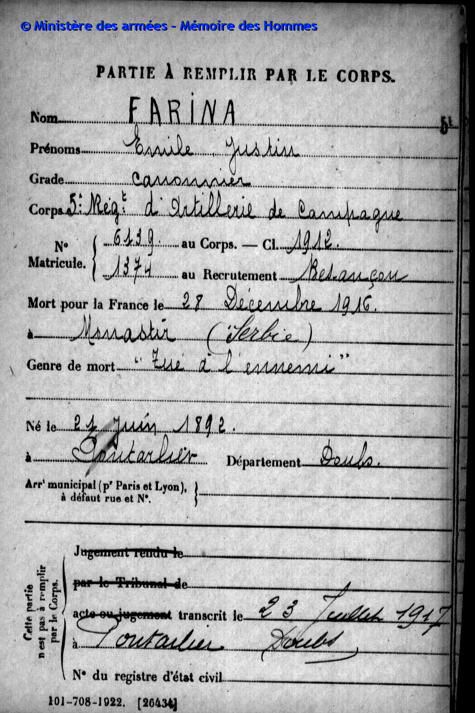 2ème classe MEUNIER Gaston Jules Elie 18.02.1888 - 20.08.1916 2ème Régiment des Marche de Zouaves Gefallen in Jeniköj (Mazedonien) |