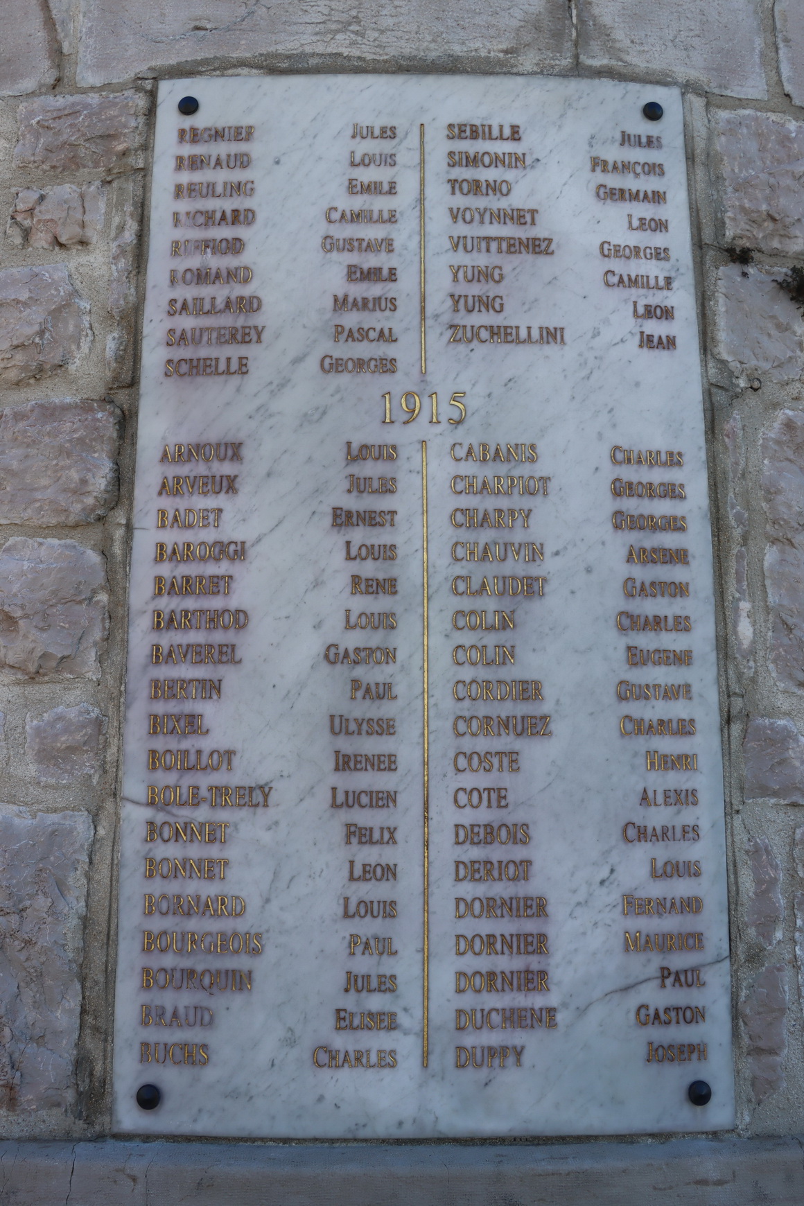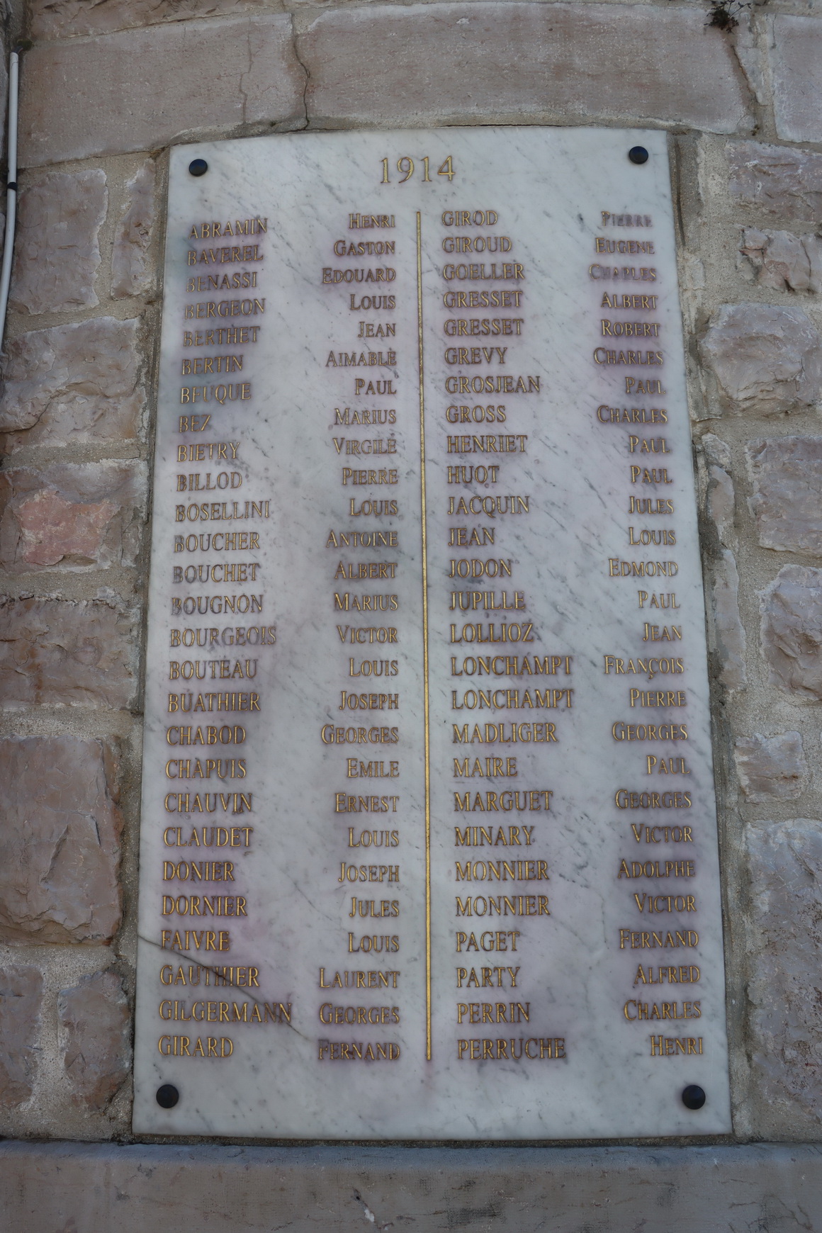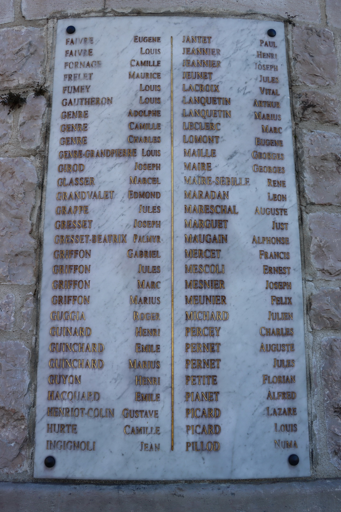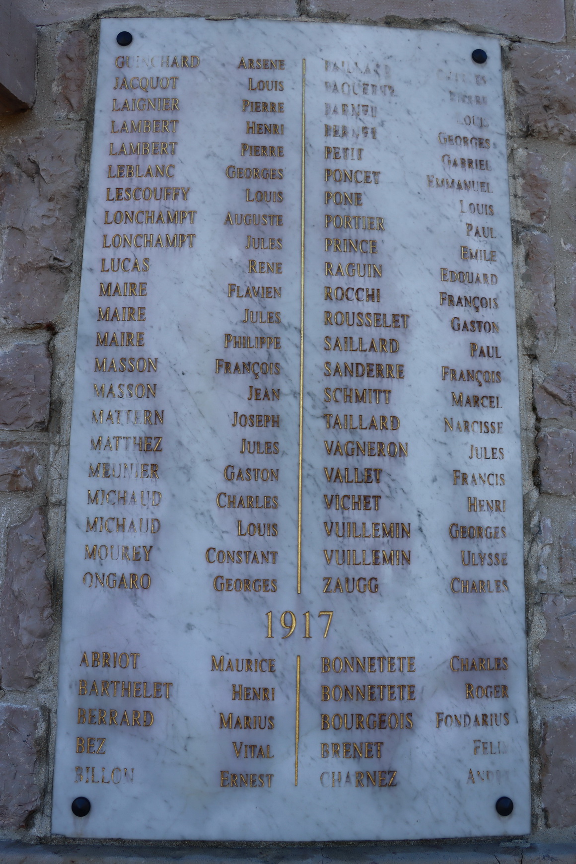 Auf dem Kriegerdenkmal sind 508 Namen von zivilen und militärischen Kriegsopfer aufgelistet, davon sind 192 mit Fabian Coulot verwandt.