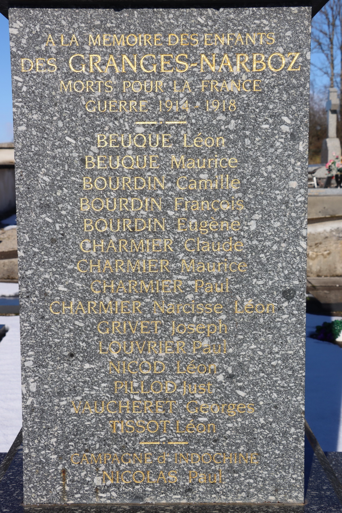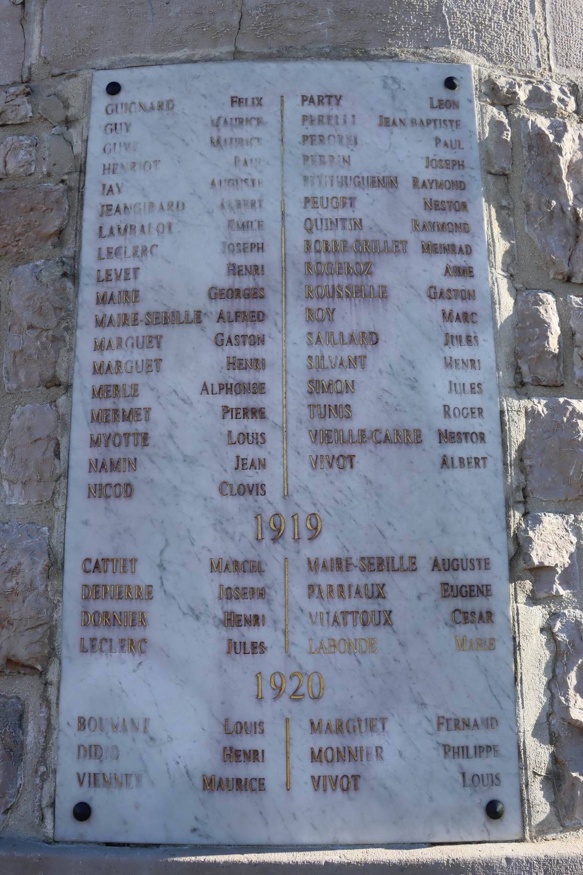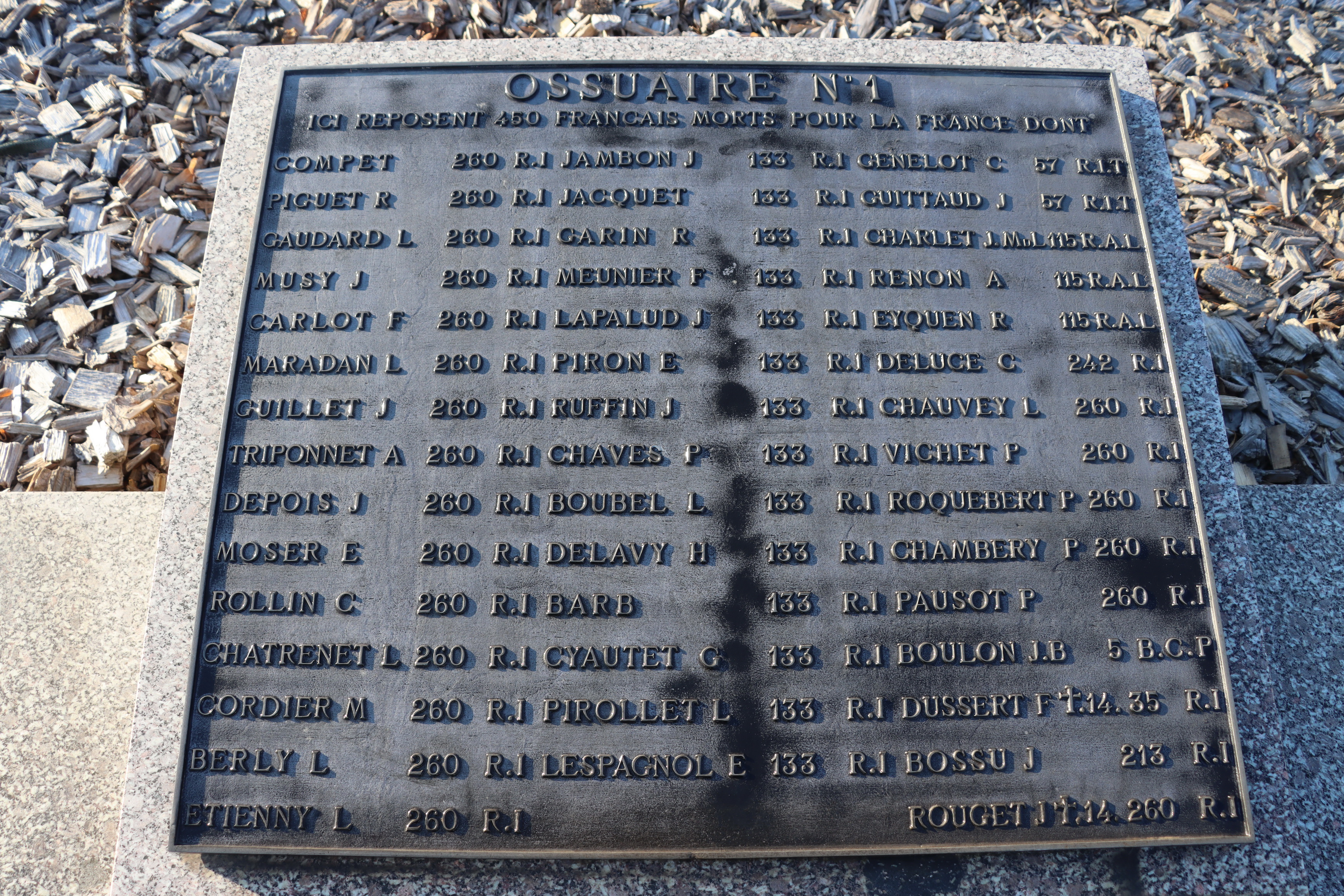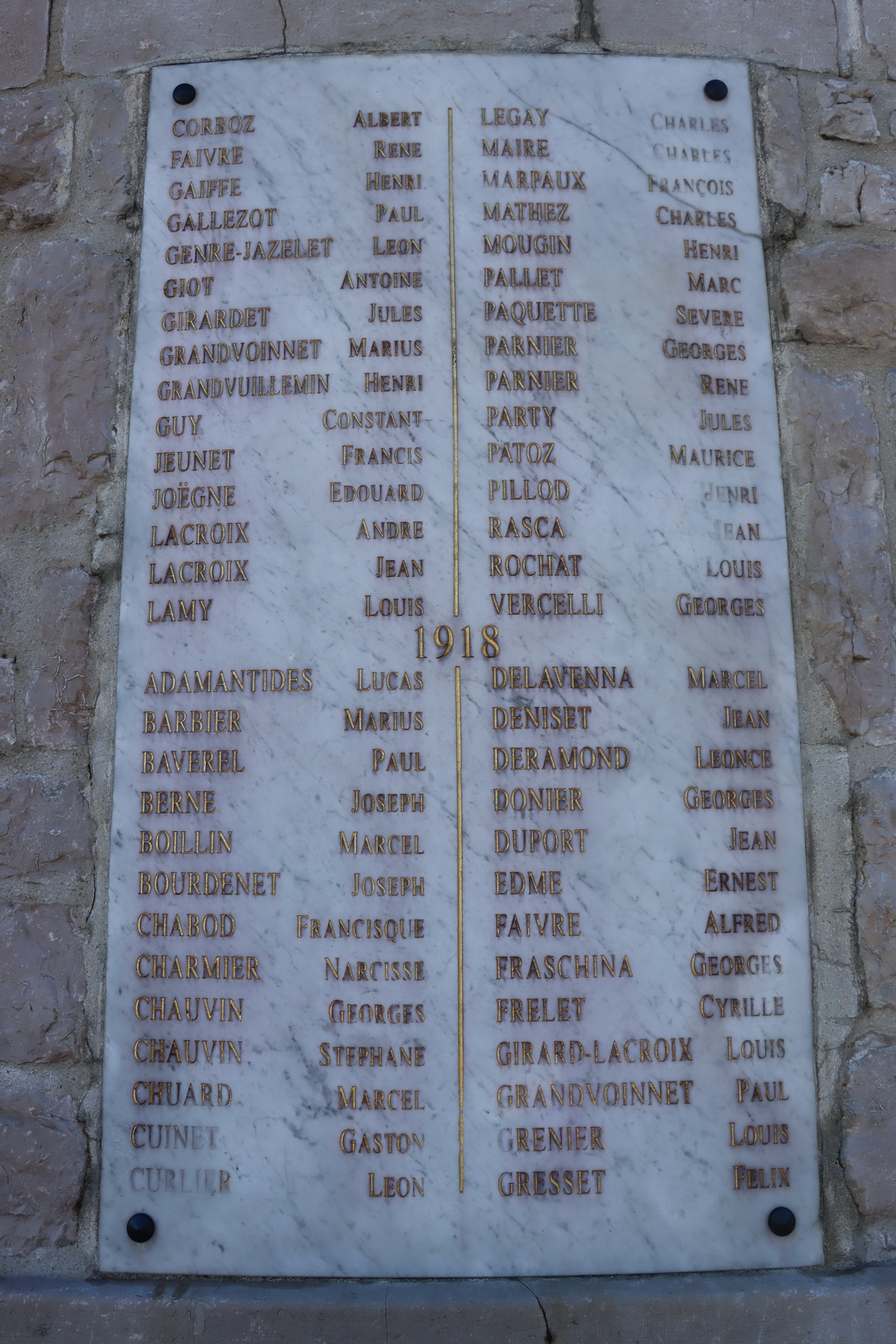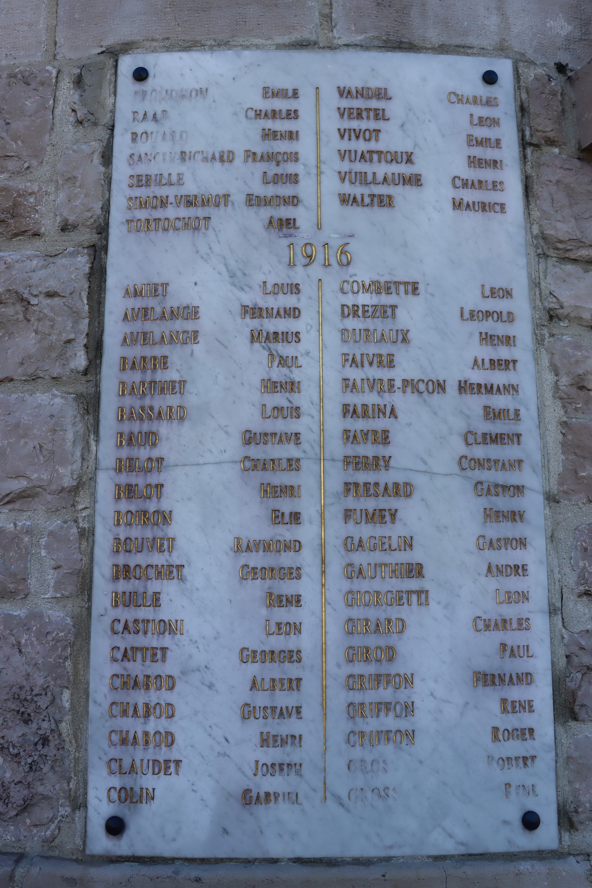 Auf dem Kriegerdenkmal sind 508 Namen von zivilen und militärischen Kriegsopfer aufgelistet, davon sind 192 mit Fabian Coulot verwandt.
