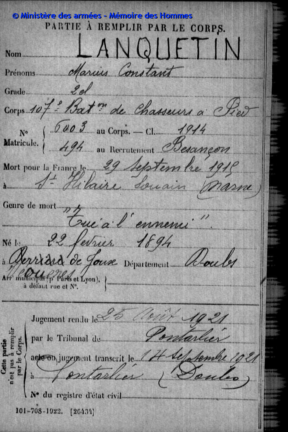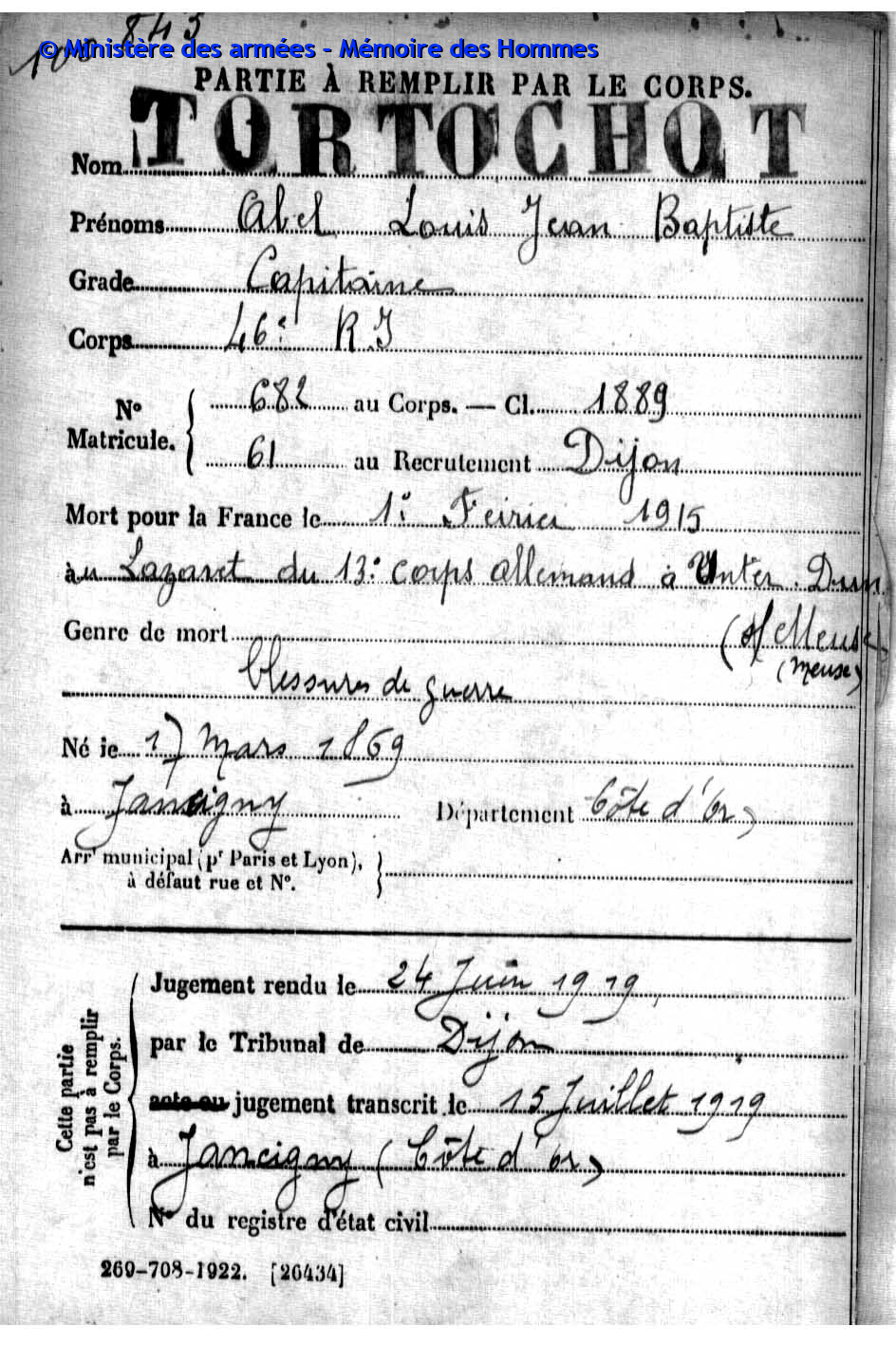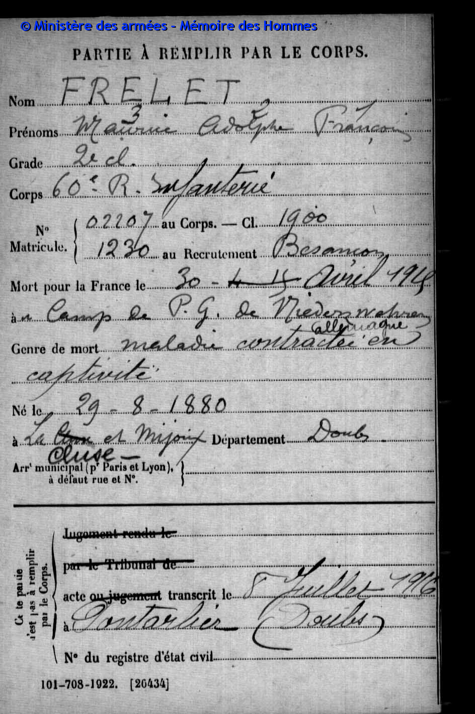 | Soldat CHAPUIS Emile Eugène 19.10.1879 - 02.05.1930 42ème Régiment d'Infanterie Verstarb zu Hause in Andelot-en-Montagne an Spätfolgen der deutschen Kriegsgefangenschaft (26.12.1914-19.01.1919) |