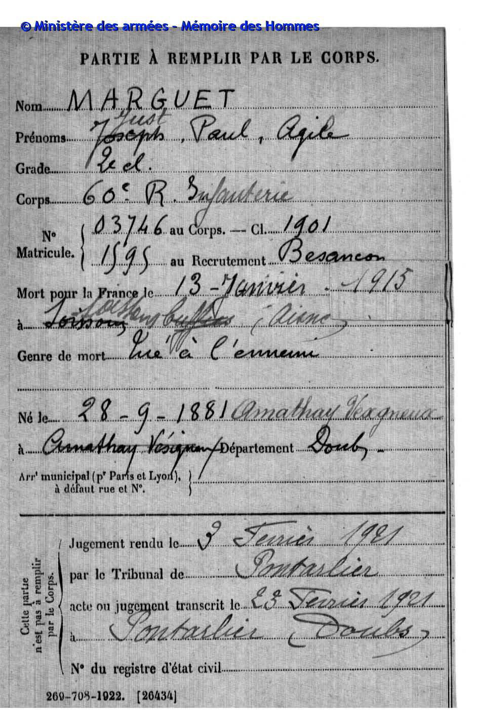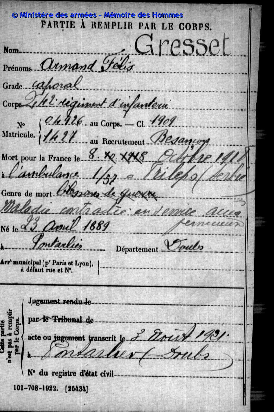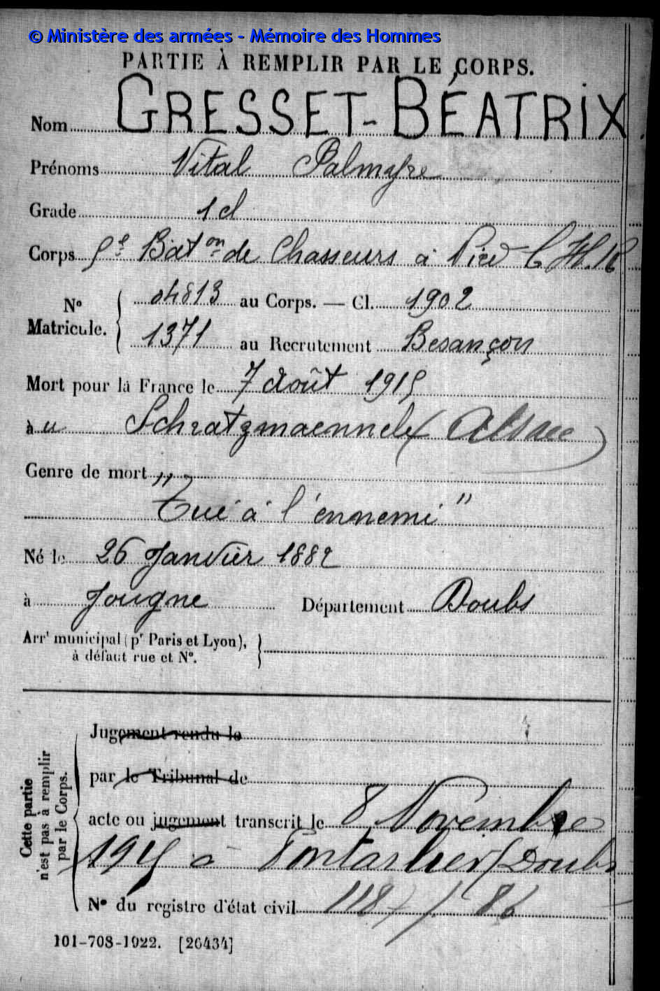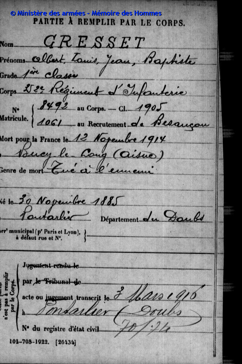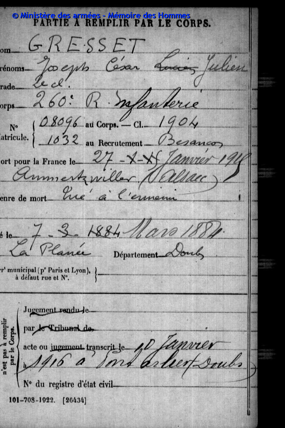 | Soldat GRESSET Joseph César Julien 07.03.1884 - 27.01.1915 260ème Régiment d'Infanterie Gefallen auf dem Hartmannsweilerkopf (F) |