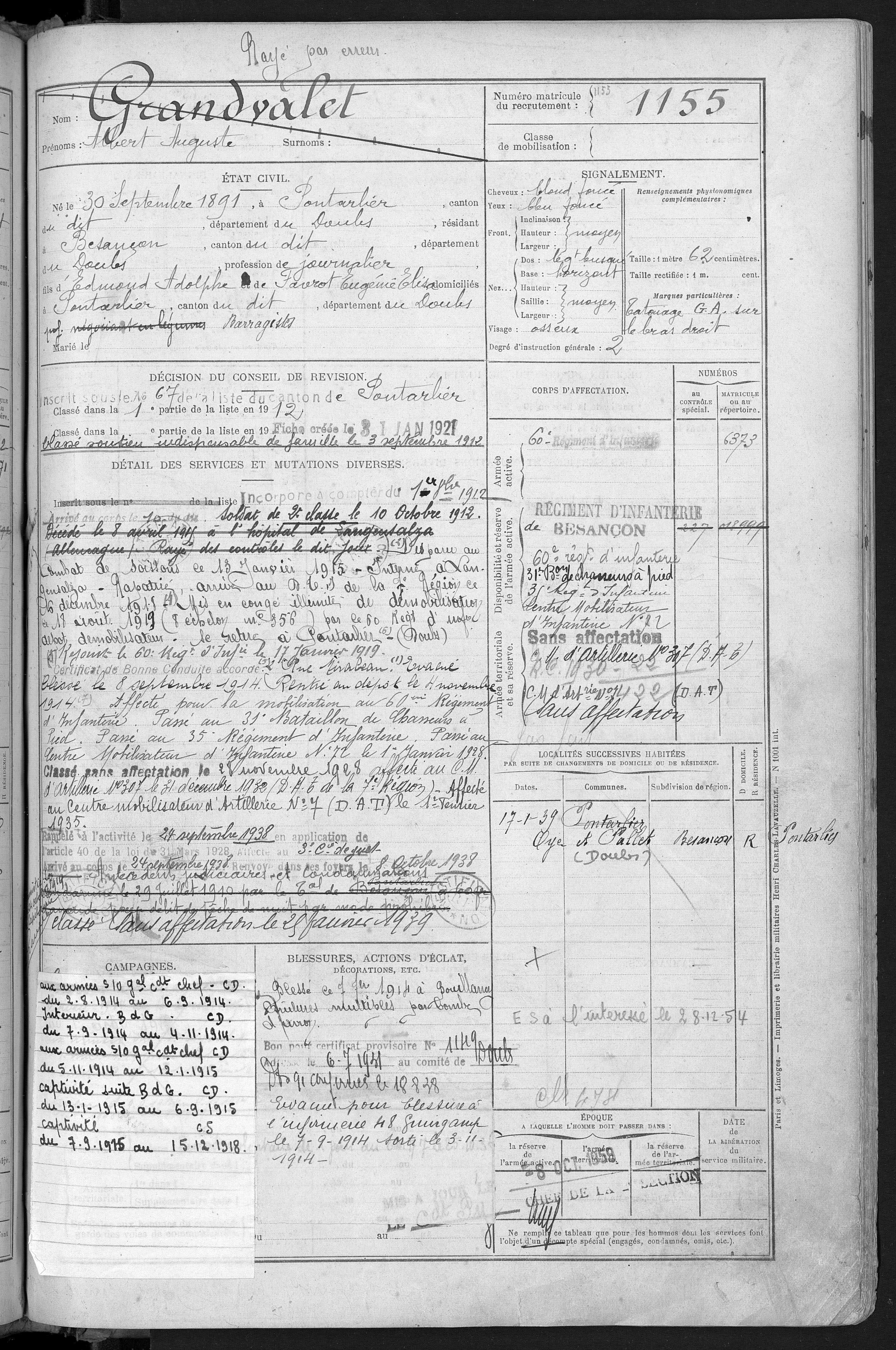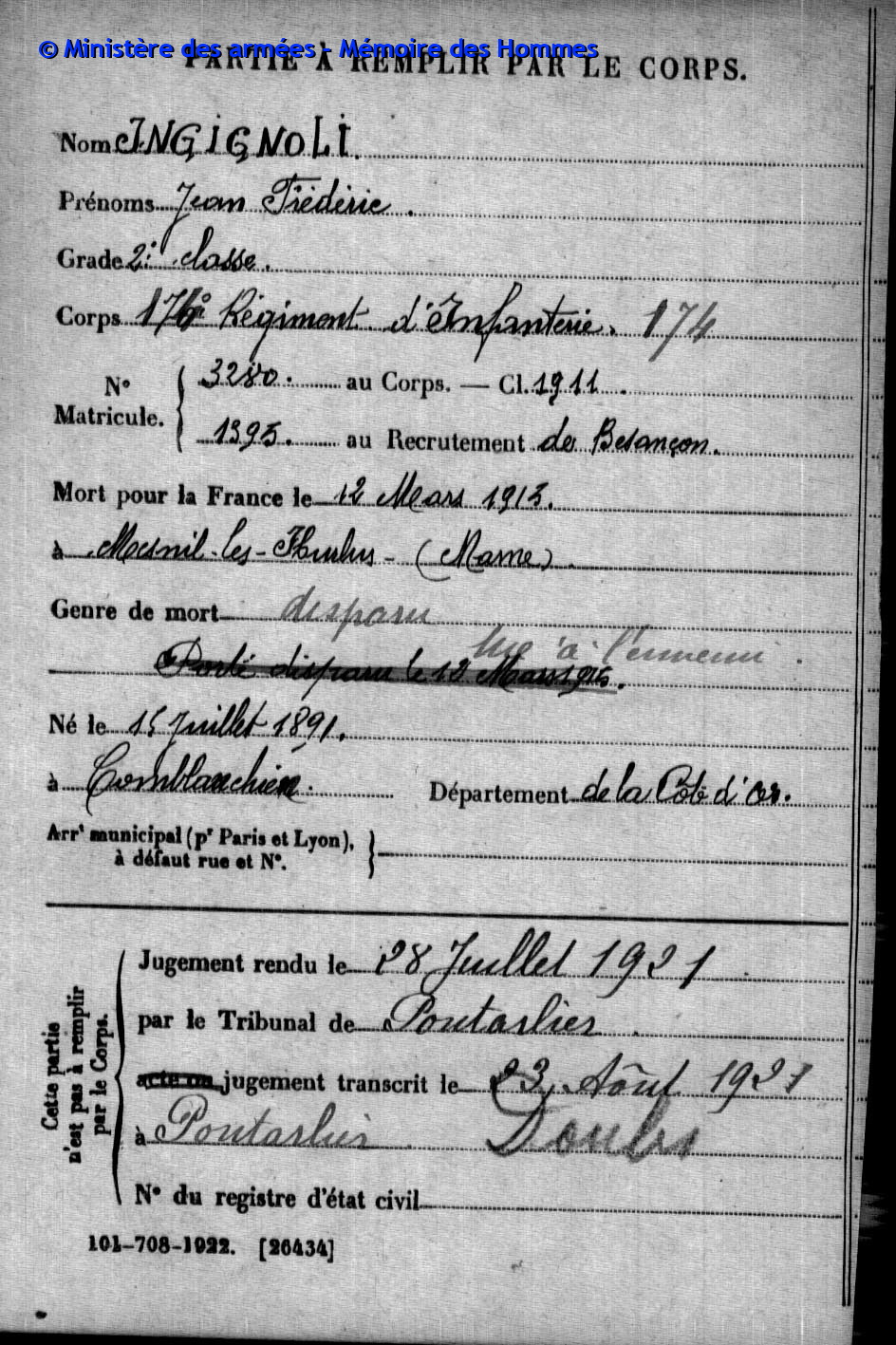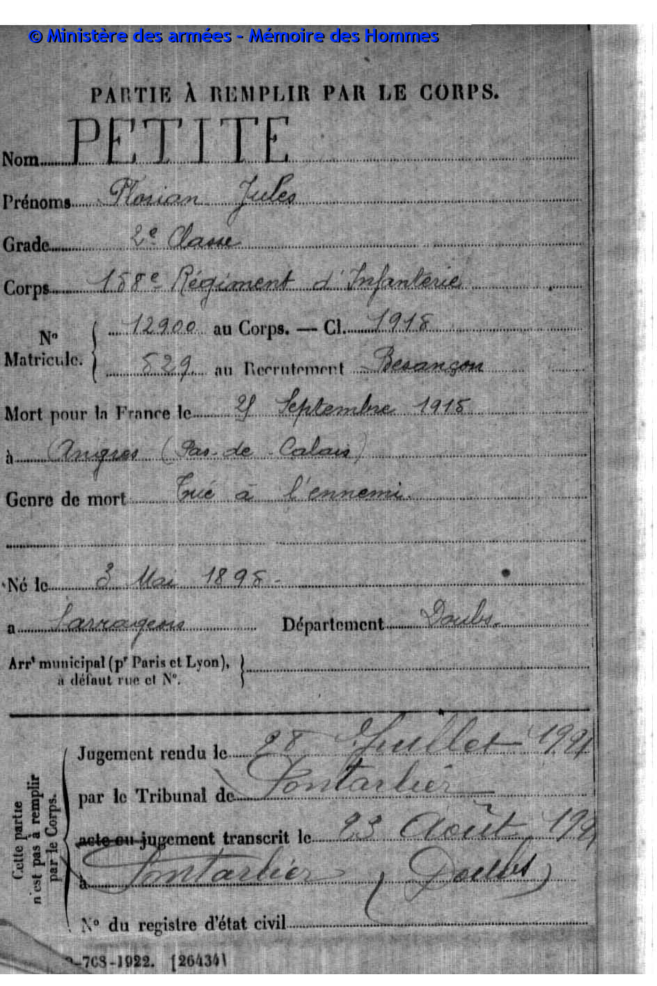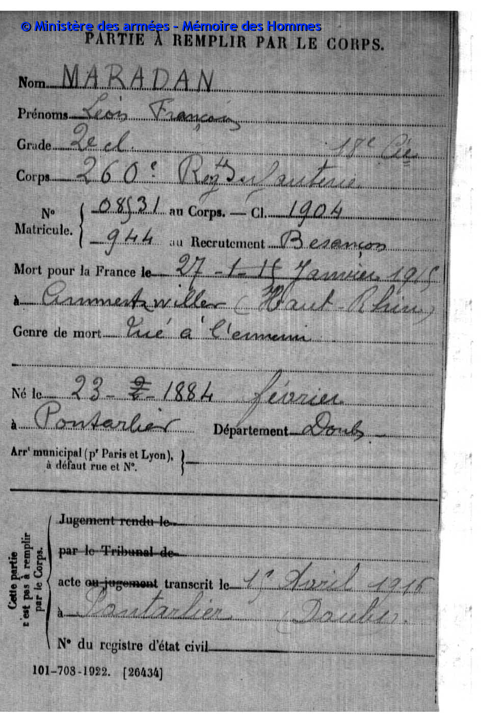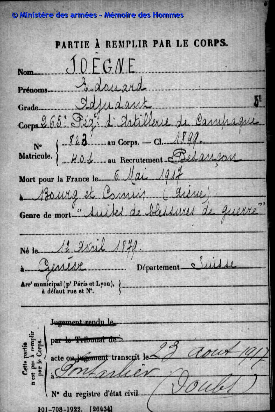| Soldat GRESSET Joseph César Julien 07.03.1884 - 27.01.1915 260ème Régiment d'Infanterie Gefallen auf dem Hartmannsweilerkopf (F) |
