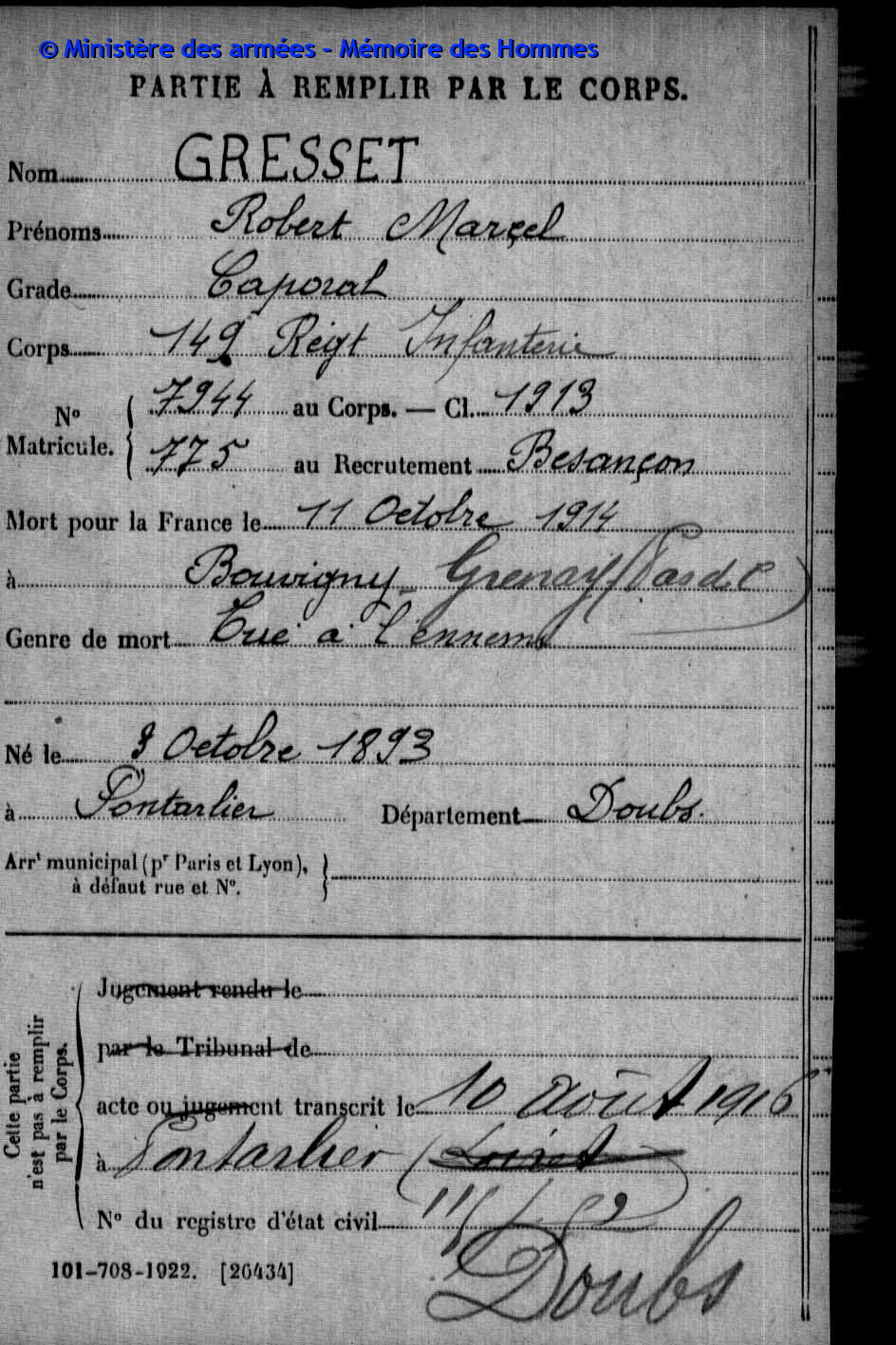| Caporal GRESSET Robert Marcel 03.10.1893 - 11.10.1914 149ème Régiment d'Infanterie Gefallen in Grenay - Pas-de-Calais (F) |