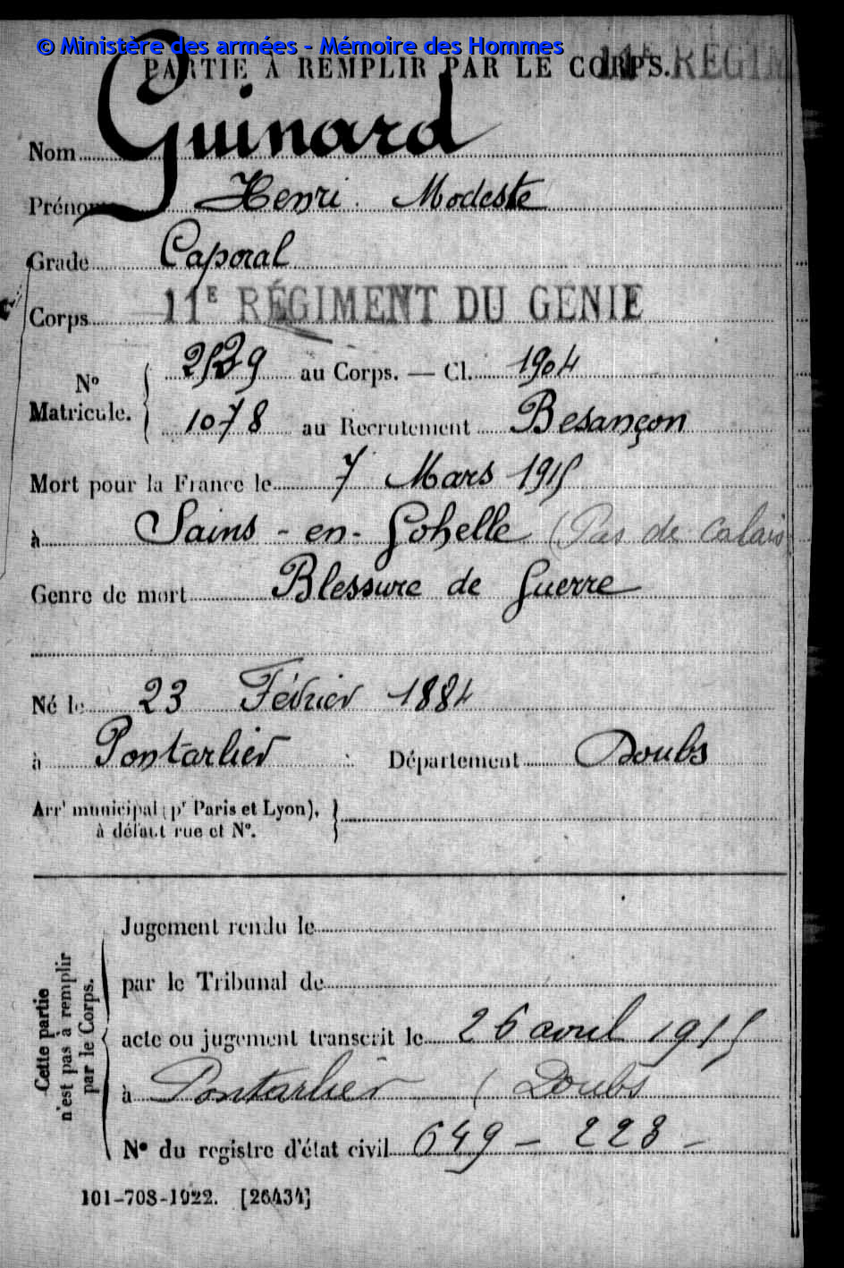 Canonnier GUINARD René Célestin Louis Aimable 12.09.1913 - 17.06.1940 170ème Régiment d'Artillerie de Position Verstarb in Granges-Narboz (F) |