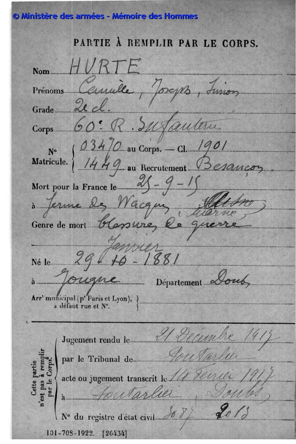 | Soldat HURTE Marcel Léon Charles 13.04.1907 - 30.07.1940 15ème Régiment du Génie Gefallen in Chaux-les-Porte (F) |