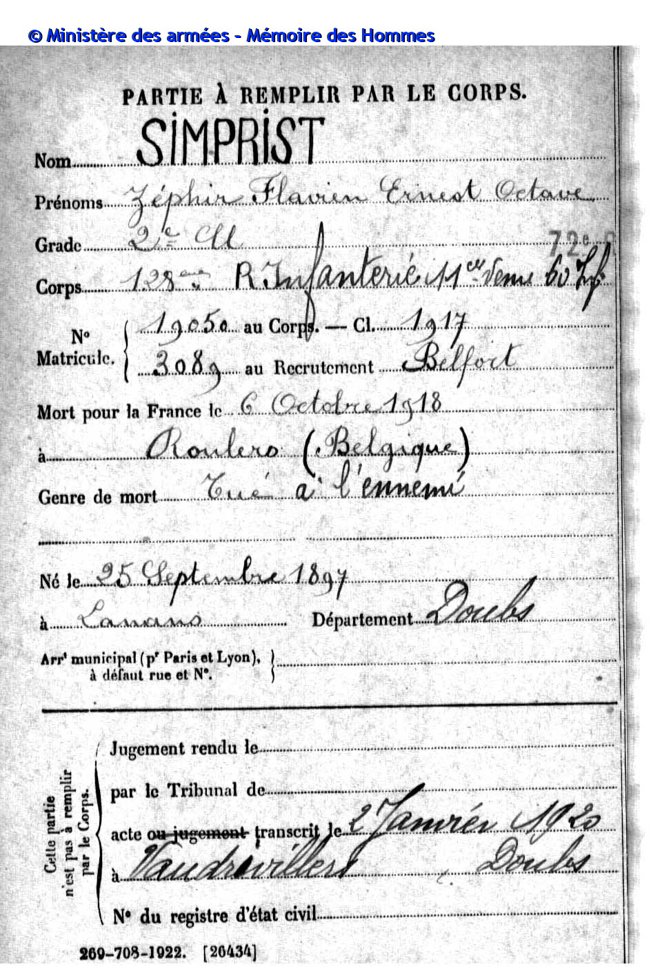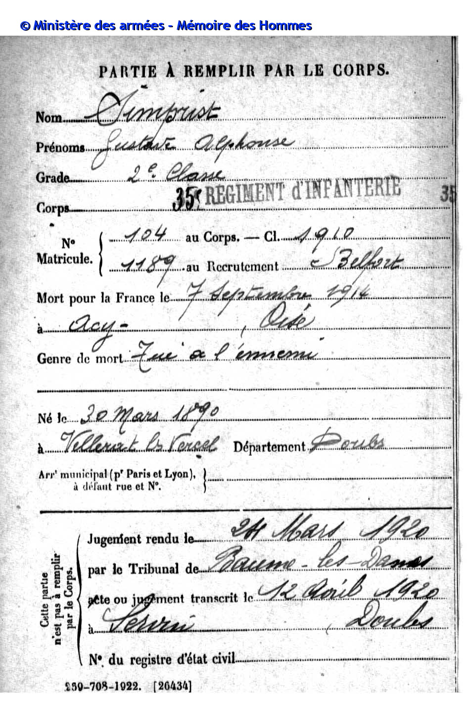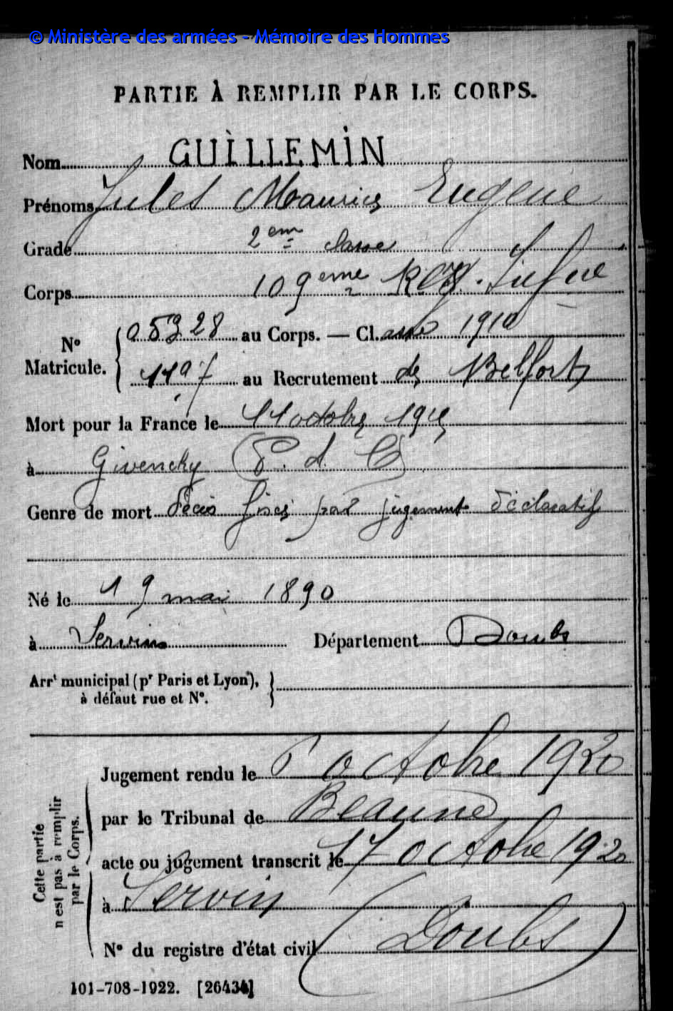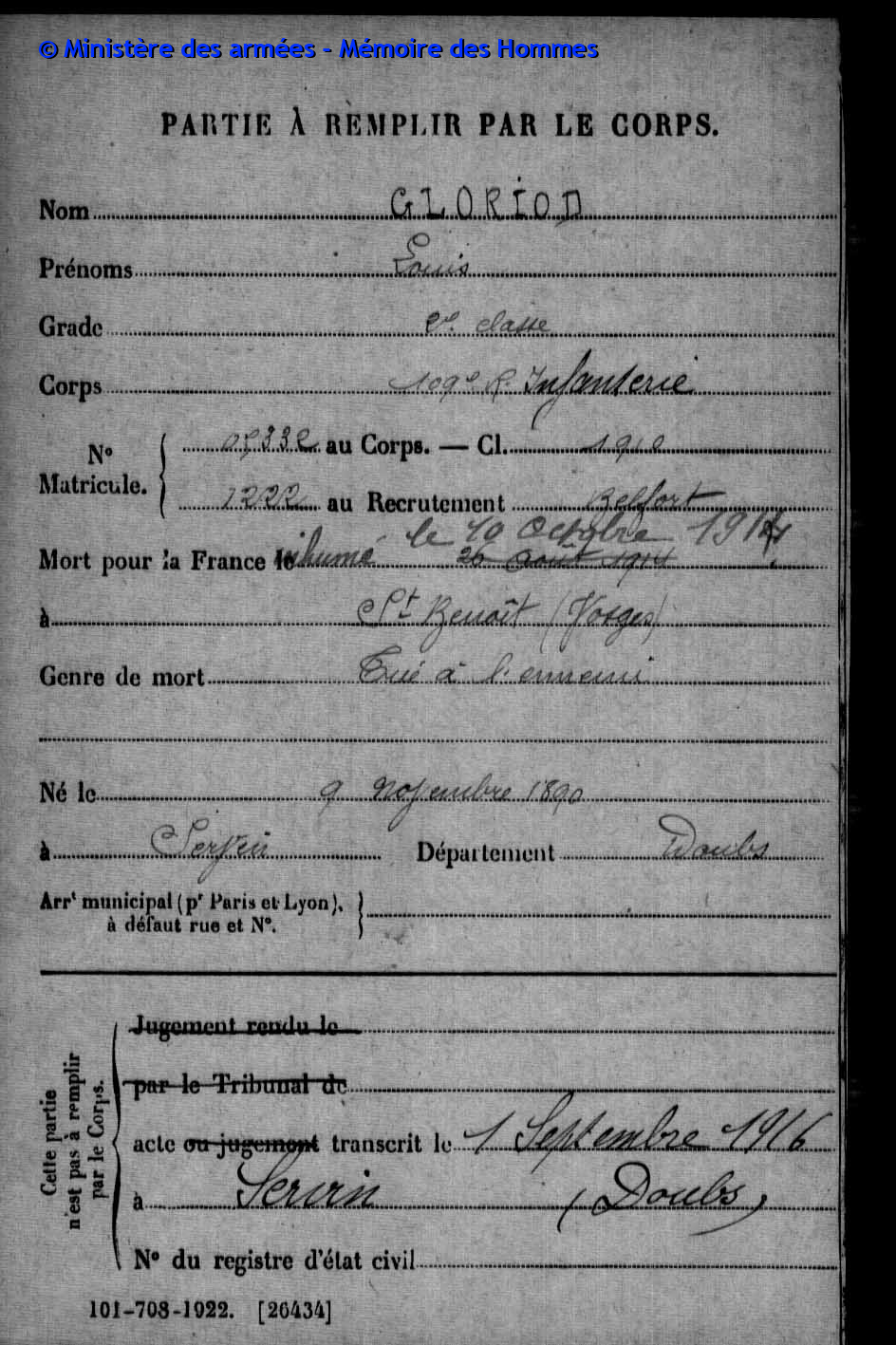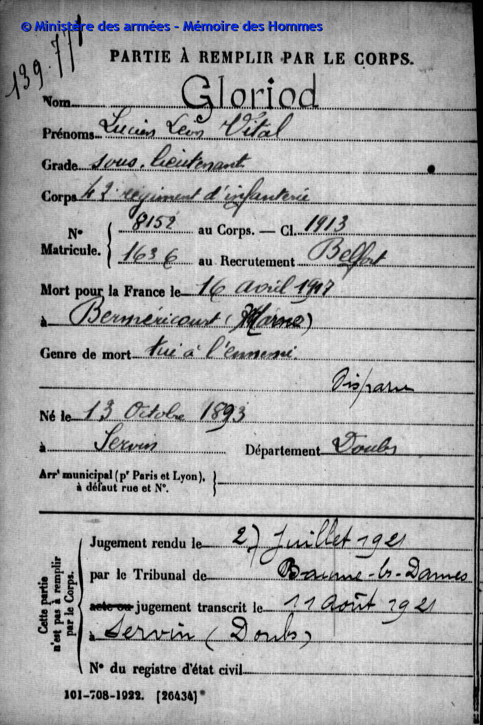 Sous-Lieutenant GLORIOD Lucien Léon Vital 13.10.1893 - 16.04.1917 42ème Régiment d'Infanterie Gefallen in Berméricourt - Marne (F) |