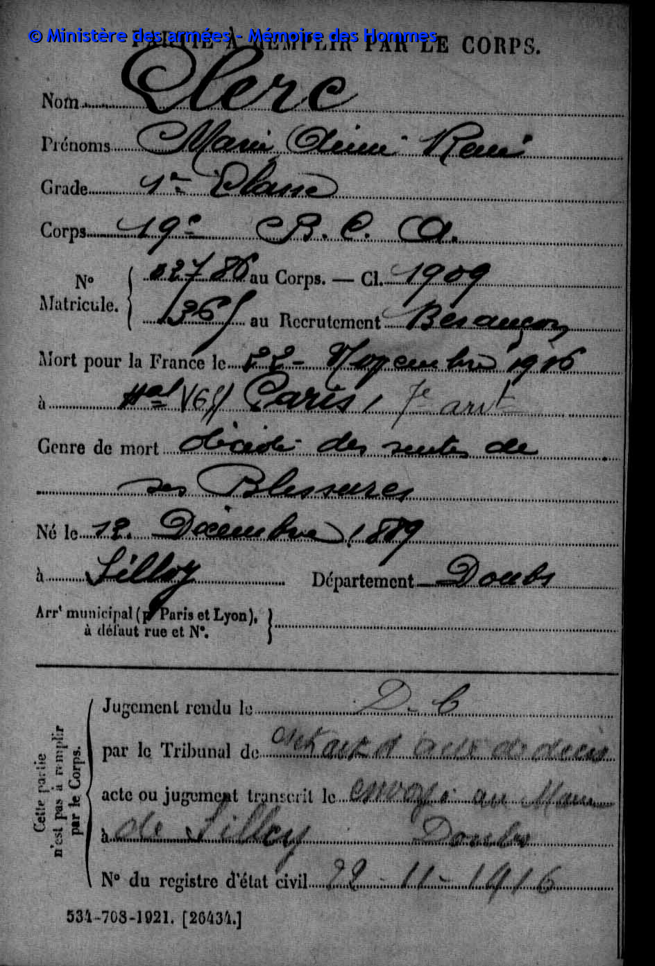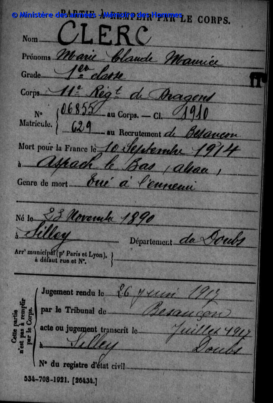 1ère classe CLERC Marie Claude Maurice 23.11.1890 - 10.09.1914 11ème Régiment de Dragons Gefallen in Aspach-le-Bas im Elsass (F) |
