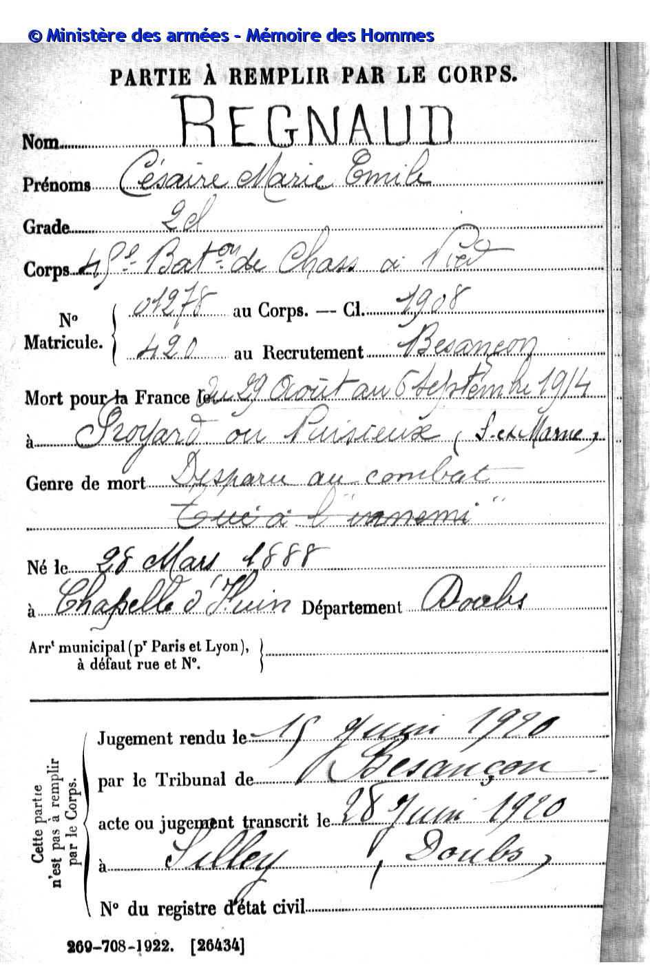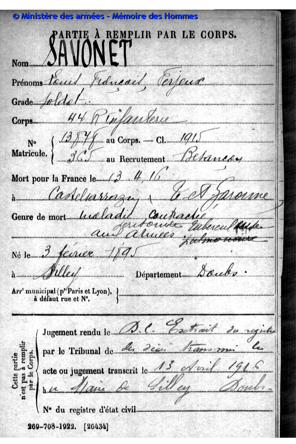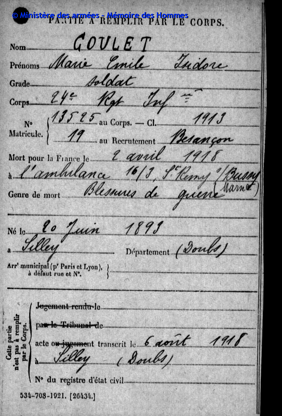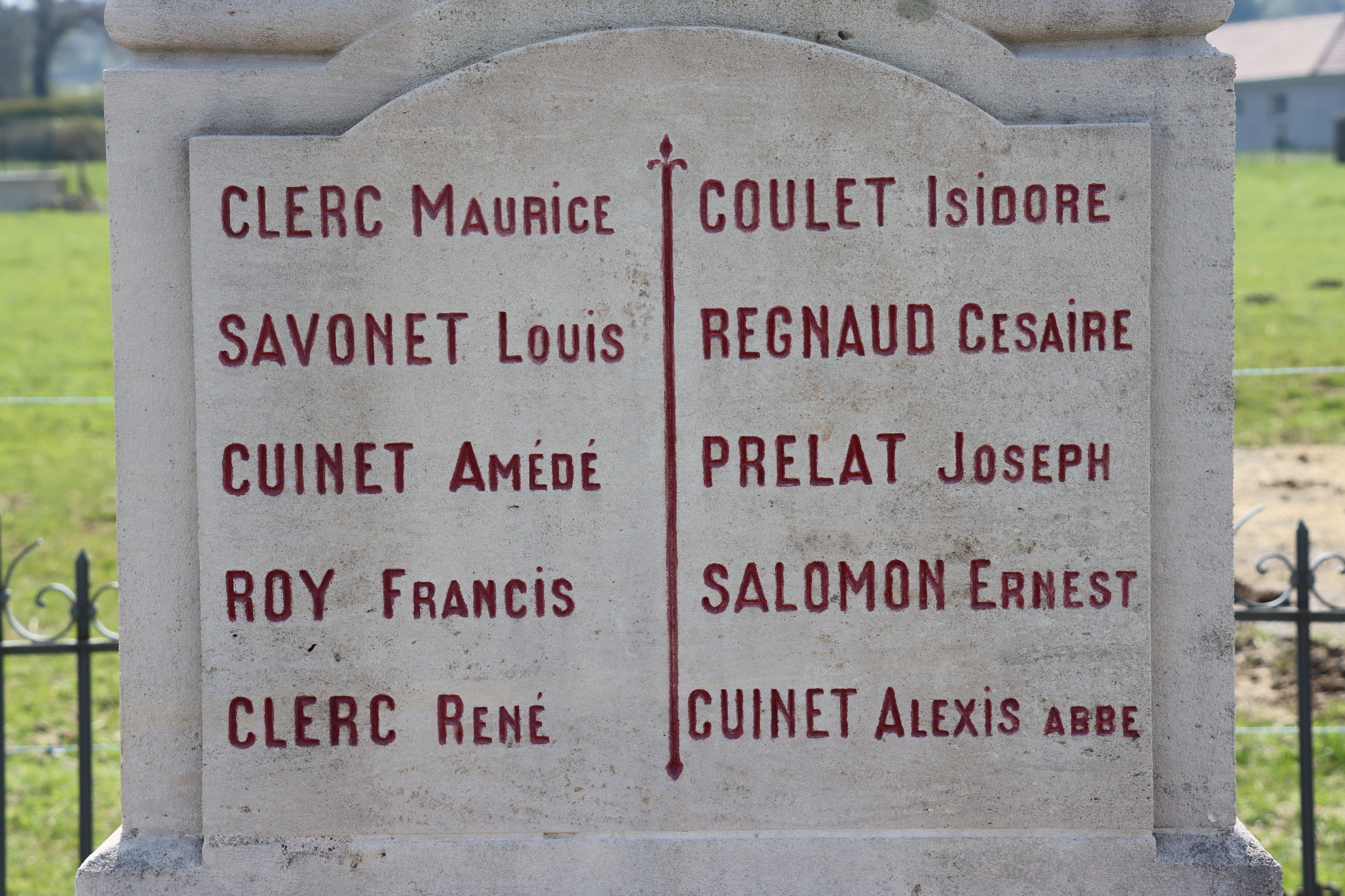 Die 5,22 Km2 kleine Gemeinde mit 144 Einwohner im Departement Doubs (F) verzeichnet auf seinen Kriegerdenkmal 10 Namen von gefallenen Soldaten, davon sind alle 10 mit Fabian Coulot verwandt.